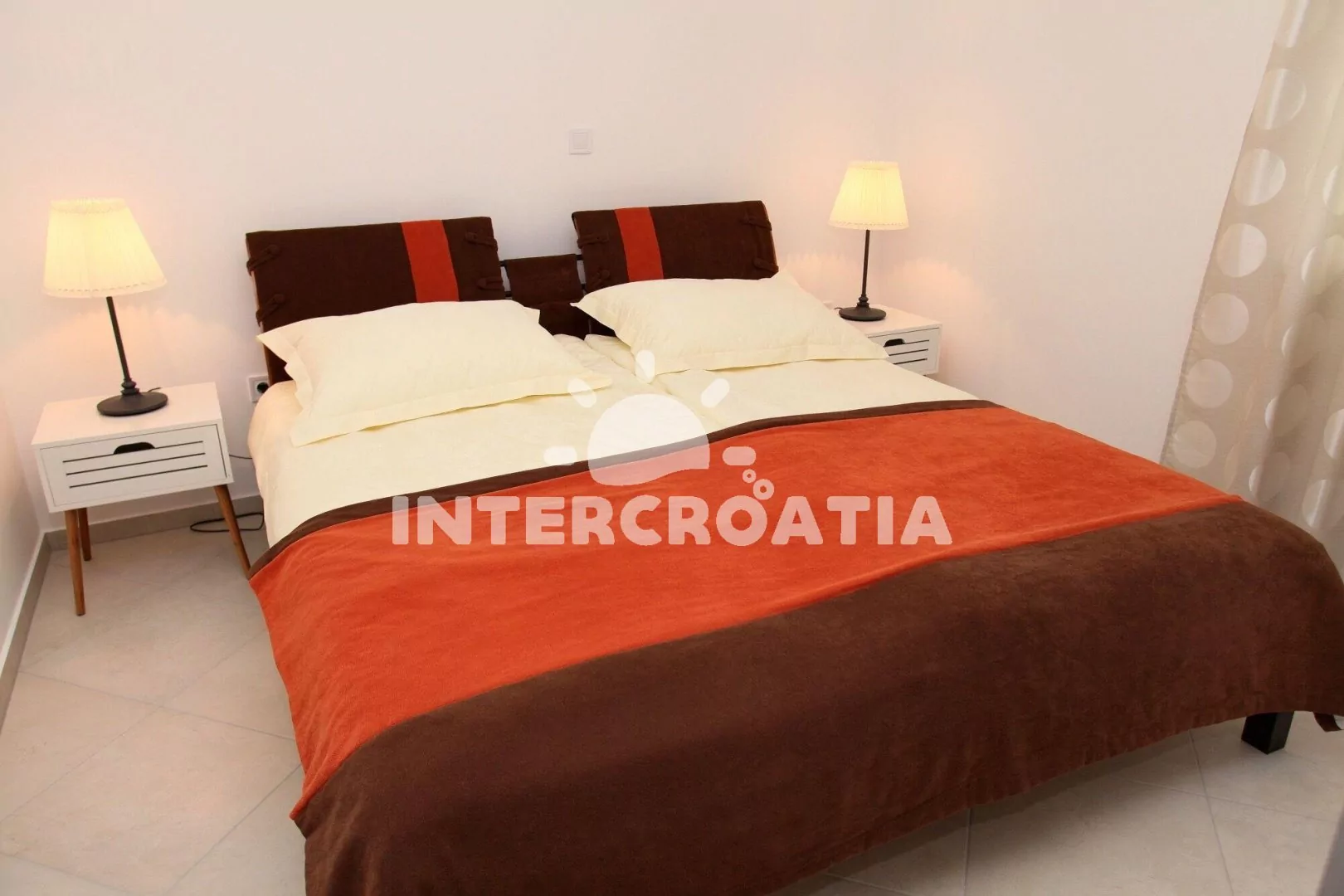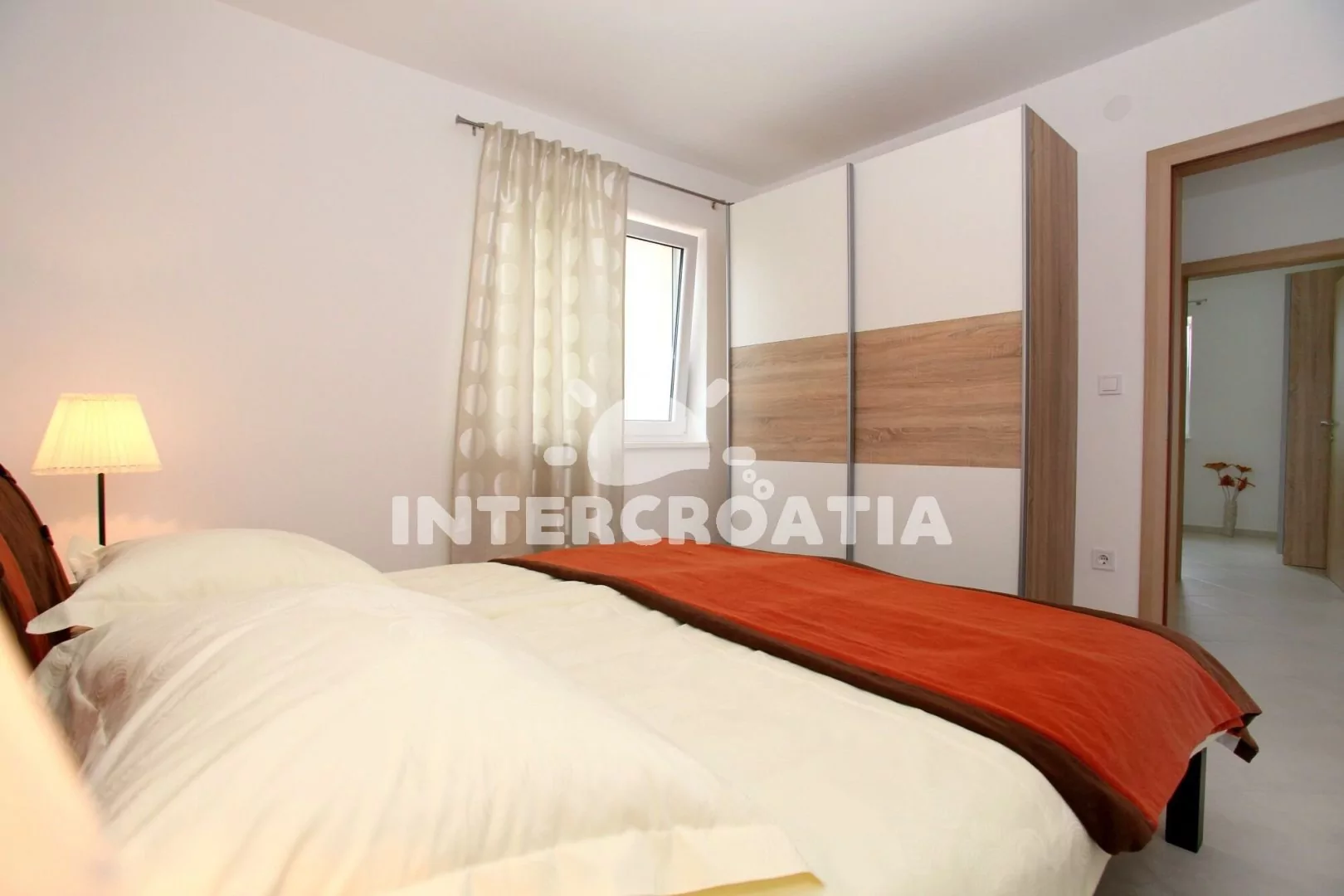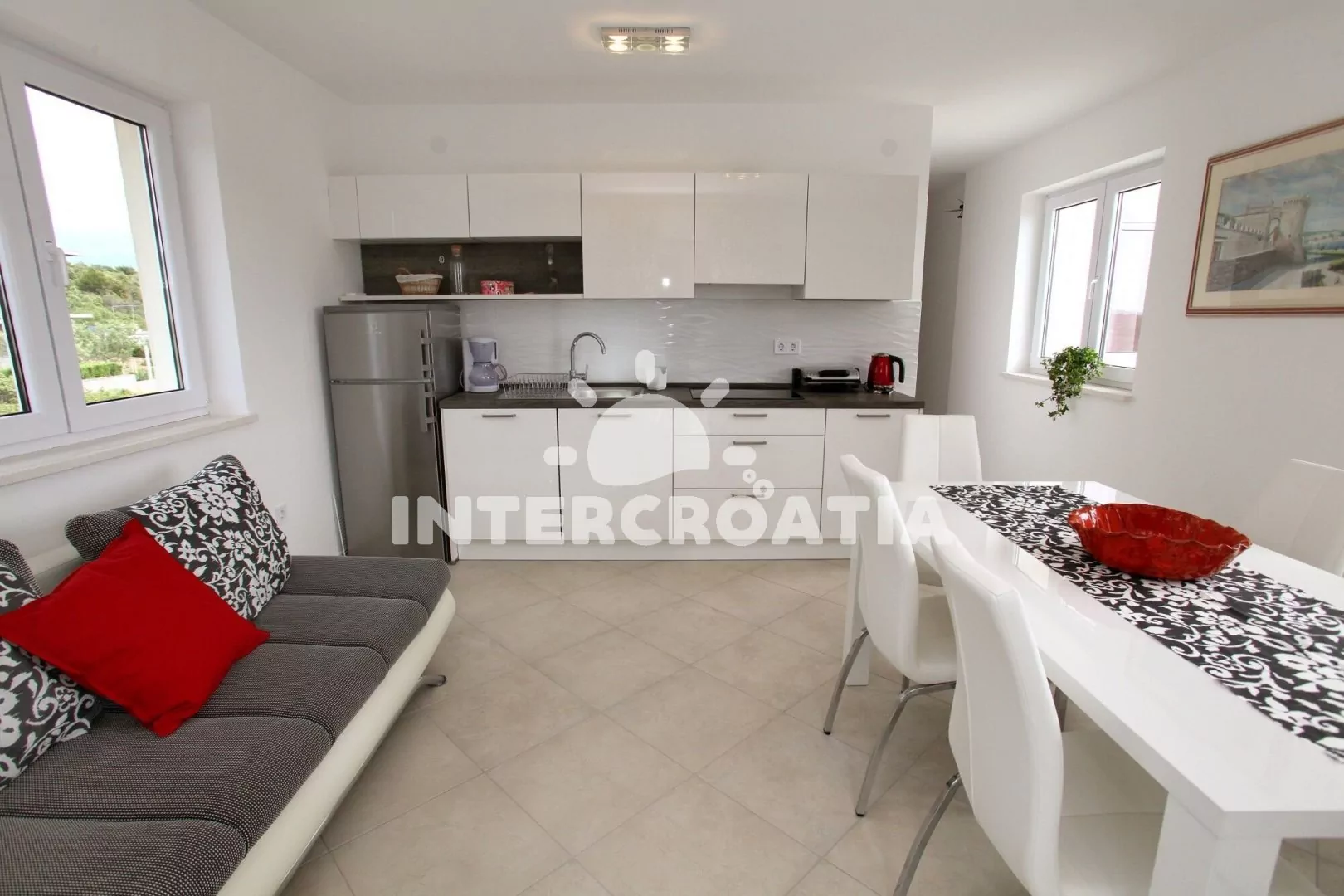 Apartmán (50 m2) s vlastní terasou a výhledem na moře se nachází v 1. patře vily. Apartmán má 2 ložnice a je vhodný pro 4 až 6 osob. Obývací pokoj je spojený s kuchyní. Kuchyňská linka je vybavena varnou deskou, rychlovarnou konvicí, kávovarem, myčkou na nádobí, nádobím a lednicí s mrazákem. Obývací pokoj s jídelním stolem pro 6 osob, pohovkou (rozložitelná na extra lůžko pro 2 osoby), televizí se satelitním programem, klimatizací a vstupem na terasu. První ložnice s dvoulůžkem. Druhá ložnice s dvěma jednolůžky. Koupelna se sprchovým koutem, umyvadlem, fénem a wc. Hostům je k dispozici parkování u objektu zdarma.