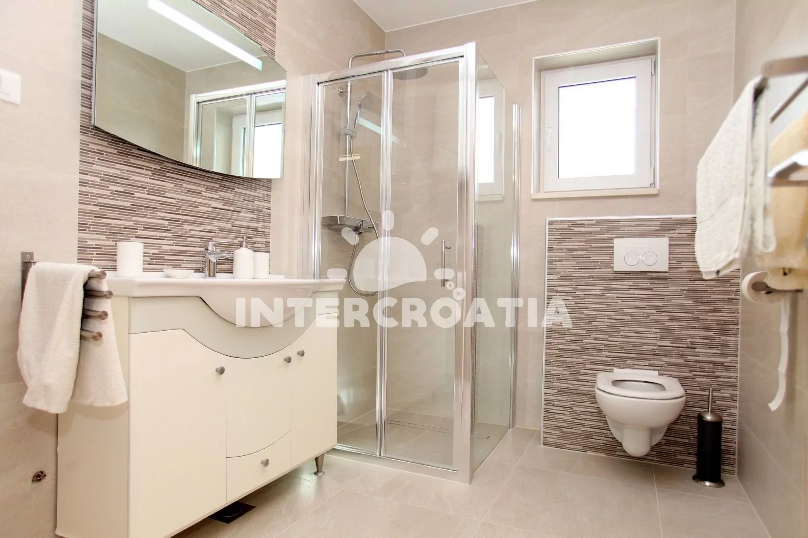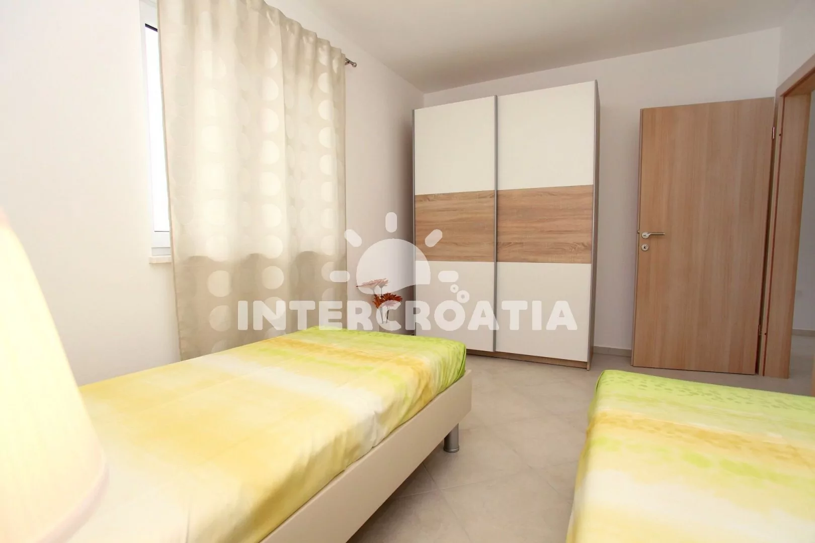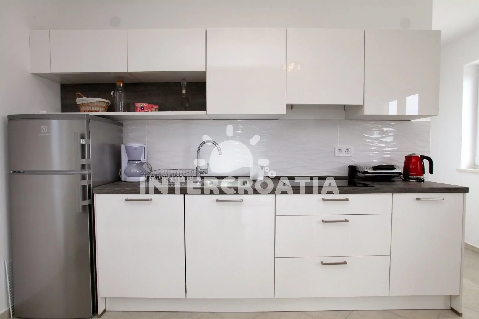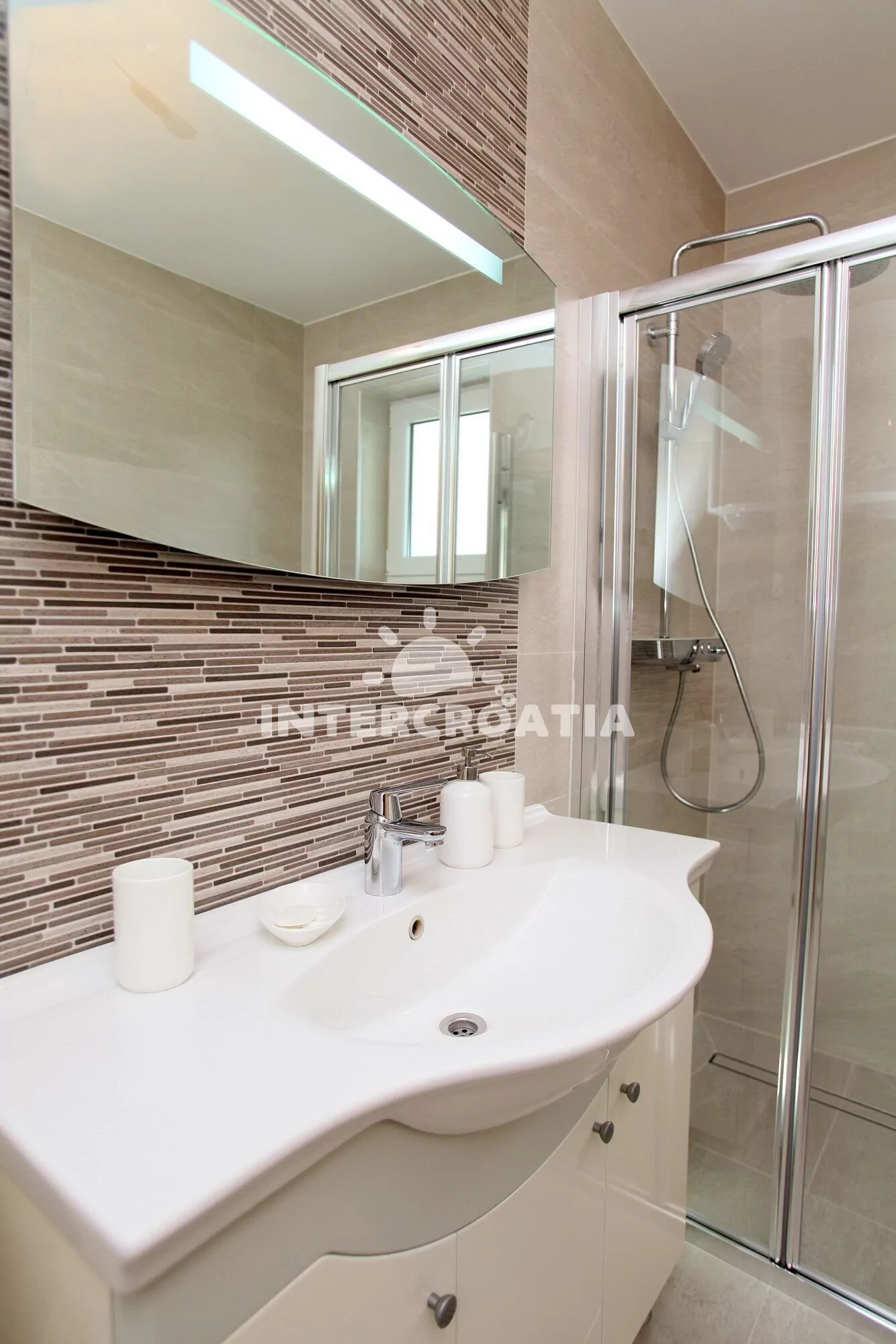 Apartmán (50 m2) s vlastní terasou a výhledem na moře se nachází v 1. patře vily. Apartmán má 2 ložnice a je vhodný pro 4 až 6 osob. Obývací pokoj je spojený s kuchyní. Kuchyňská linka je vybavena varnou deskou, rychlovarnou konvicí, kávovarem, myčkou na nádobí, nádobím a lednicí s mrazákem. Obývací pokoj s jídelním stolem pro 6 osob, pohovkou (rozložitelná na extra lůžko pro 2 osoby), televizí se satelitním programem, klimatizací a vstupem na terasu. První ložnice s dvoulůžkem. Druhá ložnice s dvěma jednolůžky. Koupelna se sprchovým koutem, umyvadlem, fénem a wc. Hostům je k dispozici parkování u objektu zdarma.