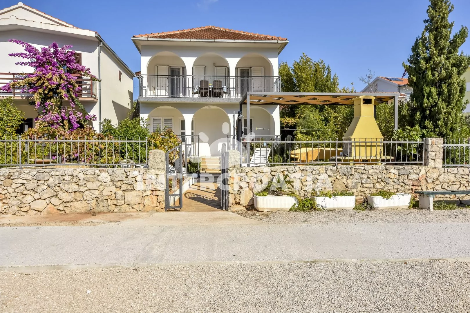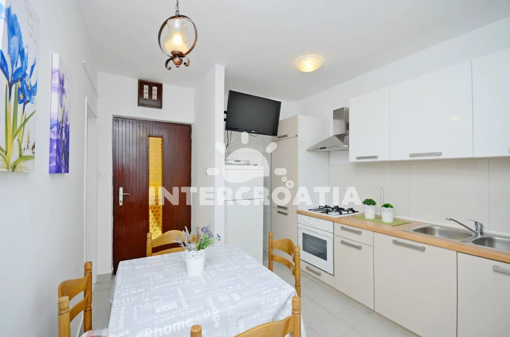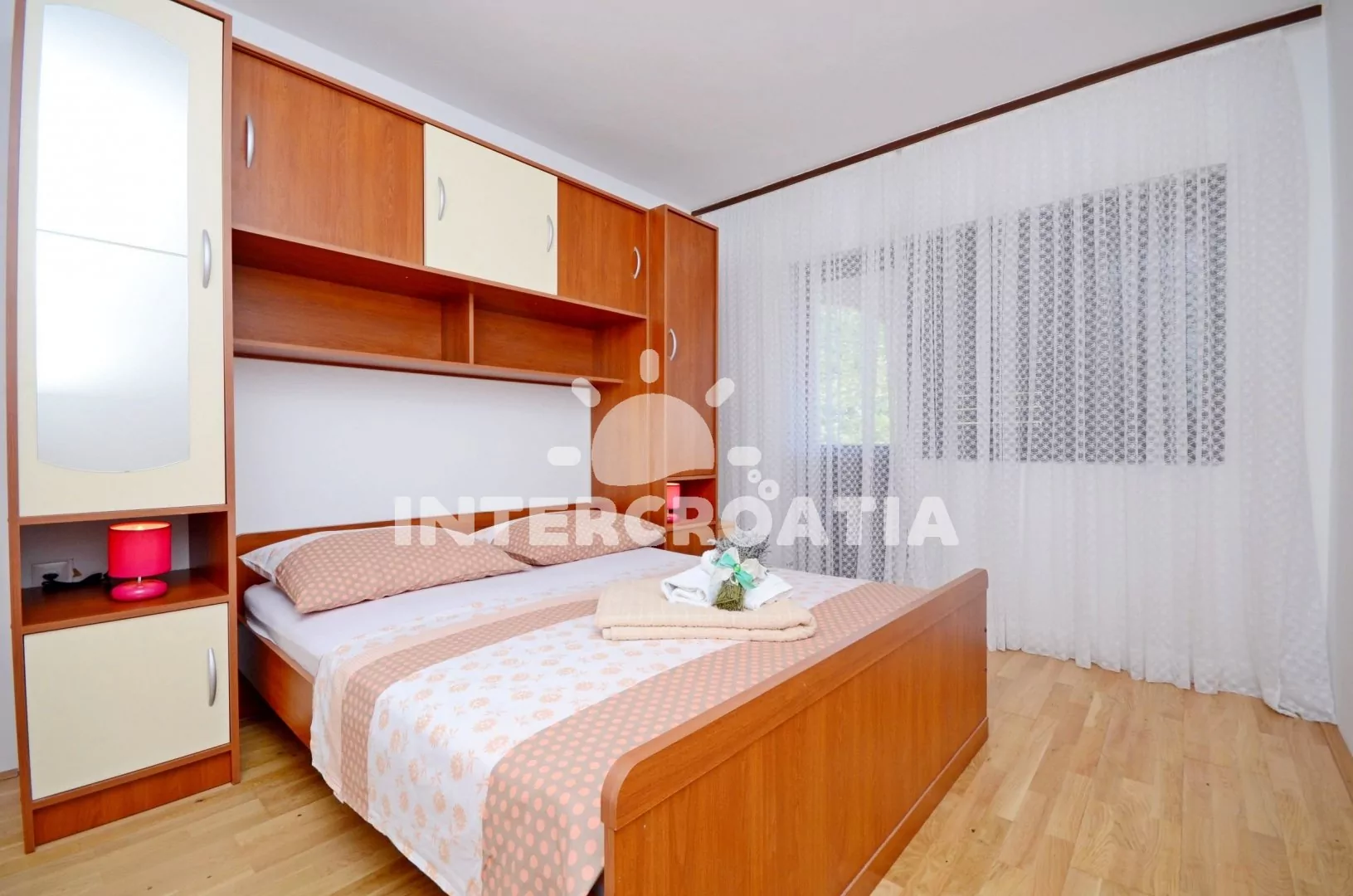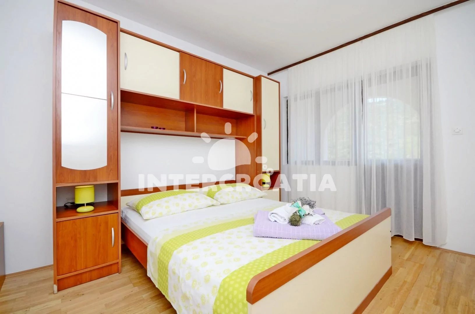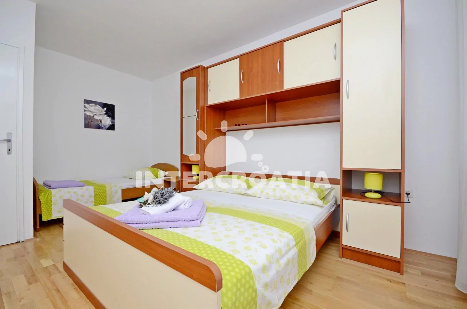 Apartmán (60 m2) s terasou a výhledem na moře se nachází v 1. patře domu. Apartmán má 2 ložnice a je vhodný pro až 5 osob. Obývací místnost je spojena s kuchyní. Kuchyňská linka je vybavena varnou deskou, digestoří, vestavěnou troubou, myčkou na nádobí, nádobím a lednicí s mrazákem. Obývací místnost s jídelním stolem pro 4 osoby, televizí se satelitním programem a klimatizací. První ložnice s dvoulůžkem, přistýlkou a vstupem na terasu. Druhá ložnice s dvoulůžkem a vstupem na terasu. Koupelna se sprchovým koutem, umyvadlem a wc. Hostům je k dispozici parkování u objektu zdarma.