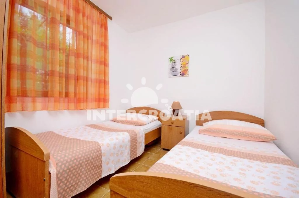 Apartmán (60 m2) s terasou a výhledem do zahrady se nachází v přízemí domu. Apartmán má 2 ložnice a je vhodný pro 4 až 5 osob. Obývací pokoj je spojený s kuchyní. Kuchyňská linka je vybavena varnou deskou, digestoří, vestavěnou troubou, myčkou na nádobí, nádobím a lednicí s mrazákem. Obývací pokoj s jídelním stolem pro 5 osob, rohovou pohovkou, televizí se satelitním programem a klimatizací. První ložnice s dvoulůžkem a přistýlkou. Druhá ložnice s dvěma jednolůžky. Koupelna se sprchovým koutem, umyvadlem a wc. Hostům je k dispozici parkování u objektu zdarma.