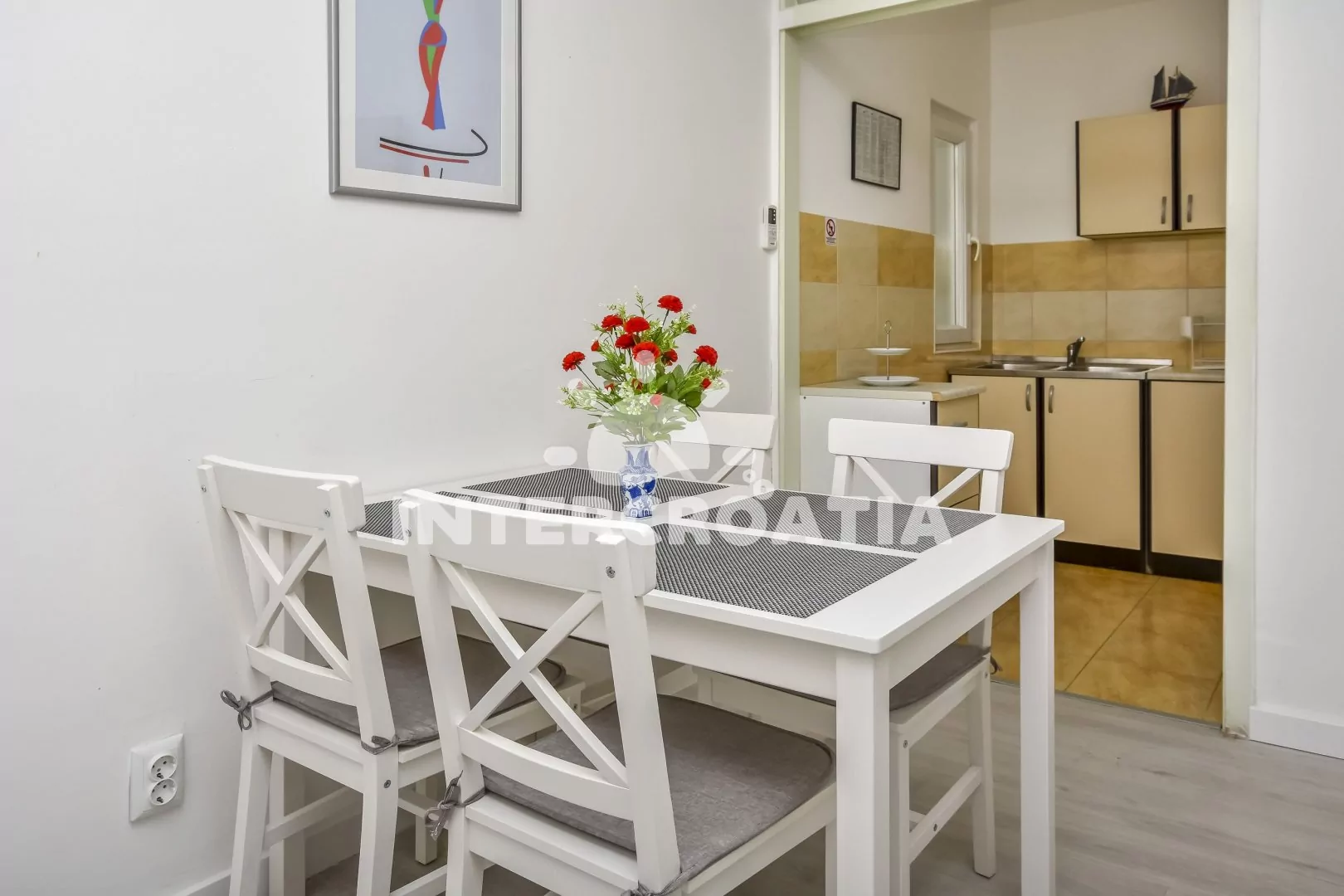 Vkusně zařízený dům s dvěma apartmány se nachází pouze 40 m od oblázkové pláže a moře. Apartmány jsou klimatizované a disponují lodžiemi s venkovním posezením. U domu pozemek s parkovacími místy pro automobily.