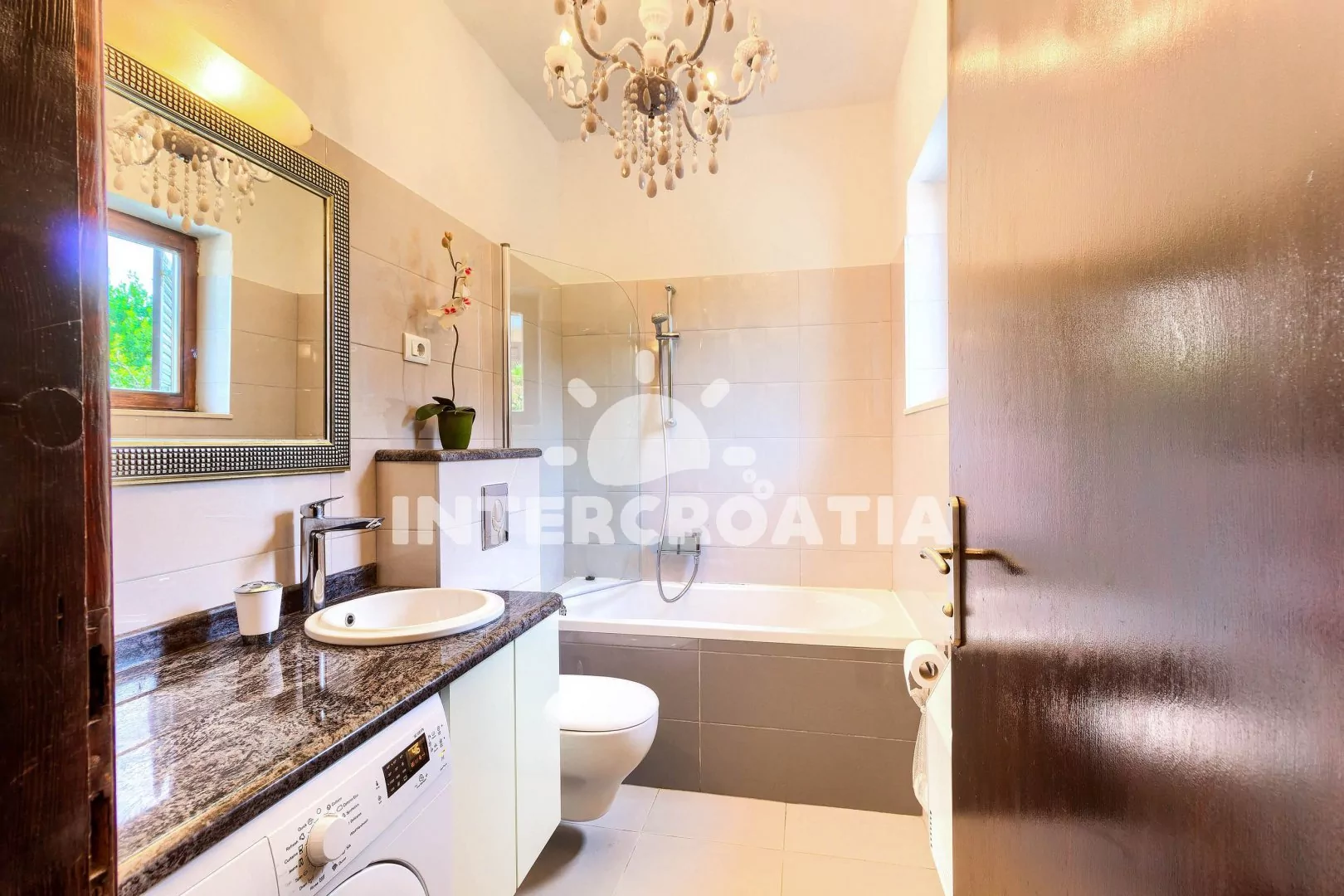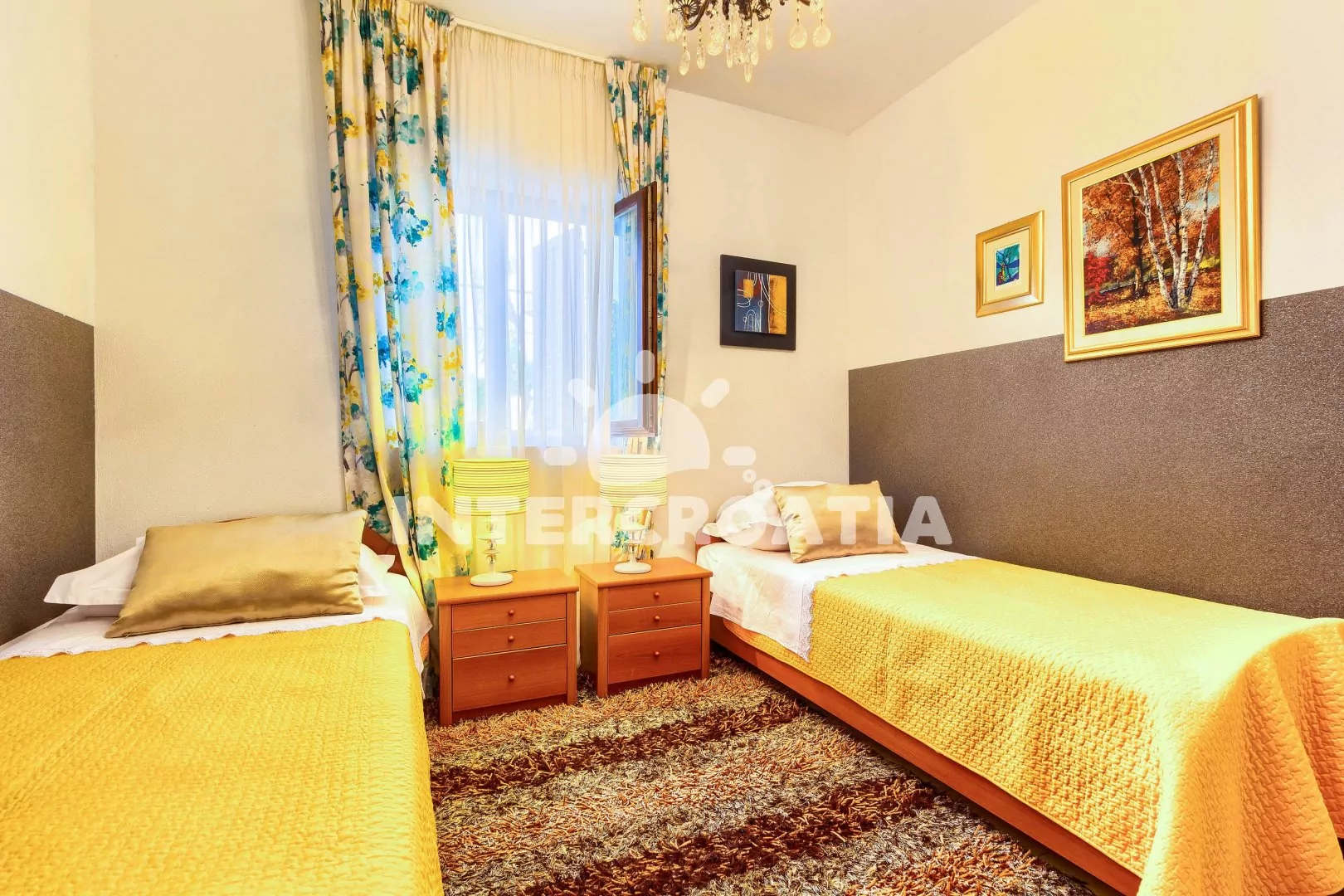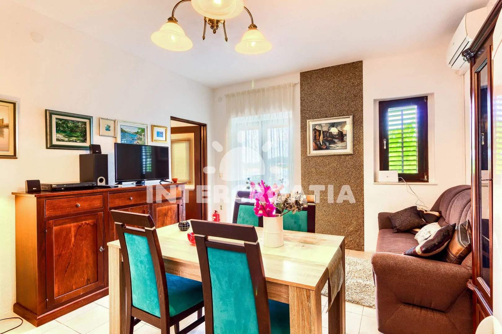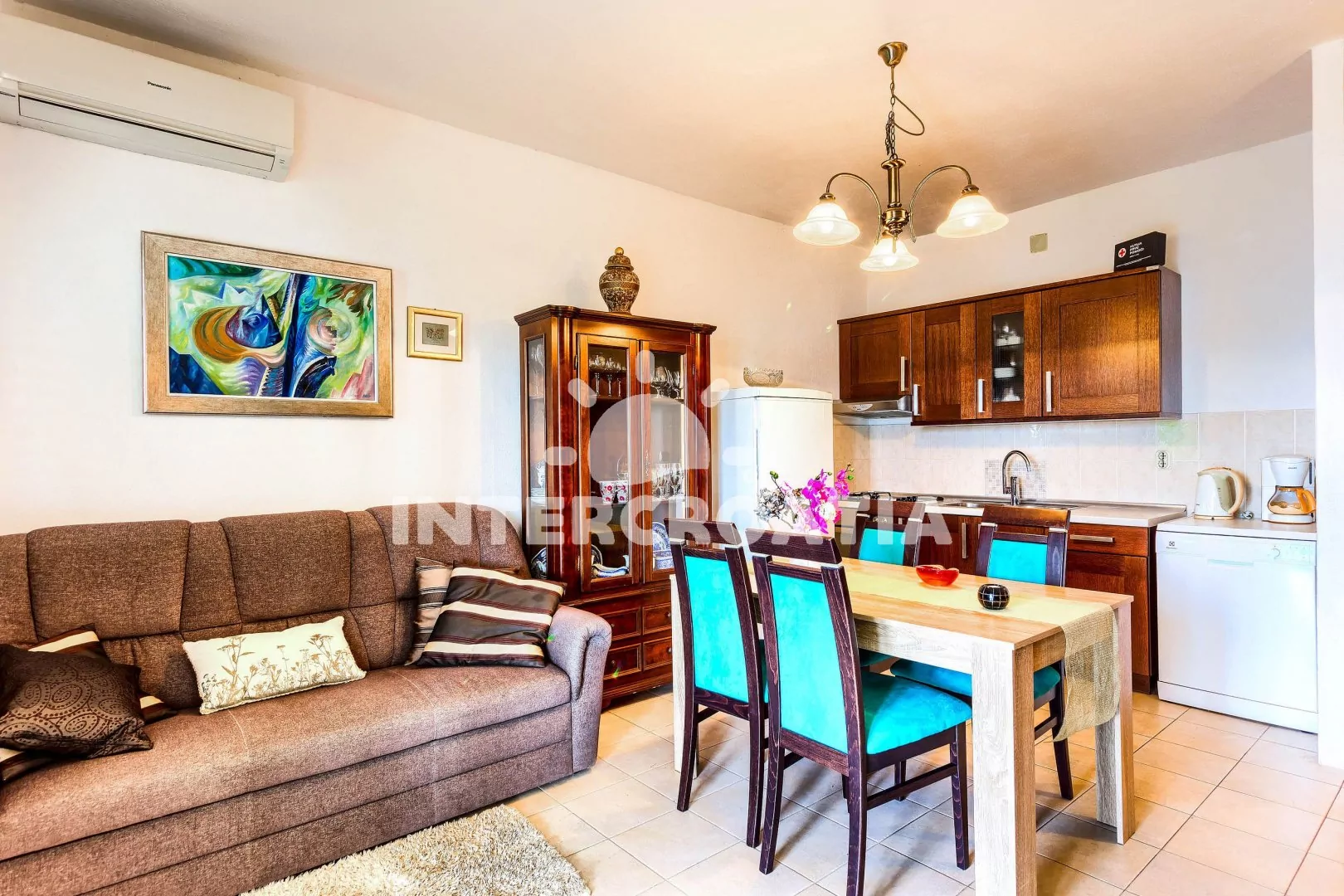 Apartmán (50 m2) s terasou, posezením a výhledem na moře se nachází v přízemí domu. Apartmán má 2 ložnice a je vhodný pro 4 až 6 osob. Obývací pokoj je spojený s kuchyní. Kuchyňská linka je vybavena varnou deskou, digestoří, vestavěnou troubou, myčkou na nádobí, rychlovarnou konvicí, kávovarem, toustovačem, nádobím a lednicí s mrazákem, na požádání mikrovlnná trouba. Obývací pokoj s jídelním stolem pro 4 osoby, pohovkou (rozložitelná na extra lůžko pro 2 osoby), televizí se satelitním programem, DVD přehrávačem a klimatizací. První ložnice s dvoulůžkem. Druhá ložnice s dvěma jednolůžky. Koupelna s vanou, sprchovou zástěnou, umyvadlem, pračkou a wc. Hostům je k dispozici parkování u objektu zdarma.