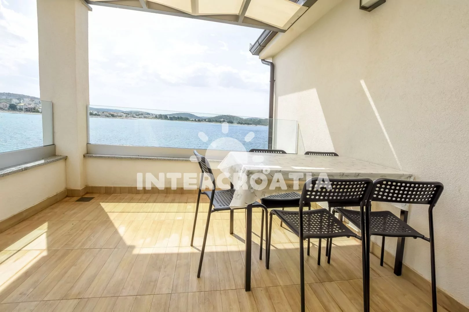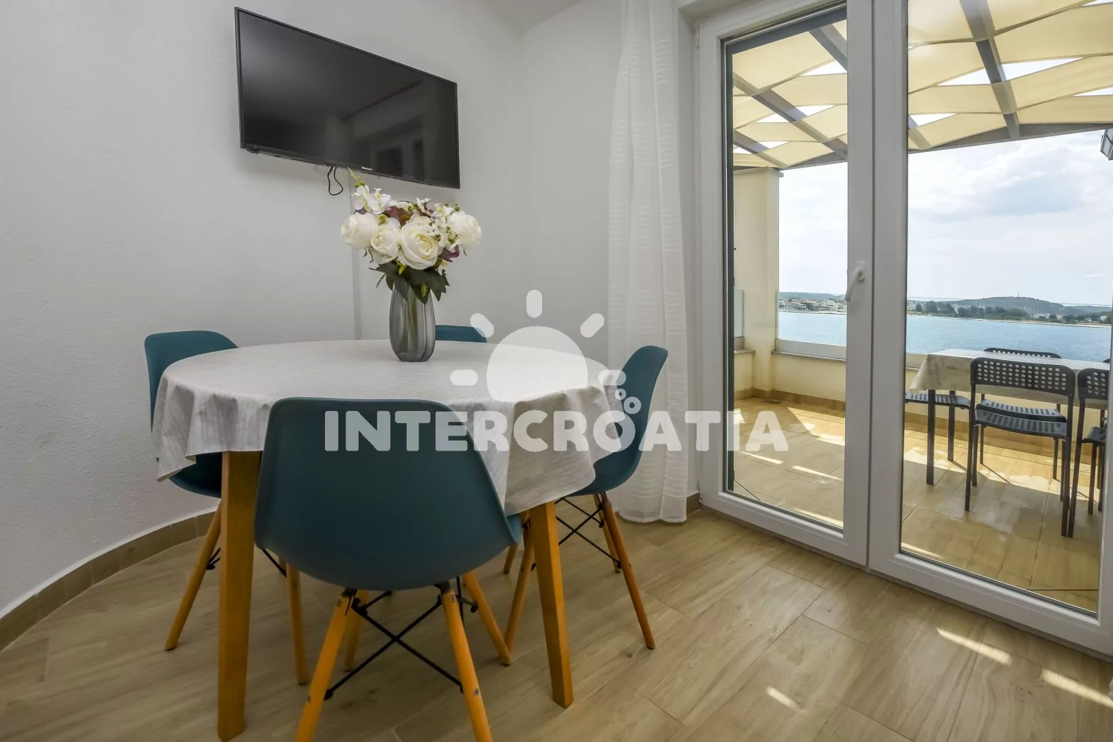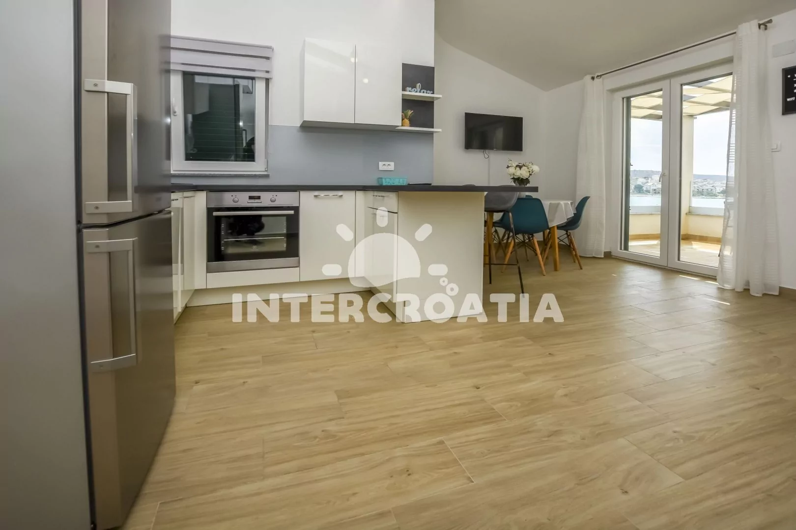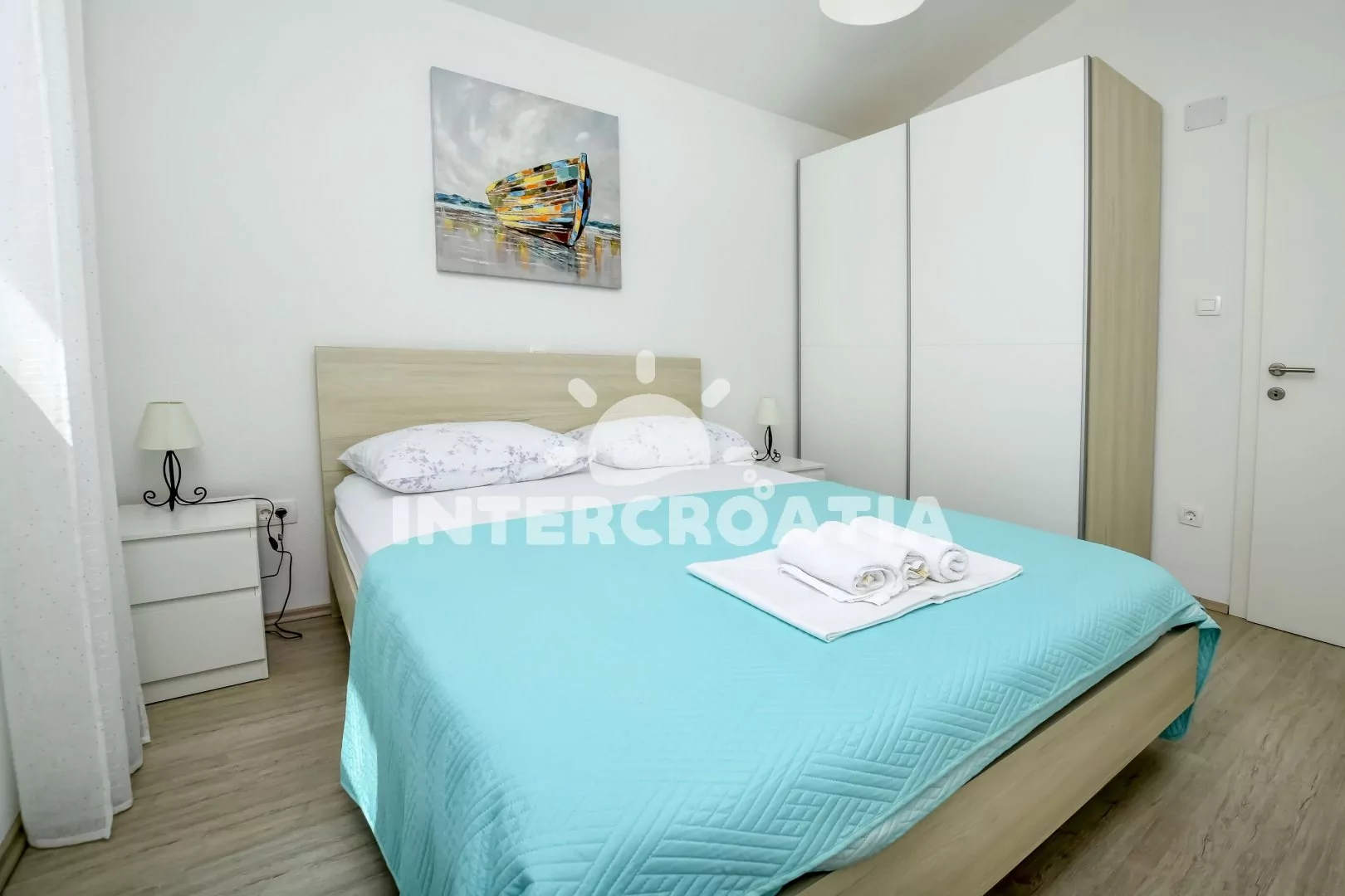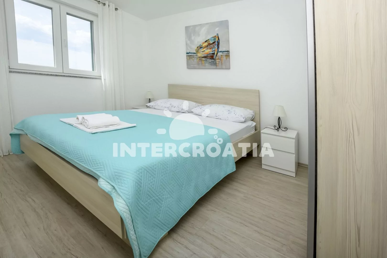 Apartmán (55 m2) s terasou, venkovním posezením a výhledem na moře se nachází ve 2. patře domu. Apartmán má 2 ložnice a je vhodný pro 4 až 5 osob. Obývací pokoj je spojený s kuchyní. Kuchyňská linka je vybavena sklokeramickou varnou deskou, vestavěnou troubou, myčkou na nádobí, rychlovarnou konvicí, nádobím a lednicí s mrazákem, (kávovar na požádání). Obývací pokoj s jídelním stolem, pohovkou (rozložitelná na extra lůžko pro 1 osobu), televizí se satelitním programem, klimatizací a vstupem na terasu. První i druhá ložnice je vybavena vždy s jedním dvoulůžkem. Koupelna se sprchovým koutem, umyvadlem a wc. Hostům je k dispozici parkování u objektu zdarma.