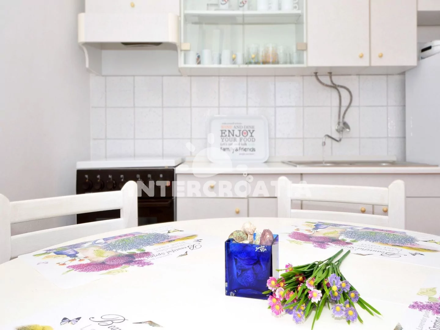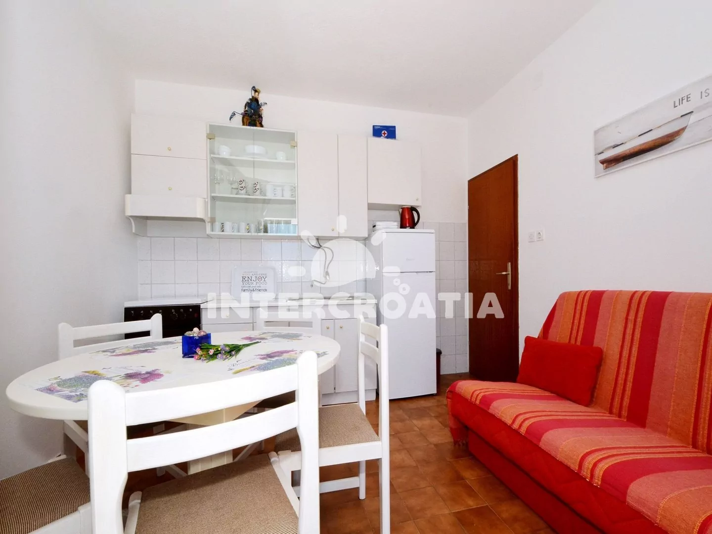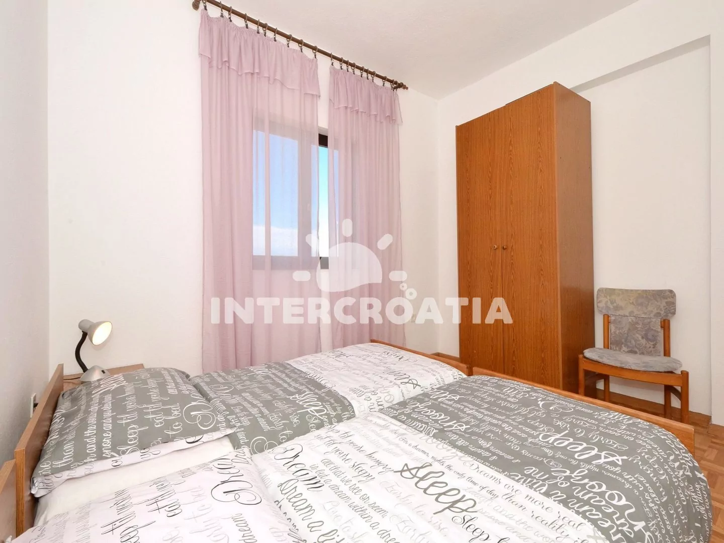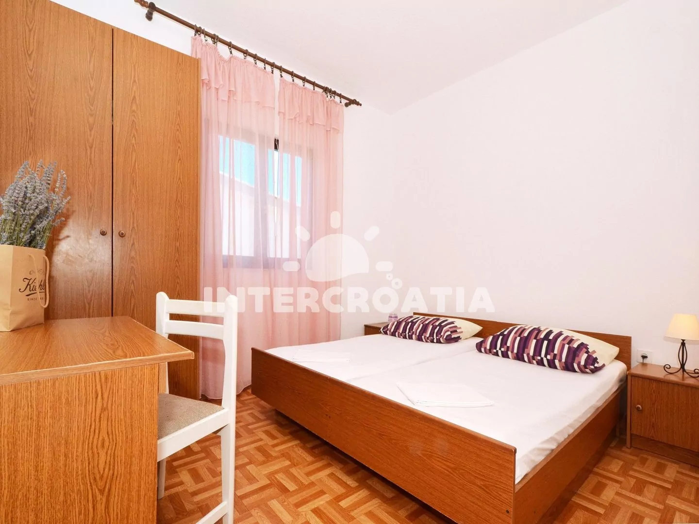 Apartmán (60 m2) s balkonem, venkovním posezením, výhledem do dvora a na moře se nachází v 1. patře domu. Apartmán má 2 ložnice a je vhodný pro až 4 osoby. Obývací pokoj je spojený s kuchyní. Kuchyňská linka je vybavena sporákem s troubou, digestoří, rychlovarnou konvicí, toustovačem, nádobím a lednicí s mrazákem. Obývací pokoj s jídelním stolem, pohovkou, televizí se satelitním programem, klimatizací a vstupem na balkon. První i druhá ložnice je vybavena dvoulůžkem. Koupelna s vanou, umyvadlem, fénem a wc. Dále samostatné wc s umyvadlem. Hostům je k dispozici parkování u objektu zdarma.