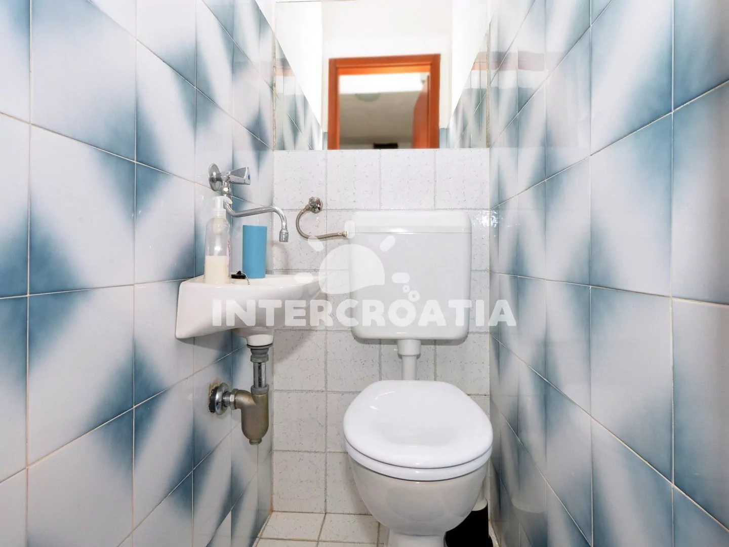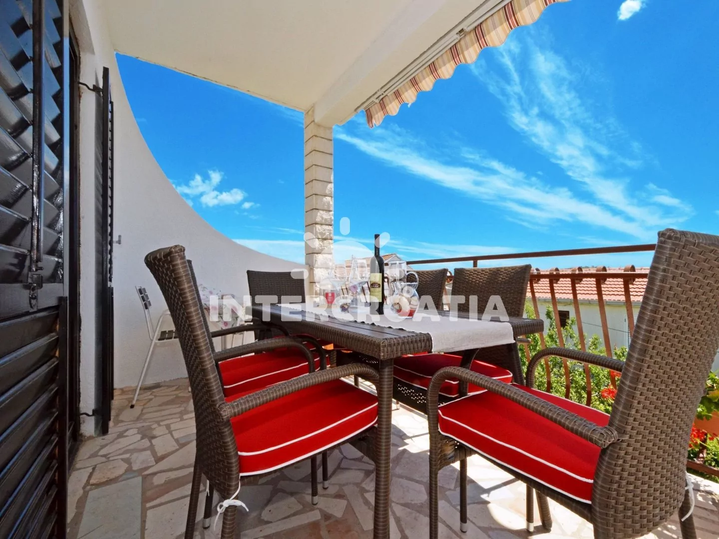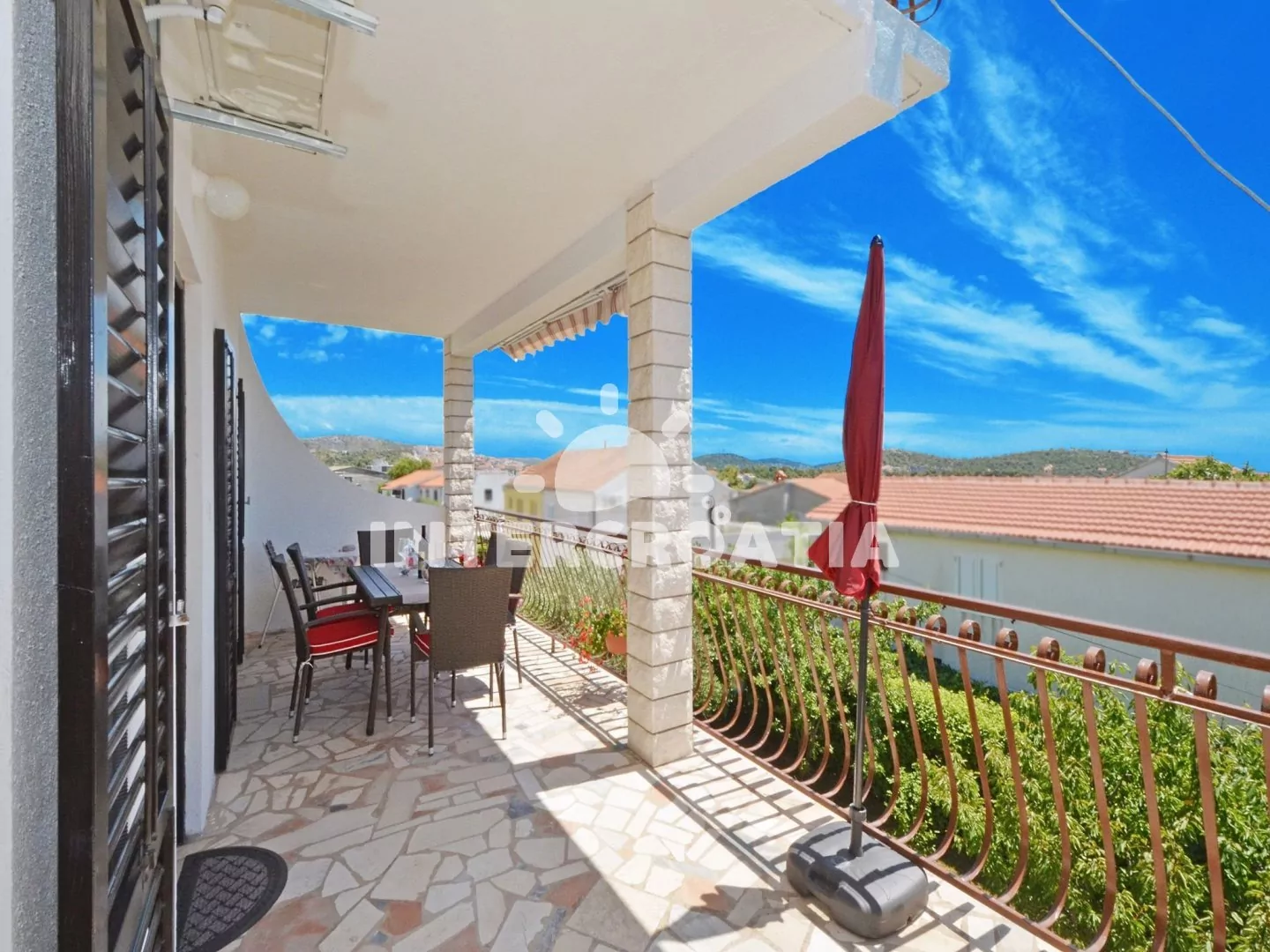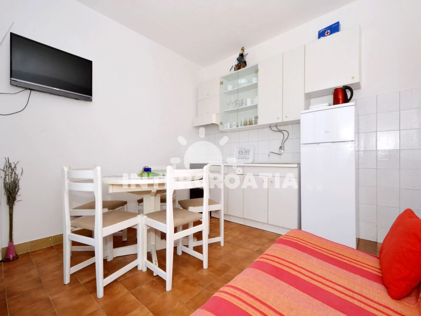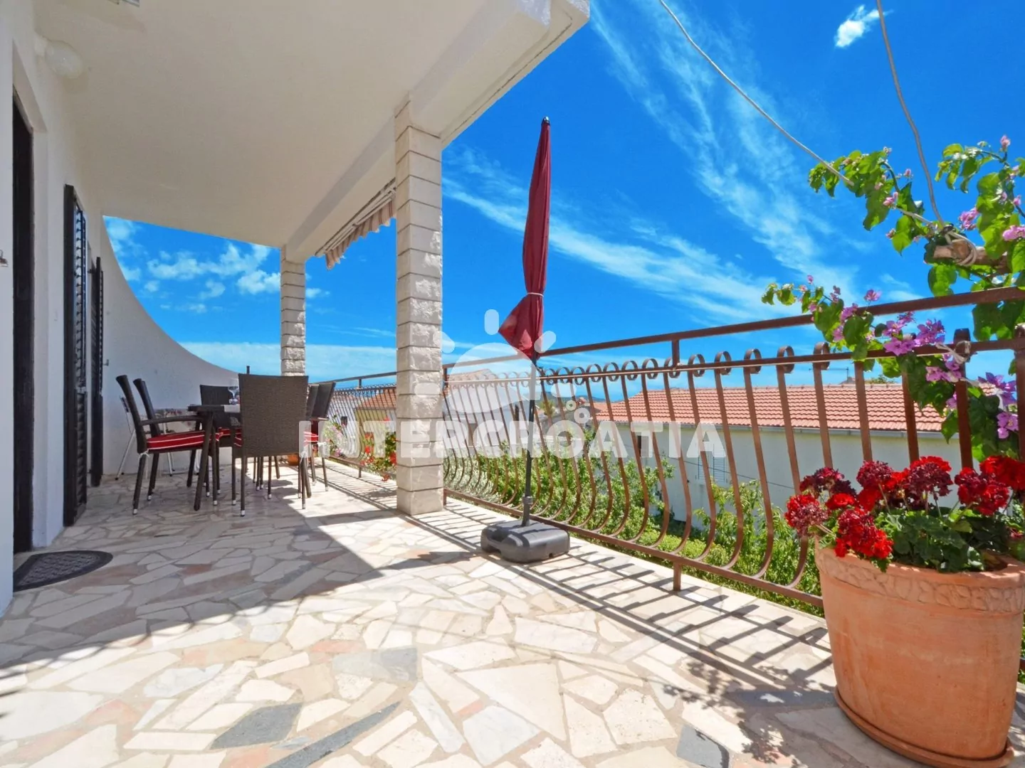 Apartmán (60 m2) s balkonem, venkovním posezením, výhledem do dvora a na moře se nachází v 1. patře domu. Apartmán má 2 ložnice a je vhodný pro až 4 osoby. Obývací pokoj je spojený s kuchyní. Kuchyňská linka je vybavena sporákem s troubou, digestoří, rychlovarnou konvicí, toustovačem, nádobím a lednicí s mrazákem. Obývací pokoj s jídelním stolem, pohovkou, televizí se satelitním programem, klimatizací a vstupem na balkon. První i druhá ložnice je vybavena dvoulůžkem. Koupelna s vanou, umyvadlem, fénem a wc. Dále samostatné wc s umyvadlem. Hostům je k dispozici parkování u objektu zdarma.