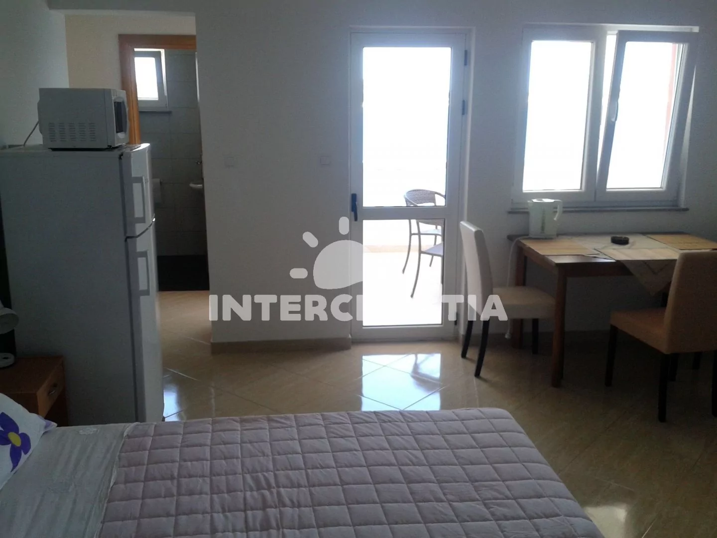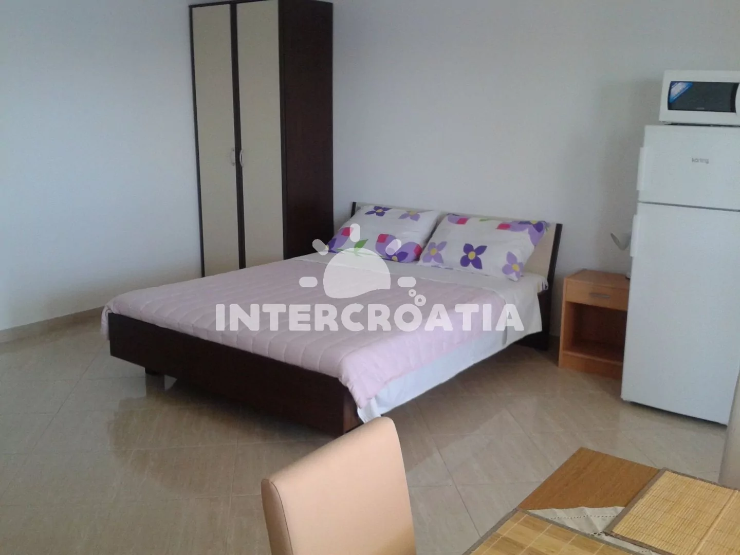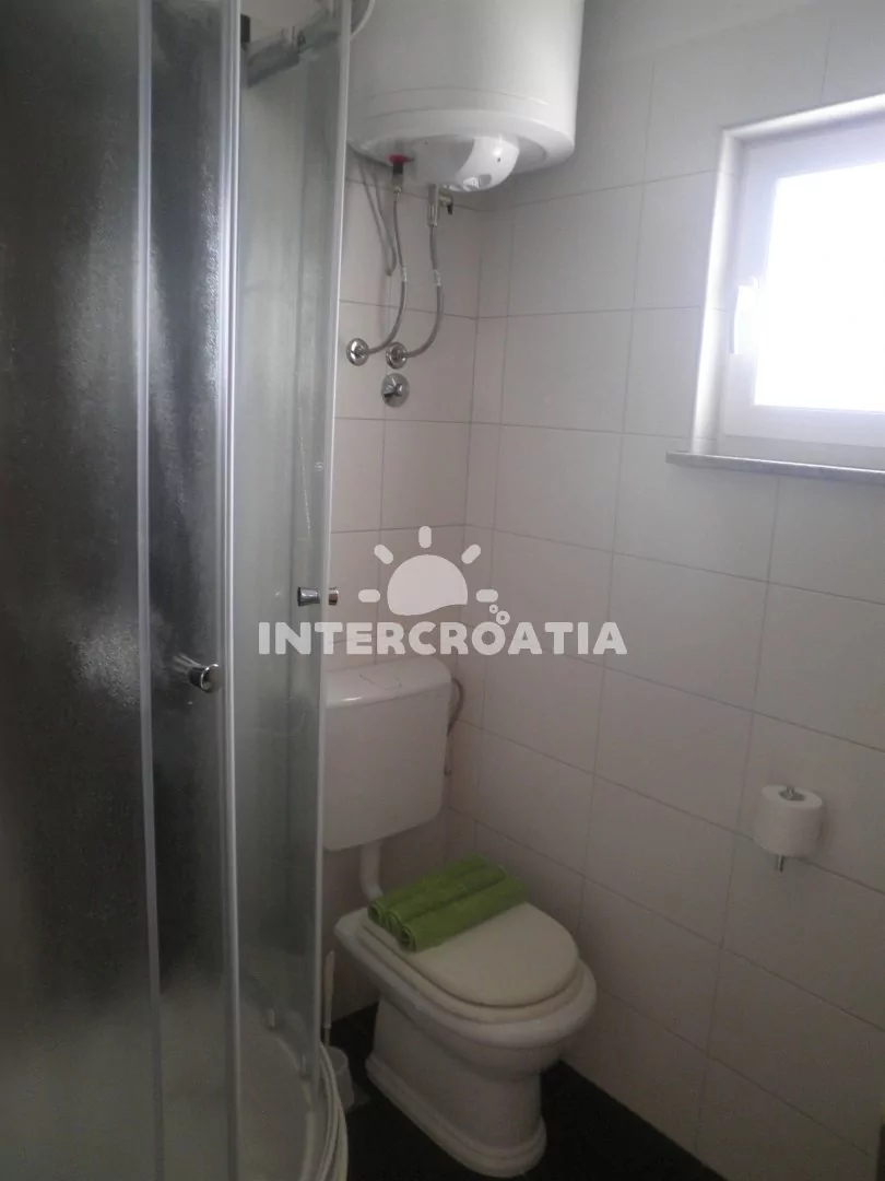 Apartmán (35 m2) typu studio s terasou a výhledem na moře se nachází ve 2. patře domu. Apartmán je vhodný pro 2 až 3 osoby. Obývací místnost je spojena s kuchyní. Kuchyňská linka je vybavena dvouplotýnkovým vařičem, digestoří, mikrovlnnou troubou, rychlovarnou konvicí, nádobím a lednicí s mrazákem. Obývací místnost s jídelním stolem, pohovkou (rozložitelná na extra lůžko pro 1 osobu), televizí se satelitním programem, dvoulůžkem, klimatizací a vstupem na terasu. Koupelna se sprchovým koutem, umyvadlem, fénem a wc. Hostům je k dispozici parkování u objektu zdarma.