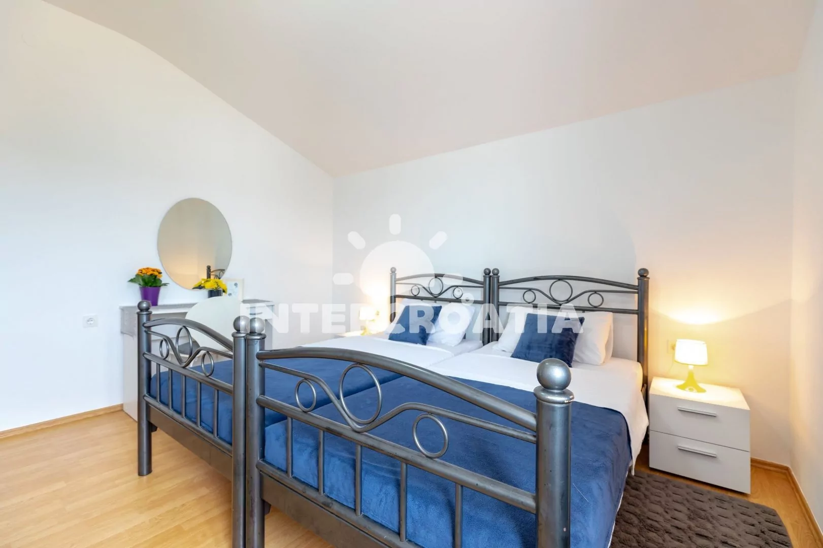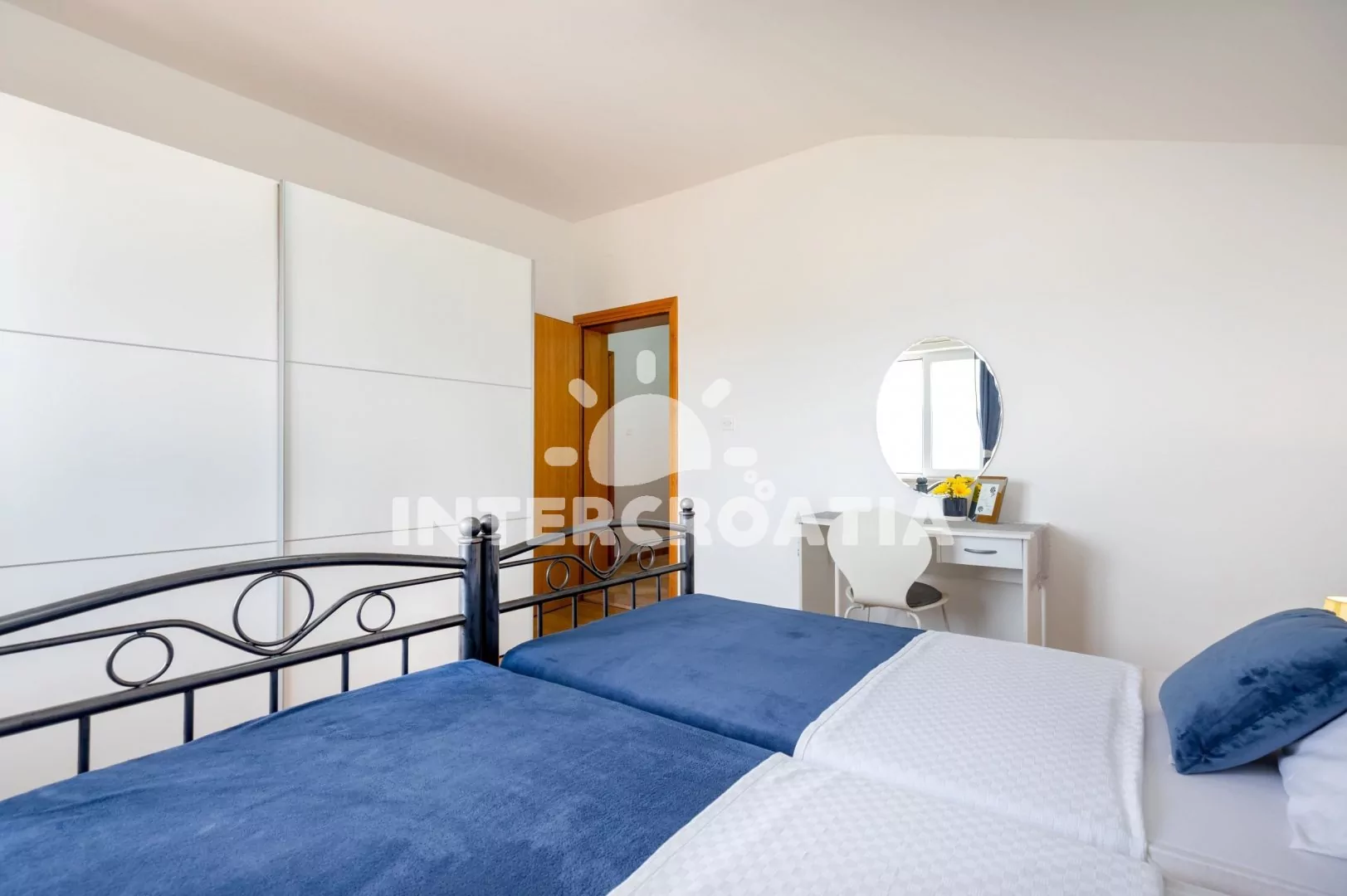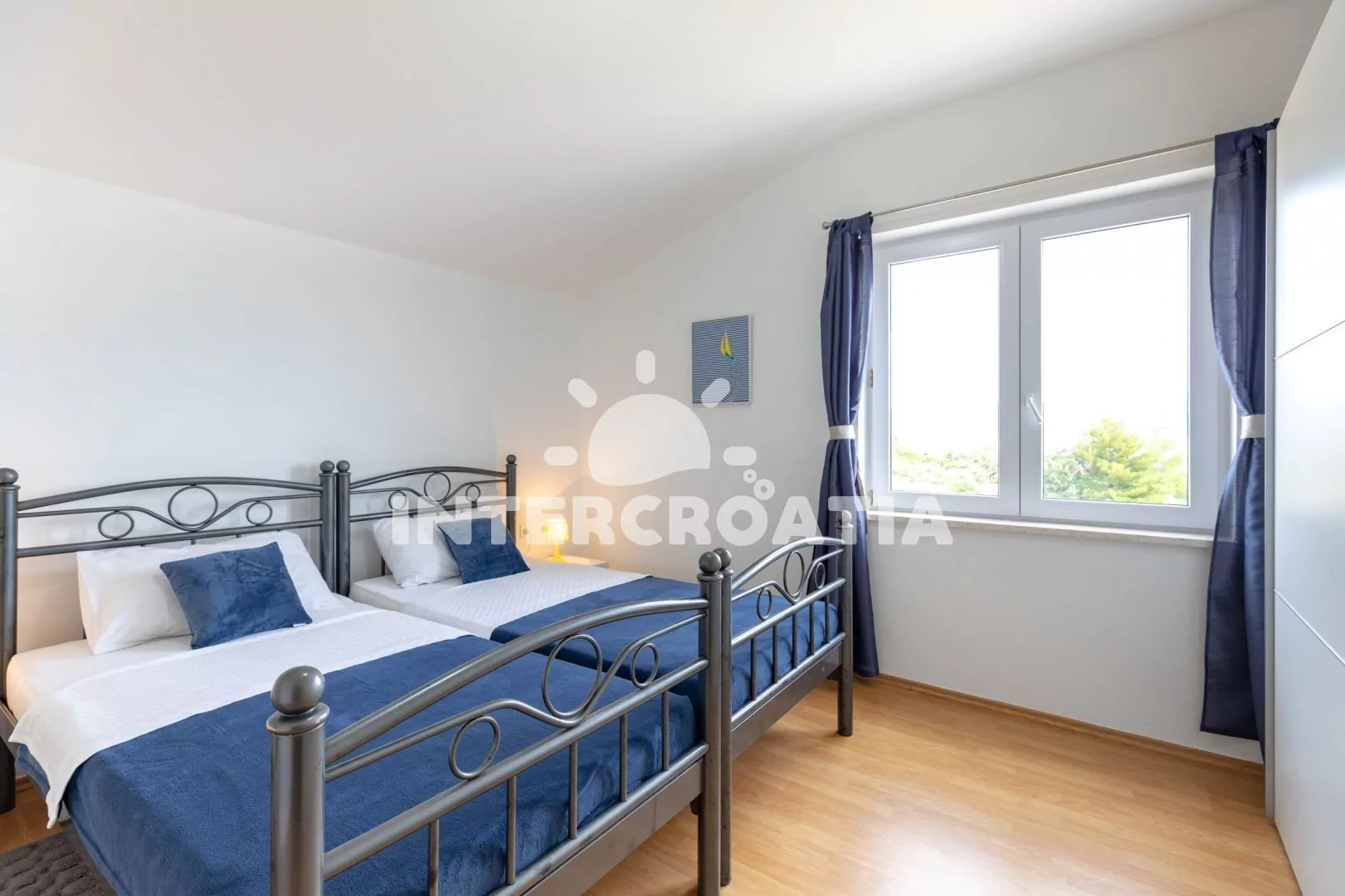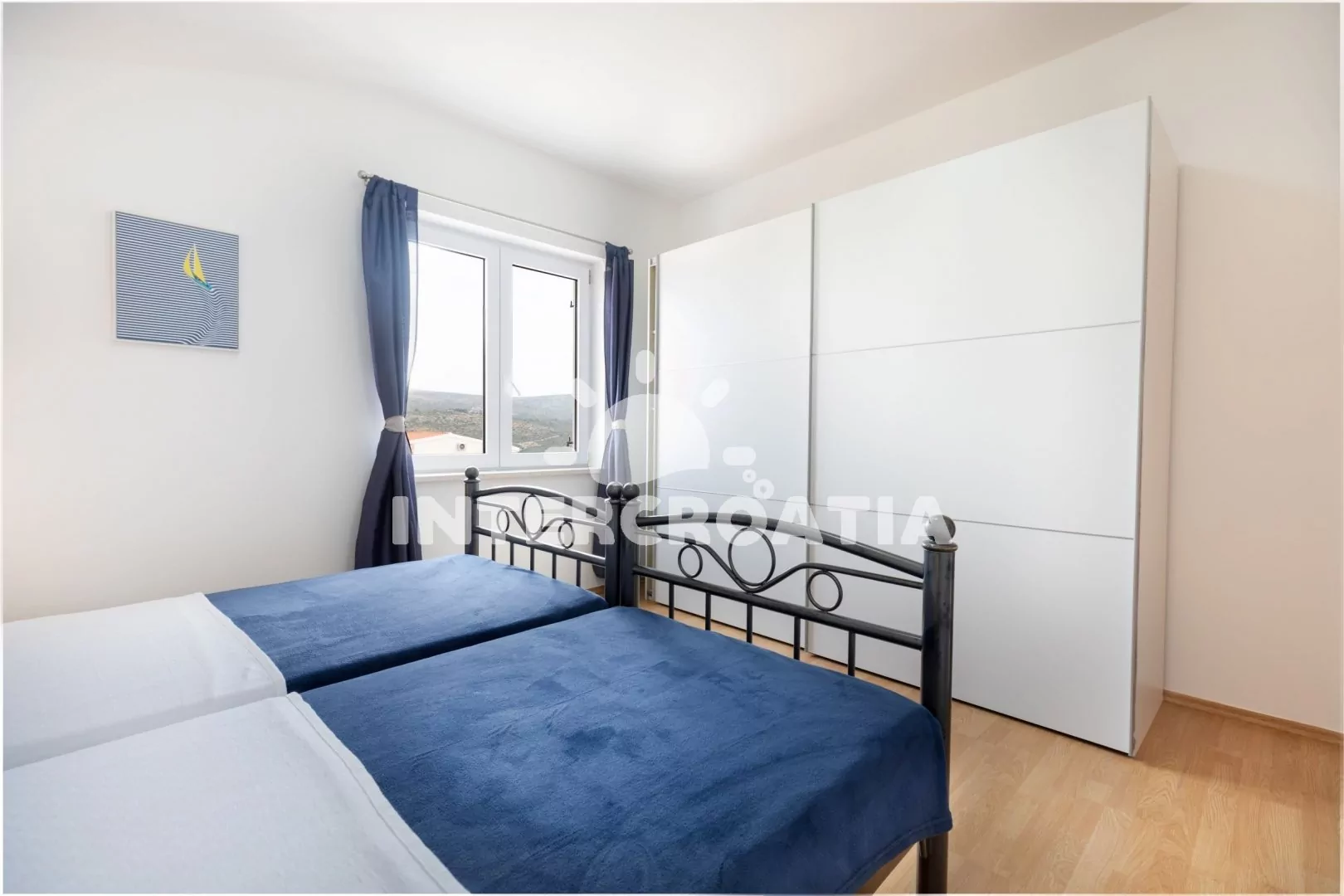 Apartmán (80 m2) s terasou, venkovním posezením a výhledem na moře se nachází v 1. patře domu. Apartmán má 1 ložnici a je vhodný pro 2 až 4 osoby. Obývací pokoj je spojený s kuchyní. Kuchyňská linka je vybavena varnou deskou, digestoří, troubou, nádobím a lednicí s mrazákem. Obývací pokoj s jídelním stolem, pohovkou (rozložitelná na extra lůžko pro 2 osoby), televizí se satelitním programem, klimatizací a vstupem na terasu. Ložnice s dvěma jednolůžky. Koupelna s vanou, umyvadlem, bidetem, fénem a wc. Hostům je k dispozici parkování u objektu zdarma.
