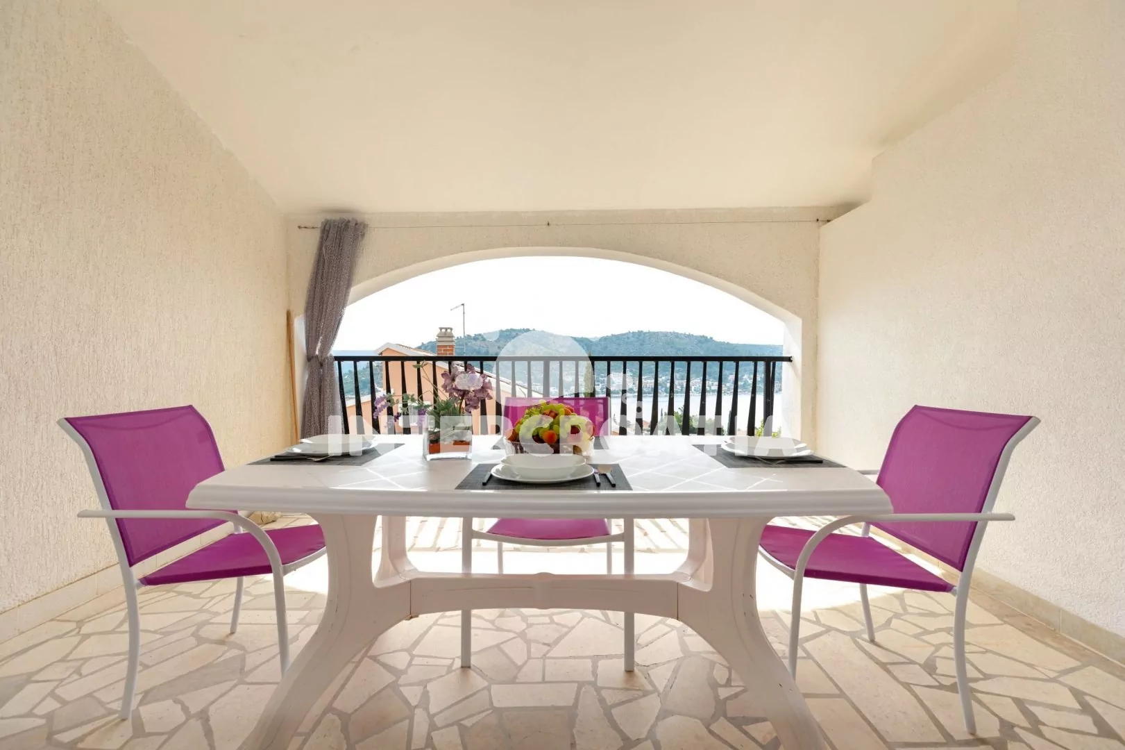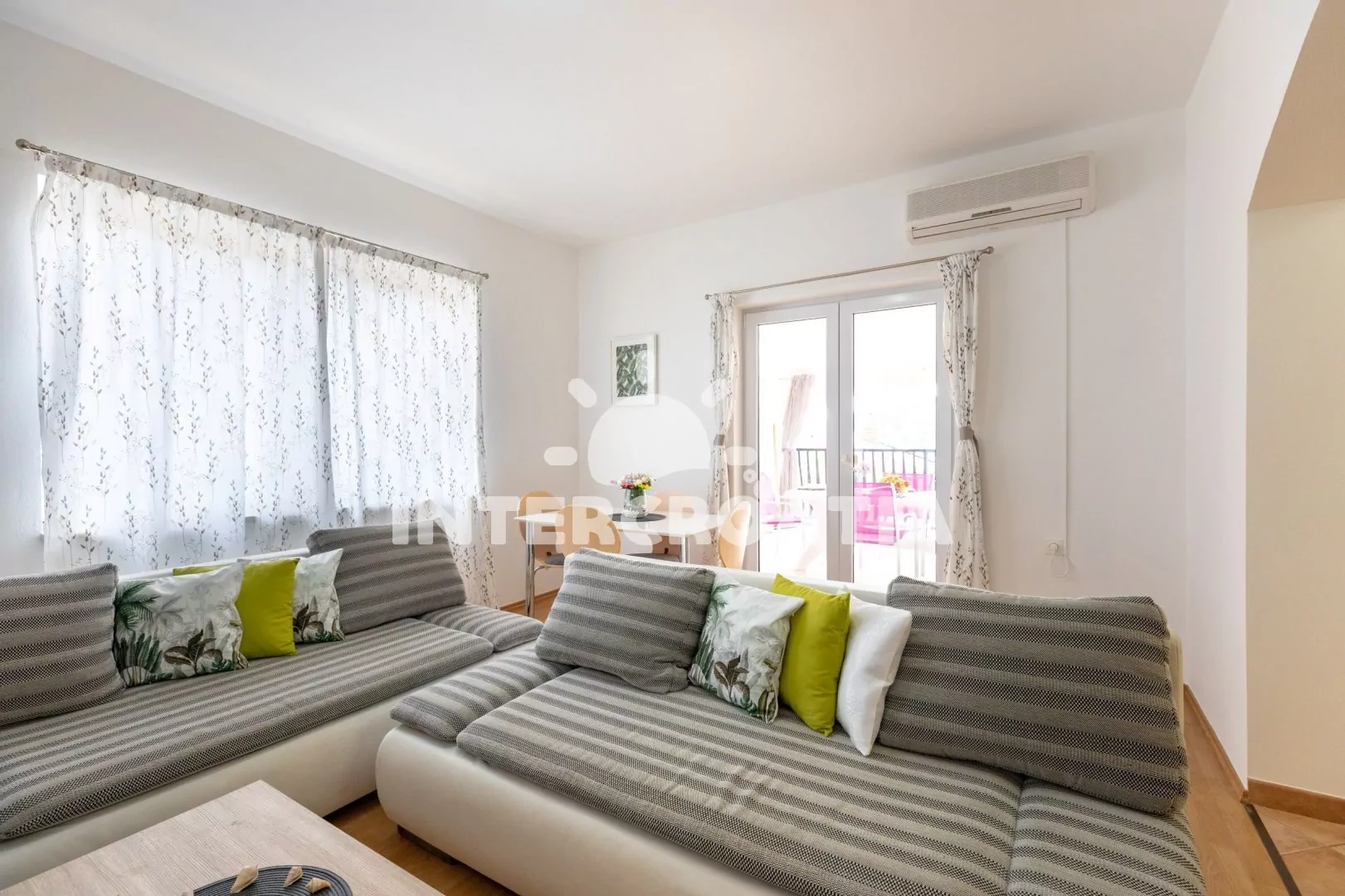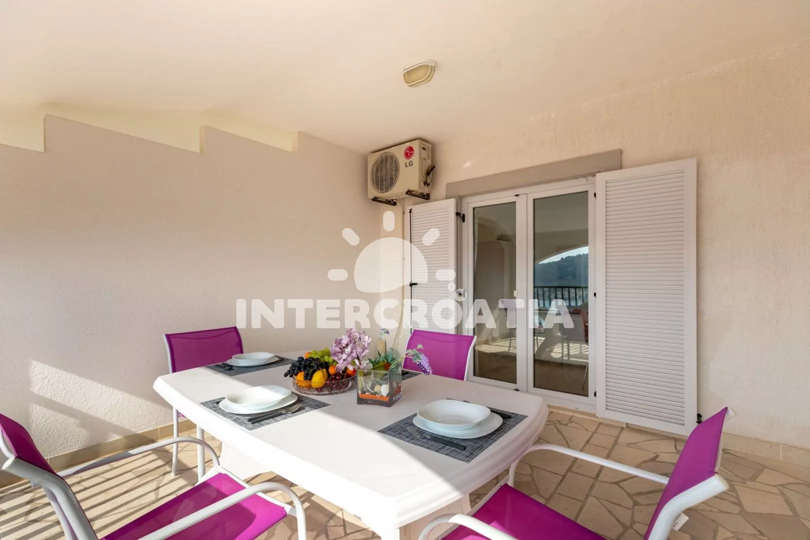 Apartmán (80 m2) s terasou, venkovním posezením a výhledem na moře se nachází v 1. patře domu. Apartmán má 1 ložnici a je vhodný pro 2 až 4 osoby. Obývací pokoj je spojený s kuchyní. Kuchyňská linka je vybavena varnou deskou, digestoří, troubou, nádobím a lednicí s mrazákem. Obývací pokoj s jídelním stolem, pohovkou (rozložitelná na extra lůžko pro 2 osoby), televizí se satelitním programem, klimatizací a vstupem na terasu. Ložnice s dvěma jednolůžky. Koupelna s vanou, umyvadlem, bidetem, fénem a wc. Hostům je k dispozici parkování u objektu zdarma.