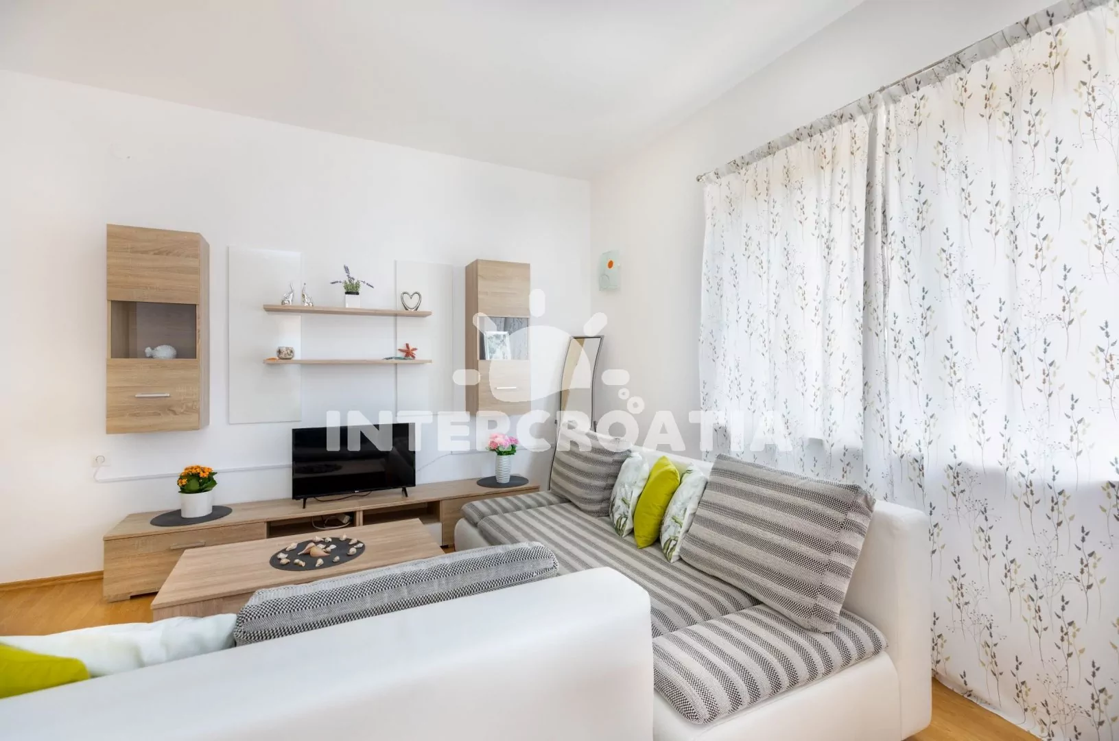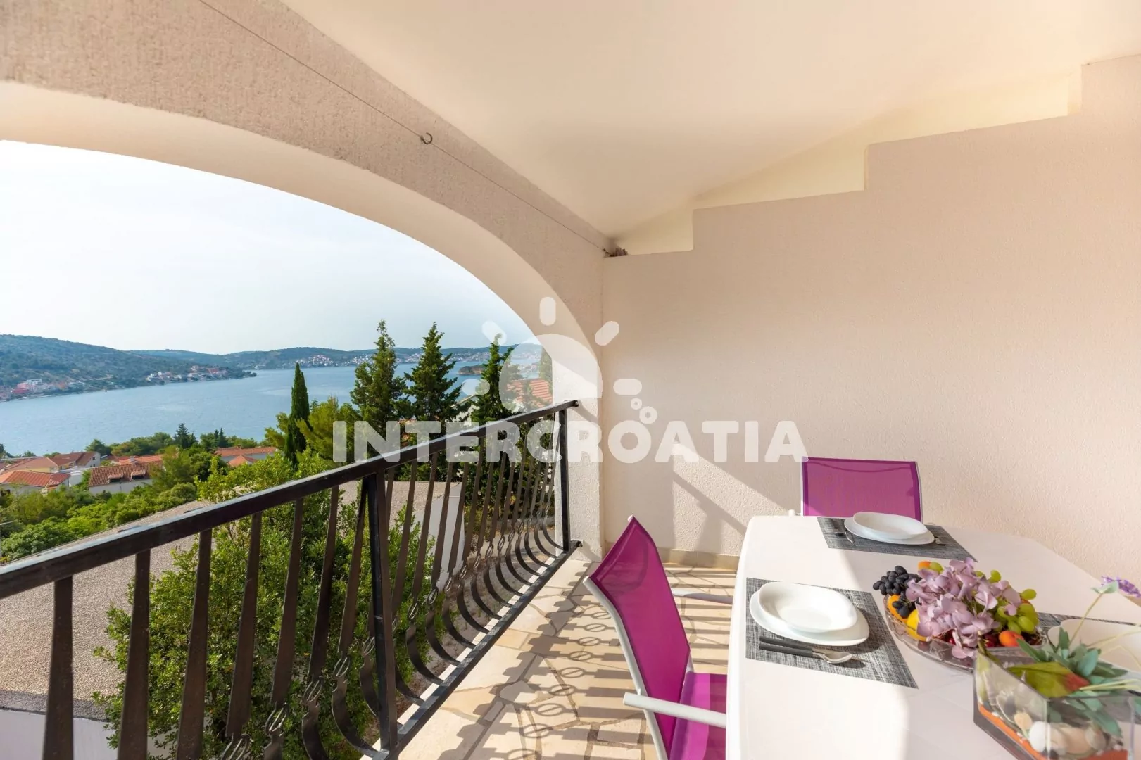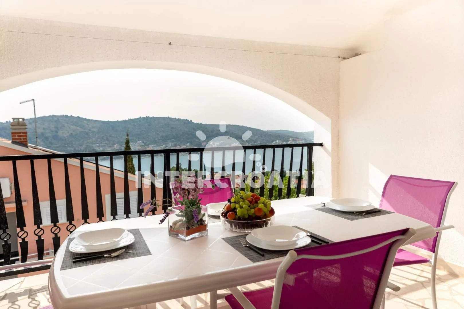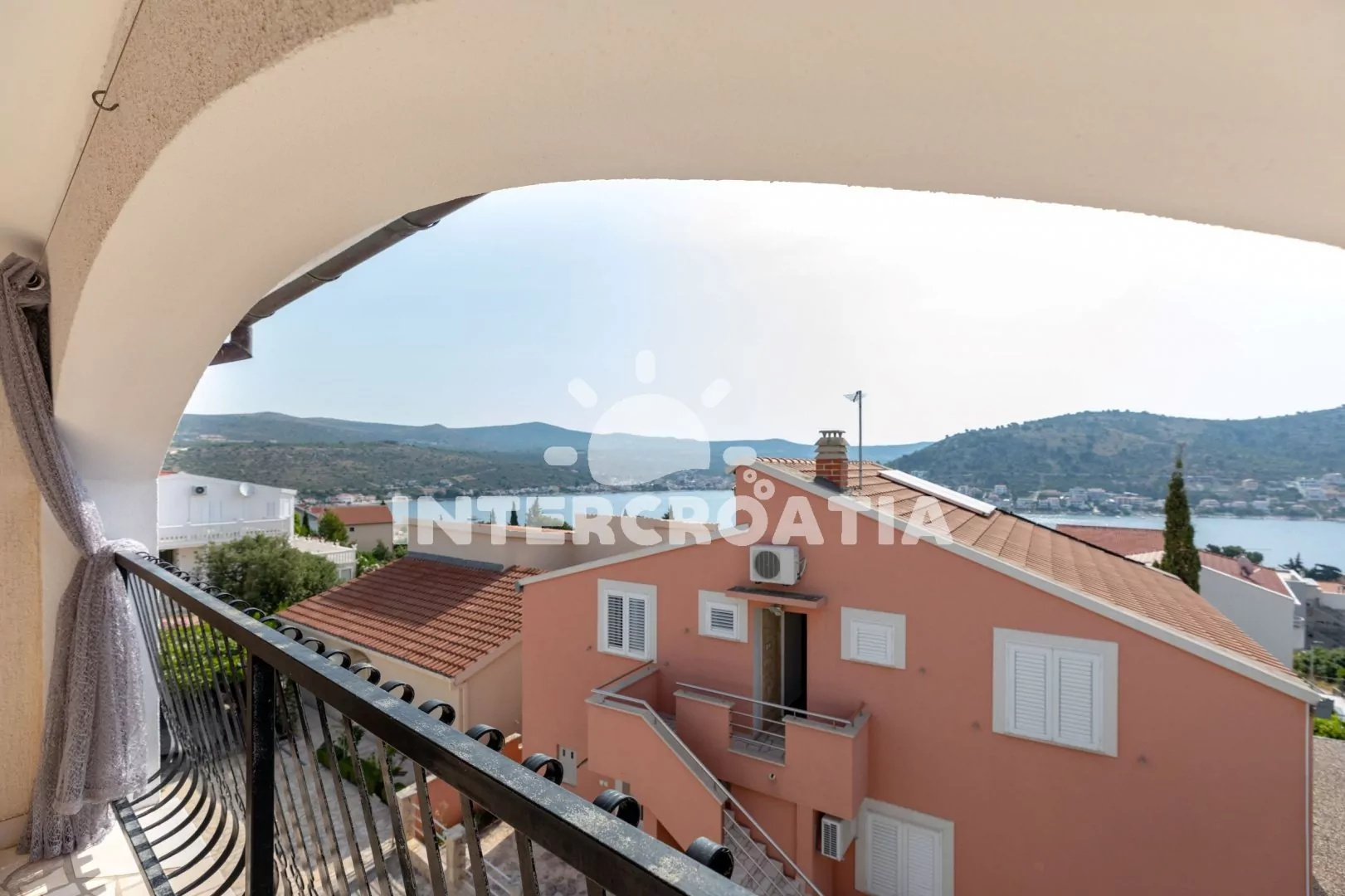 Apartmán (80 m2) s terasou, venkovním posezením a výhledem na moře se nachází v 1. patře domu. Apartmán má 1 ložnici a je vhodný pro 2 až 4 osoby. Obývací pokoj je spojený s kuchyní. Kuchyňská linka je vybavena varnou deskou, digestoří, troubou, nádobím a lednicí s mrazákem. Obývací pokoj s jídelním stolem, pohovkou (rozložitelná na extra lůžko pro 2 osoby), televizí se satelitním programem, klimatizací a vstupem na terasu. Ložnice s dvěma jednolůžky. Koupelna s vanou, umyvadlem, bidetem, fénem a wc. Hostům je k dispozici parkování u objektu zdarma.