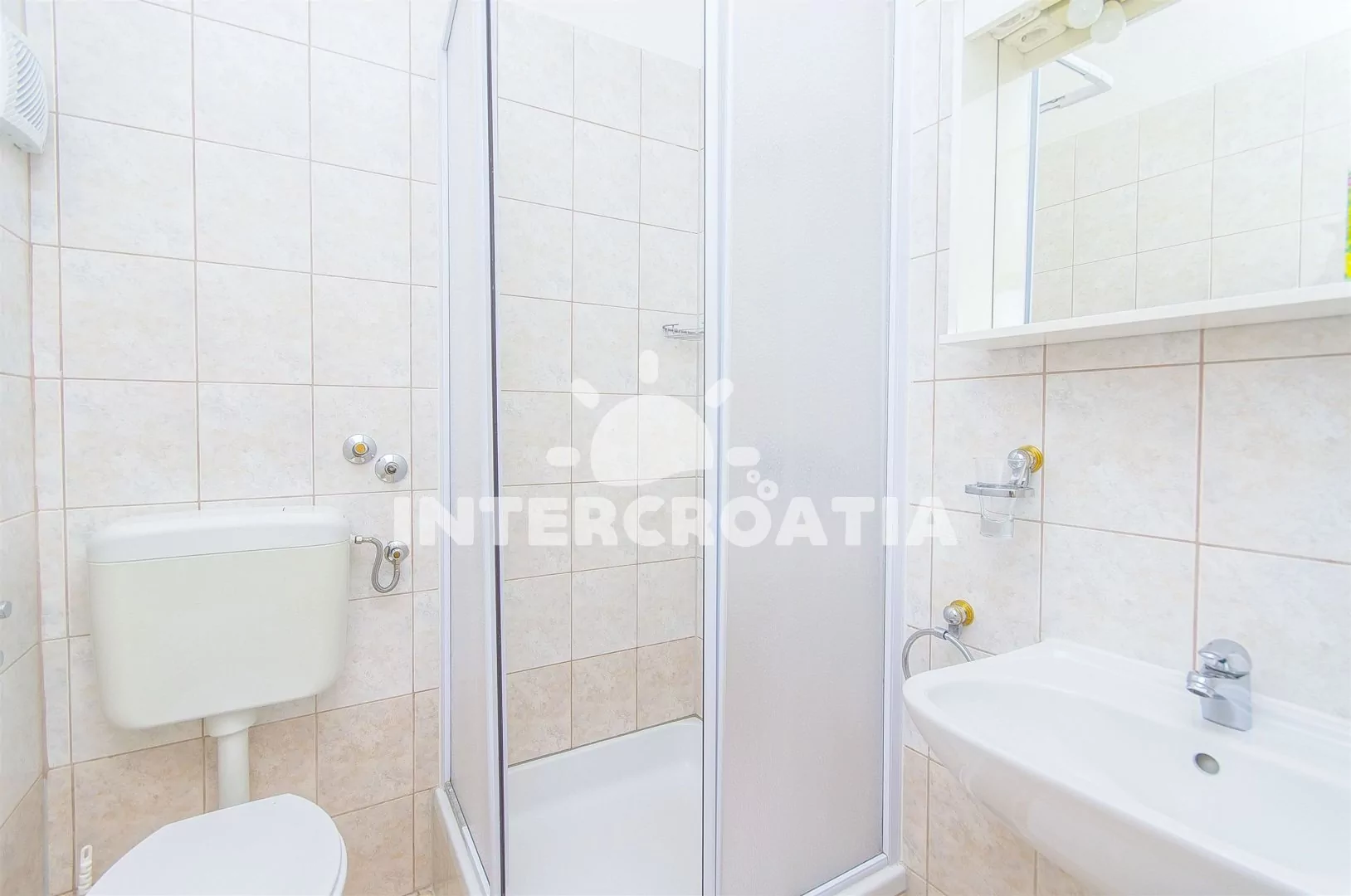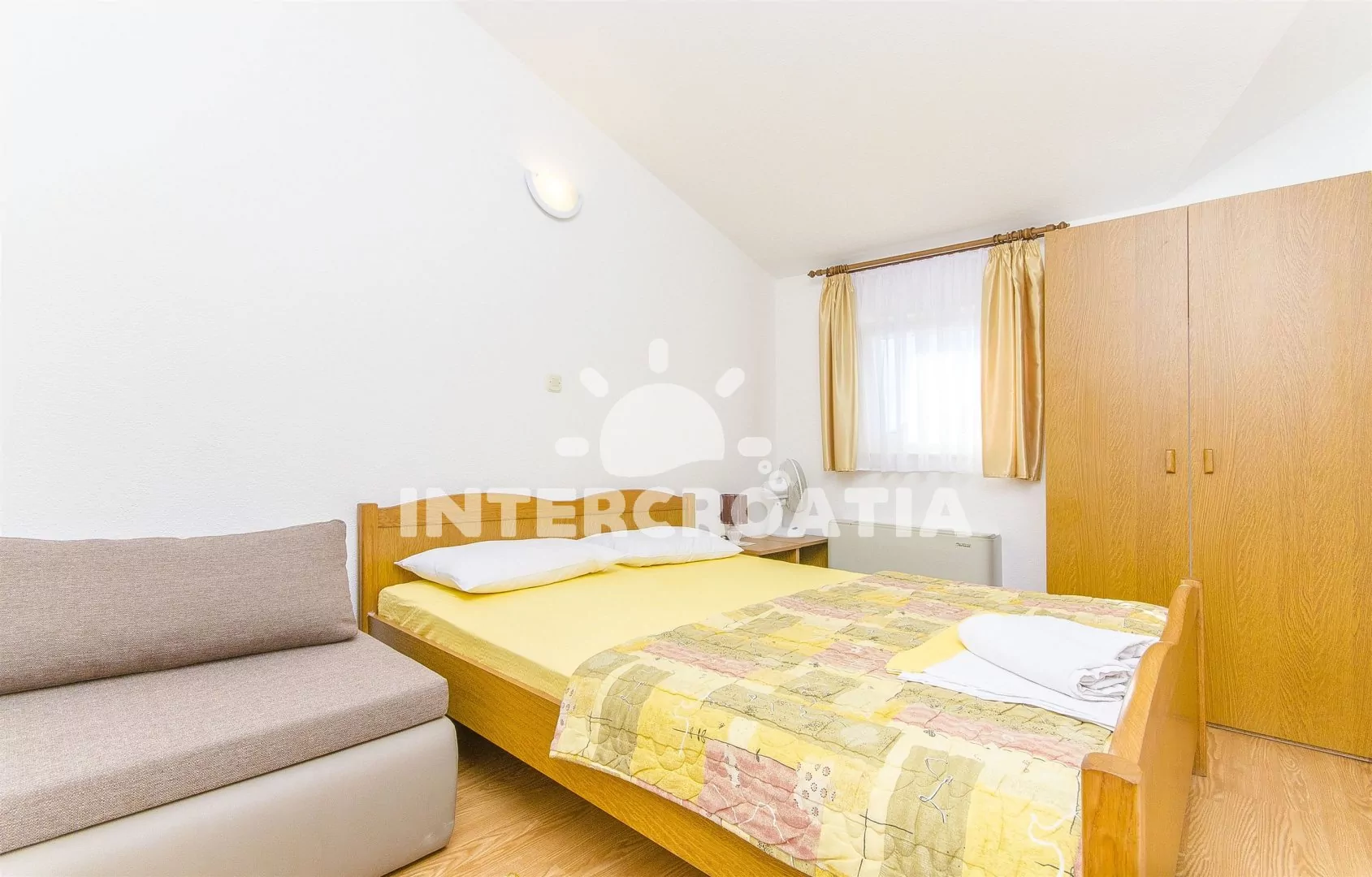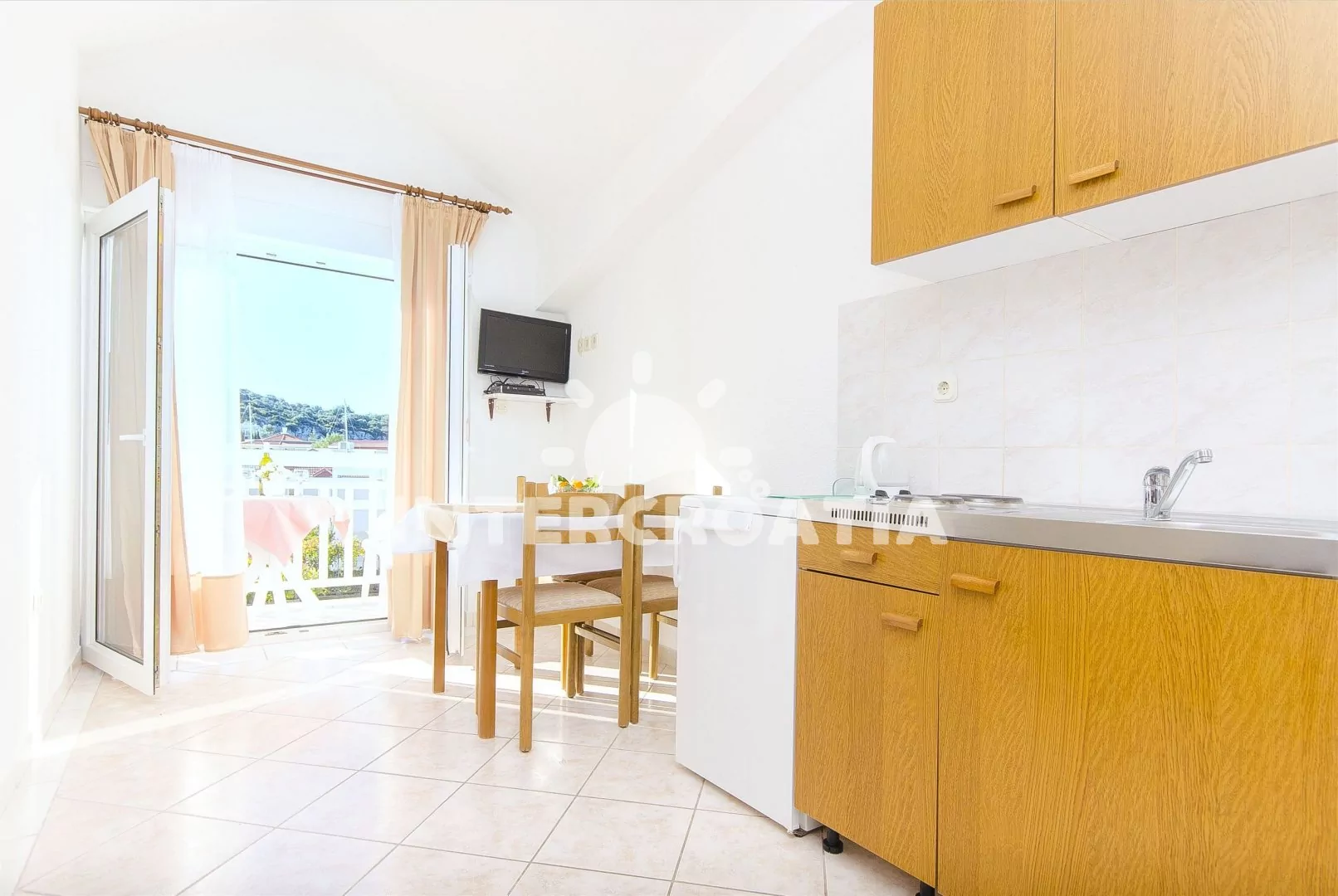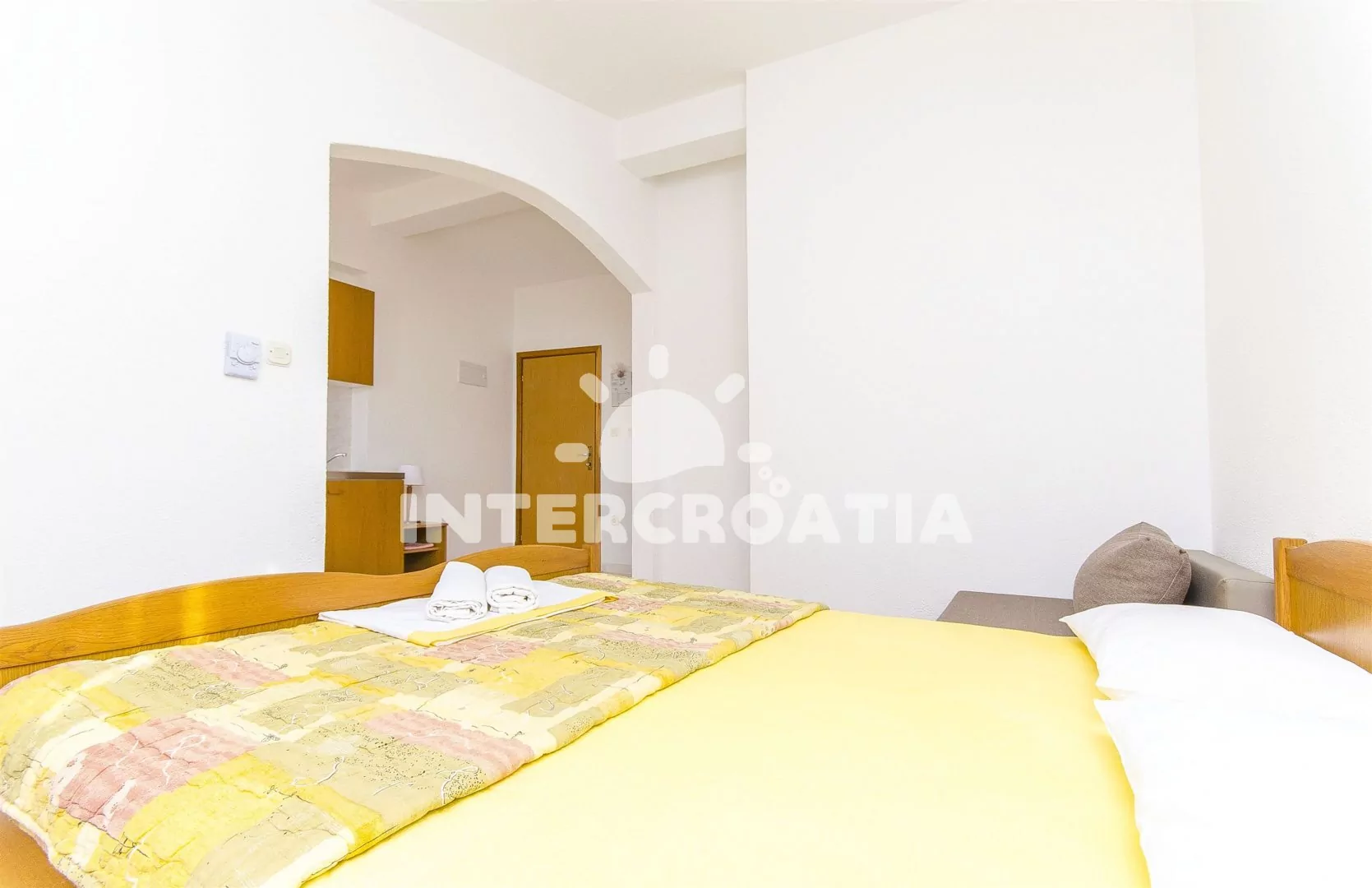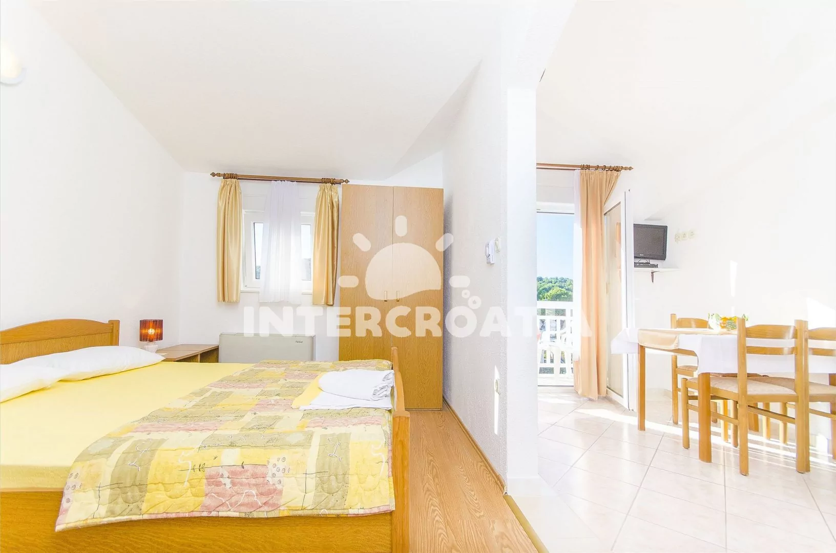 Apartmán (27 m2) typu studio s balkonem, posezením a částečným výhledem na moře se nachází ve 2. patře domu. Obývací místnost je spojena s kuchyní. Kuchyňská linka je vybavena dvouplotýnkovým vařičem, kávovarem, nádobím a lednicí s mrazákem. Obývací místnost s jídelním stolem, pohovkou (rozložitelná na extra lůžko pro 1 osobu), dvoulůžkem, televizí se satelitním programem, klimatizací a vstupem na balkon. Koupelna se sprchovým koutem, umyvadlem a wc. Hostům je k dispozici parkování u objektu zdarma.
