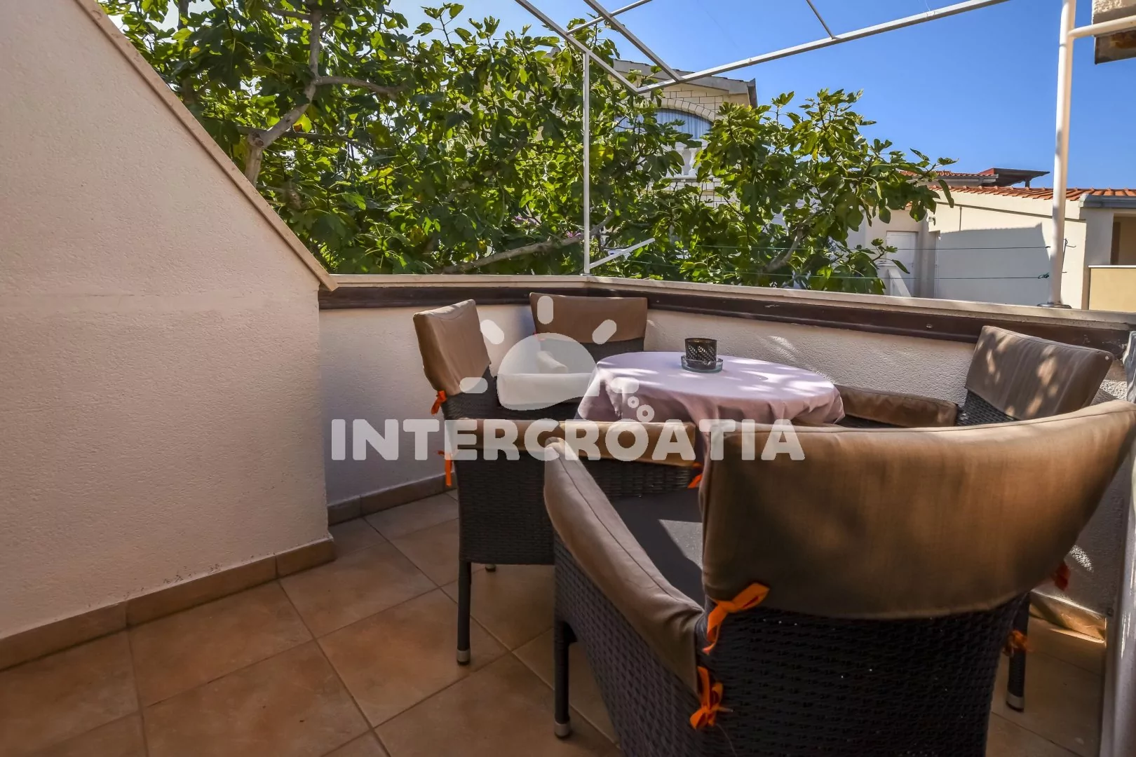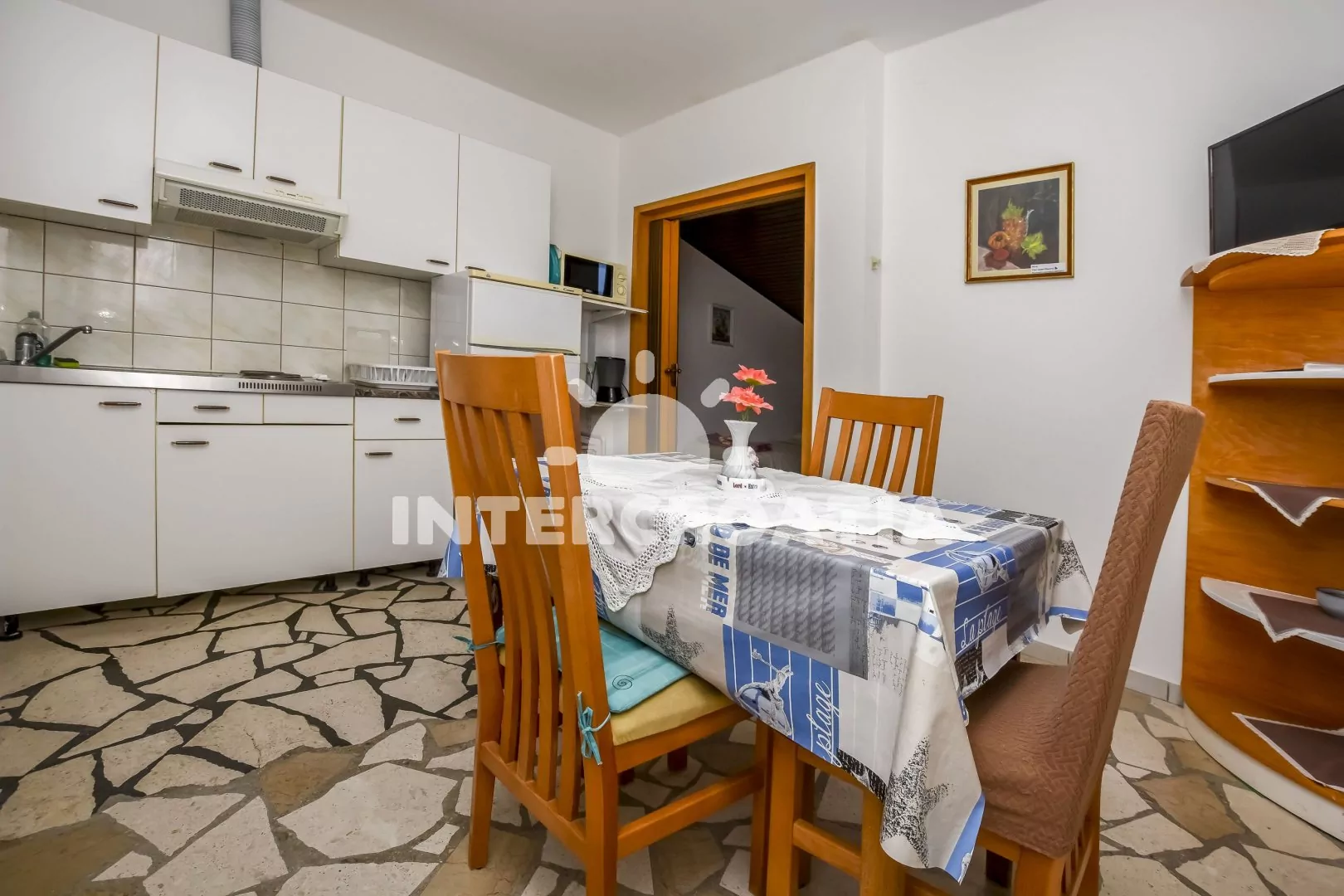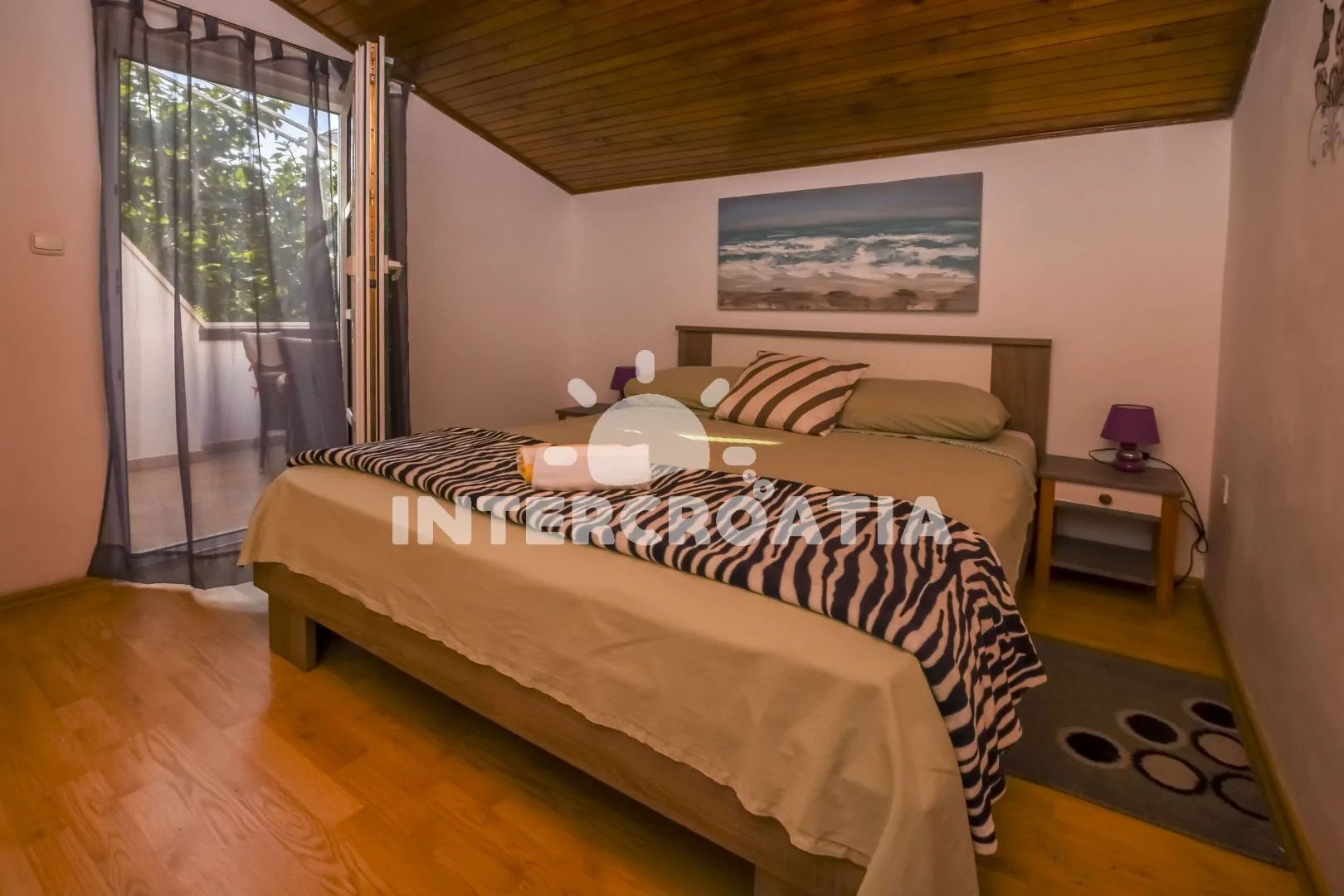 Apartmán (50 m2) s terasou a venkovním posezením se nachází ve 2. patře domu. Apartmán má 2 ložnice a je vhodný pro až 4 osoby. Obývací pokoj je spojený s kuchyní. Kuchyňská linka je vybavena dvouplotýnkovým vařičem, digestoří, mikrovlnnou troubou, rychlovarnou konvicí, kávovarem, nádobím a lednicí s mrazákem. Obývací pokoj s jídelním stolem, pohovkou, televizí se satelitním programem a klimatizací. První ložnice s dvoulůžkem a vstupem na terasu. Druhá ložnice s dvěma jednolůžky. Koupelna se sprchovým koutem, umyvadlem, fénem a wc. Hostům je k dispozici parkování u objektu zdarma.