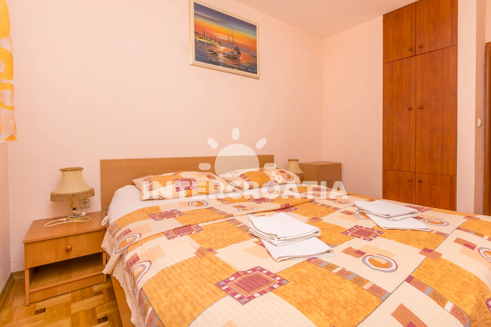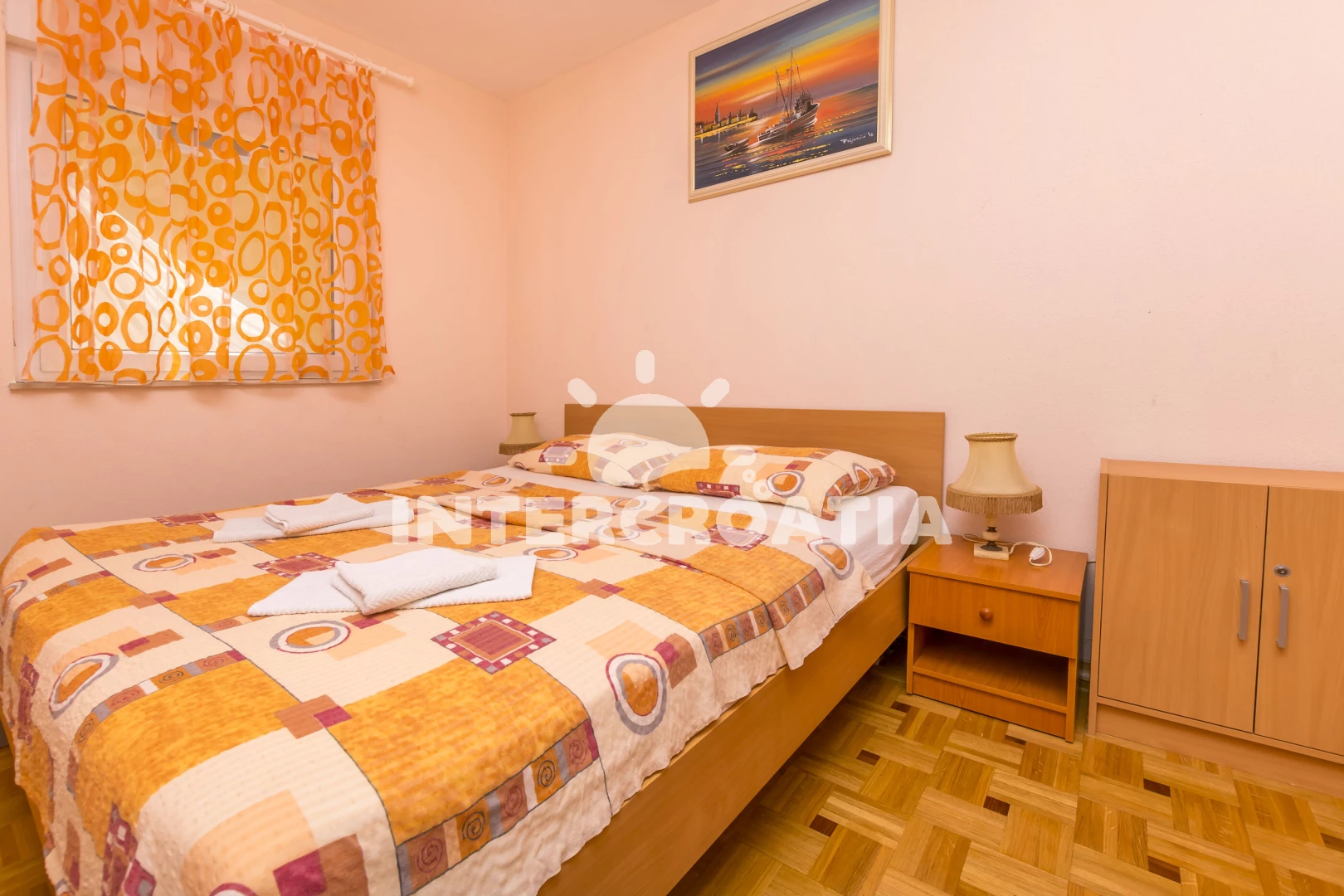 Apartmán (43 m2) s balkonem, a výhledem na moře. Nachází se v přízemí objektu. Apartmán má 2 ložnice a je vhodný pro až 4 osoby. Kuchyňská linka je vybavena varnou deskou, troubou, rychlovarnou konvicí, nádobím, lednicí, mrazákem. K dispozici televize se satelitním programem. První ložnice s dvoulůžkem. Druhá ložnice s dvoulůžkem. Koupelna se sprchovým koutem, umyvadlem, fénem a WC.