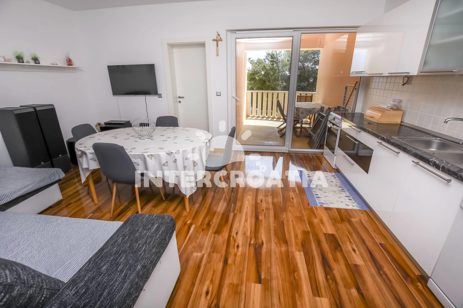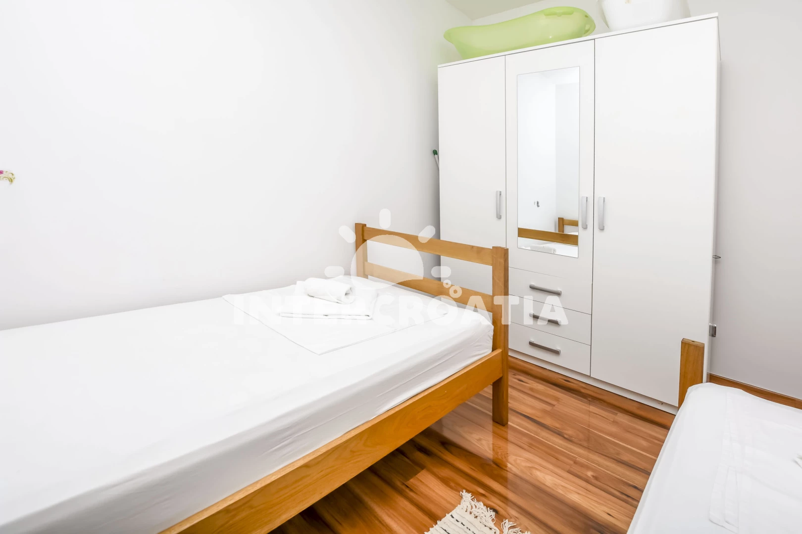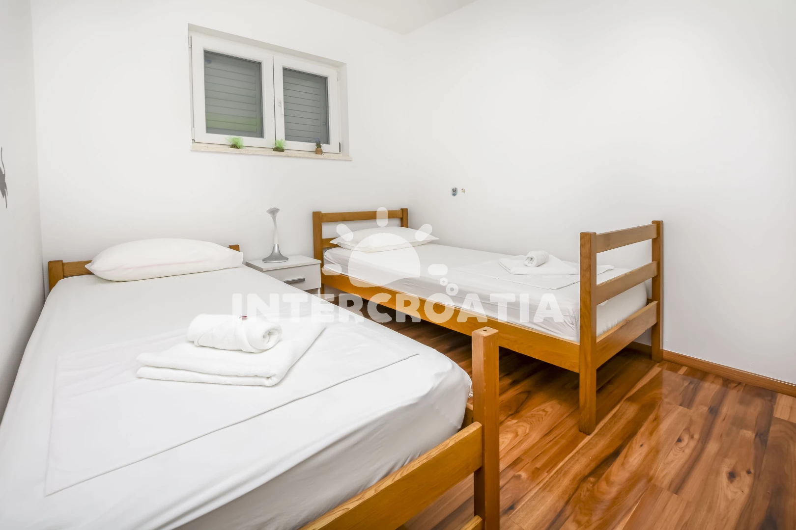 Vzdálenosti: Moře 50 m, pláž 70 m (oblázková a betonové desky), supermarket 300 m, bar 300 m, směnárna 300 m, centrum 300 m, půjčovna kol 500 m, půjčovna motorových člunů 500 m, restaurace 600 m, lékárna 800 m, potápění 800 m, marina 1 km, diskotéka 1,1 km, pošta 1,1 km, banka 1,1 km, ambulance 1,1 km, veřejná doprava 2 km, čerpací stanice 5 km, muzeum 30 km, letiště (Split) 33 km, trajekt (Šibenik) 35 km, park Plitvice 50 km,