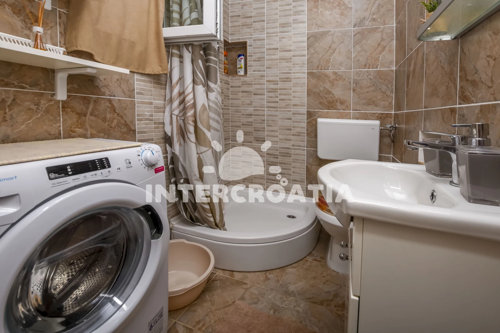 Vzdálenosti: Moře 70 m, pláž 70 m (skalnatá, oblázková, větší kamení a betonové desky), restaurace 150 m, bar 2 km, směnárna 2 km, supermarket 2 km, lékárna 2 km, centrum 2 km, pošta 2,5 km, ambulance 2,5 km, veřejná doprava 3 km, banka 9 km, čerpací stanice 9 km, letiště (Split) 30 km, trajekt (Šibenik) 35 km,