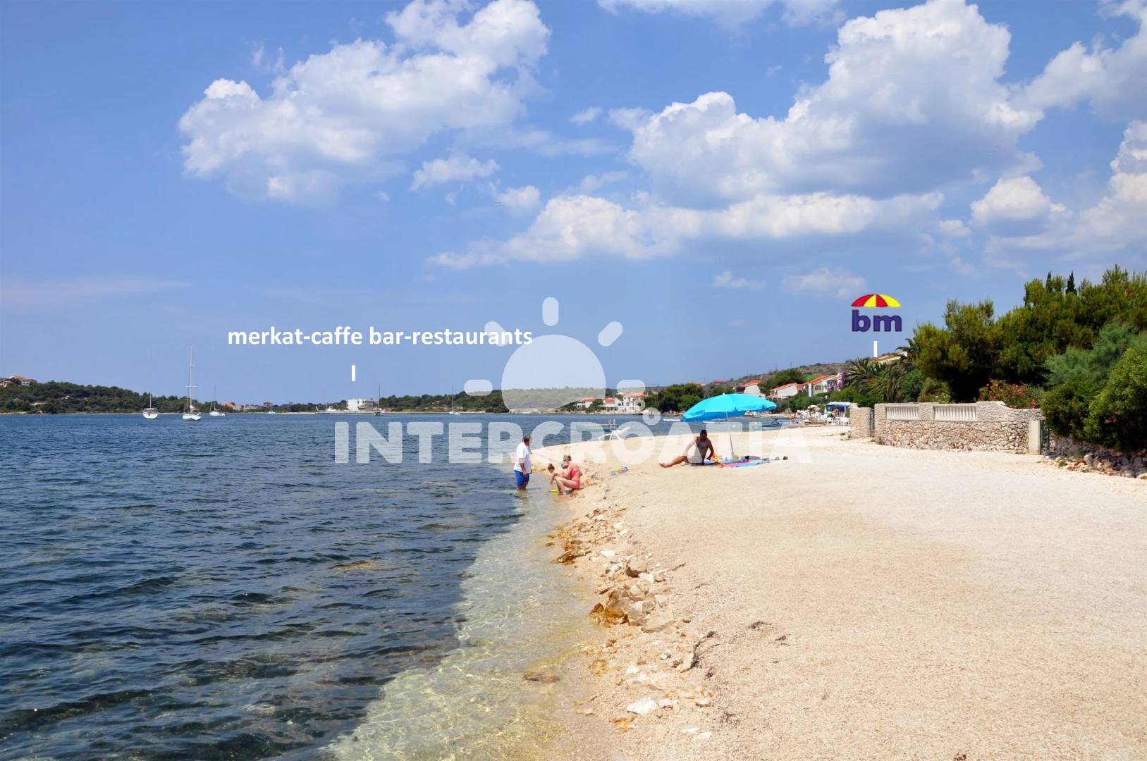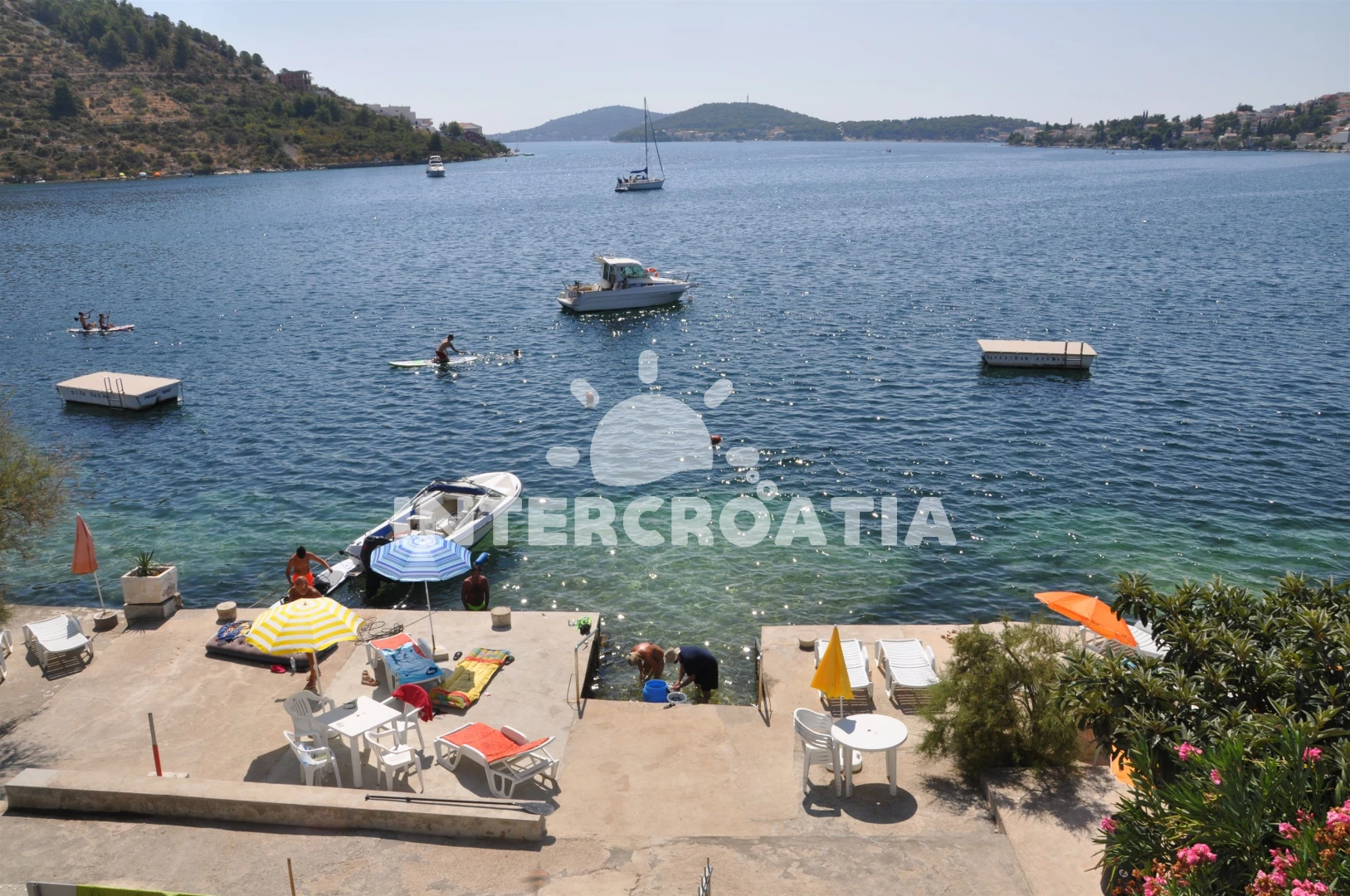 Vzdálenosti: Moře 10 m, pláž 10 m (oblázková a betonové desky), kotviště pro čluny 10 m, bar 400 m, supermarket 400 m, veřejná doprava 400 m, směnárna 400 m, restaurace 400 m, lékárna 1,2 km, marina 2 km, potápění 2 km, půjčovna kol 2 km, centrum 2 km, tenisové kurty 2 km, ambulance 2 km, banka 2 km, pošta 2,0 km, diskotéka 7 km, čerpací stanice 7 km, půjčovna motorových člunů 7 km, letiště (Split) 25 km, trajekt (Split) 50 km,