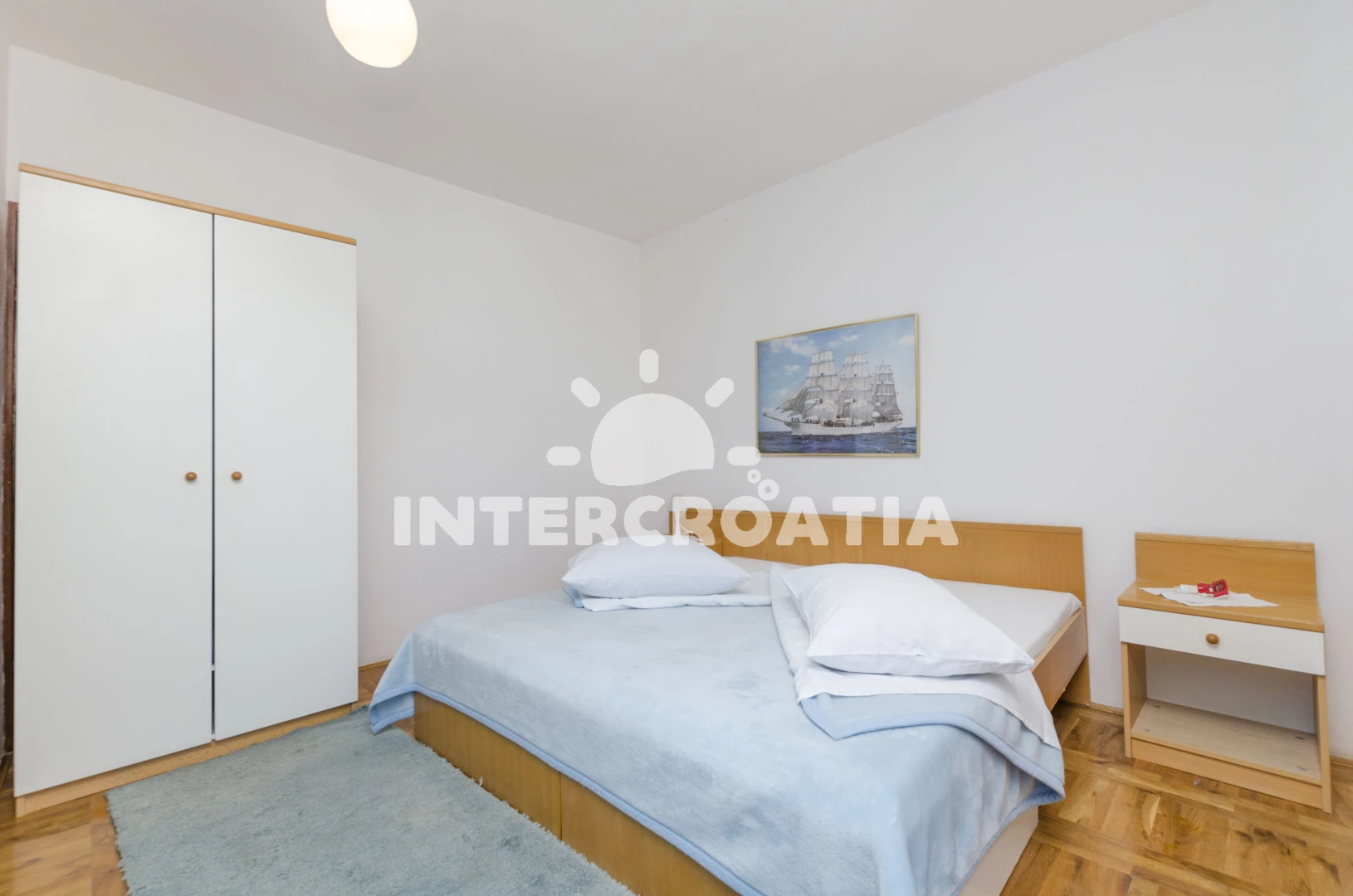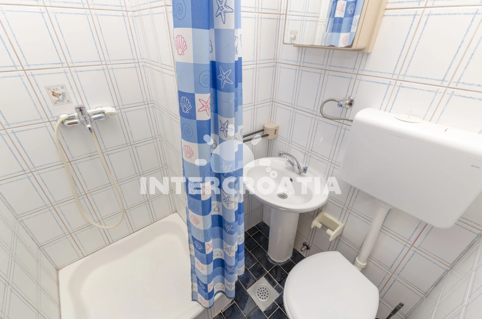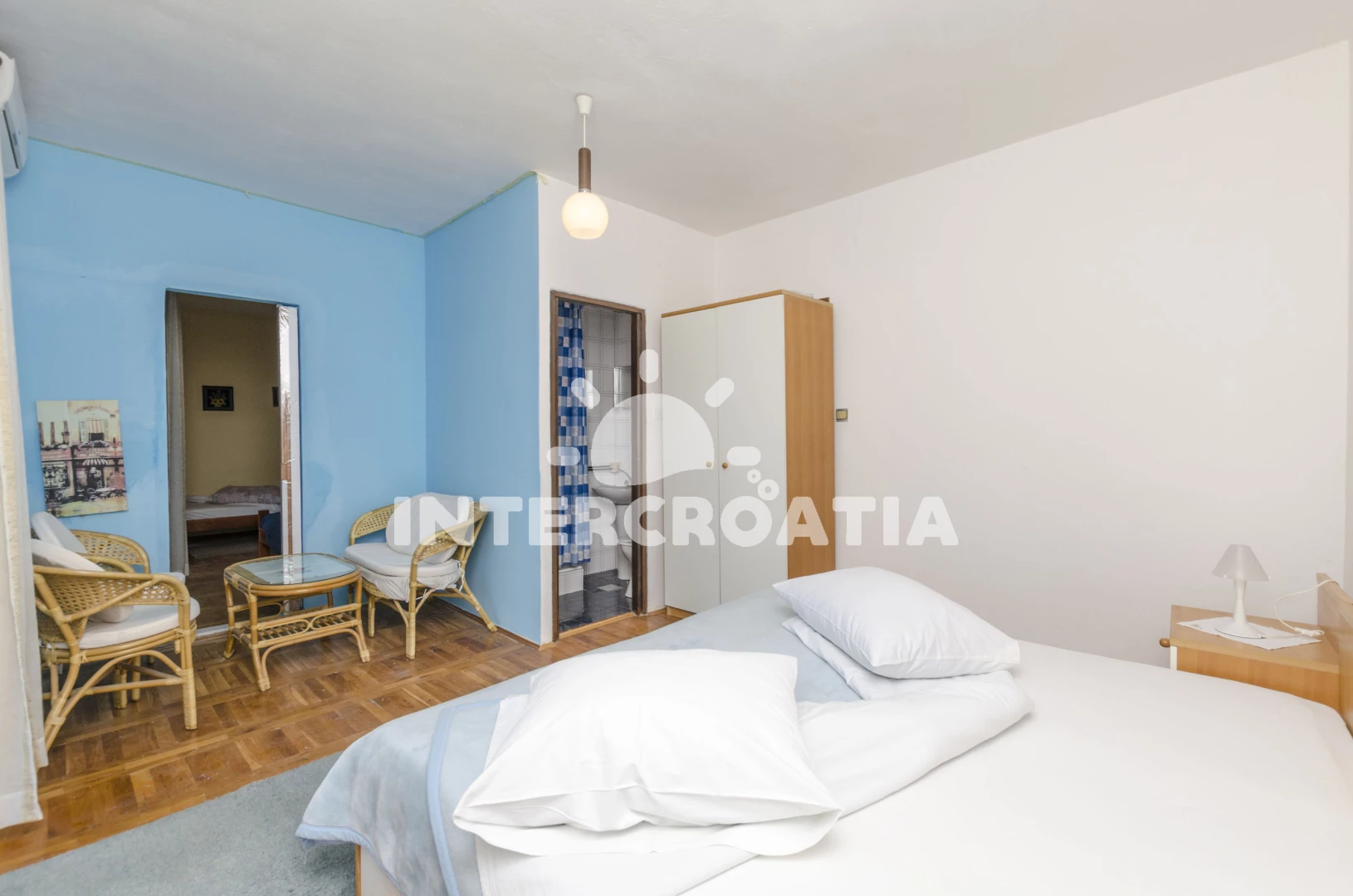 Apartmán (40 m2) s balkonem, posezením a výhledem na moře se nachází v 1. patře domu. Apartmán má 2 místnosti, 2 koupelny a je vhodný pro až 4 osoby. Kuchyňská linka je vybavena dvouplotýnkovým vařičem, rychlovarnou konvicí, mikrovlnnou troubou, nádobím a lednicí s mrazákem. První místnost se dvěma jednolůžky, klimatizací a vstupem na balkon. Druhá místnost s dvoulůžkem a vstupem na balkon. První i druhá koupelna se sprchovým koutem, umyvadlem a wc. Hostům je k dispozici parkování u objektu zdarma.