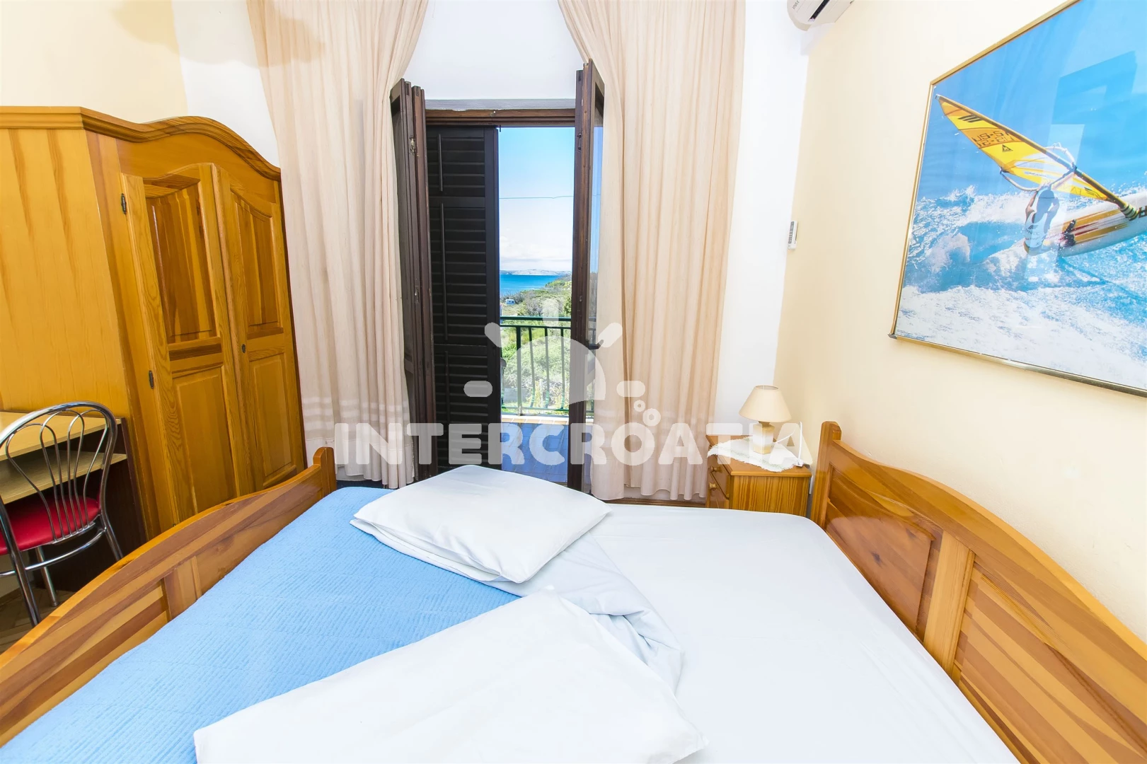 Apartmán (16 m2) typu studio s balkonem, posezením a výhledem na moře se nachází v 1. patře domu. Apartmán má 1 místnost a je vhodný pro 2 osoby. Kuchyňská linka je vybavena dvouplotýnkovým vařičem, rychlovarnou konvicí, mikrovlnnou troubou, nádobím a lednicí s mrazákem. Obývací místnost s jídelním stolem, dvoulůžkem, klimatizací a vstupem na balkon. Koupelna se sprchovým koutem, umyvadlem a wc. Hostům je k dispozici parkování u objektu zdarma.