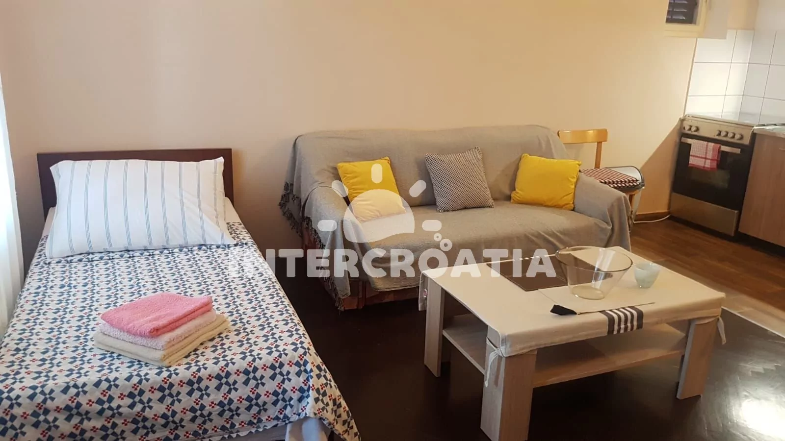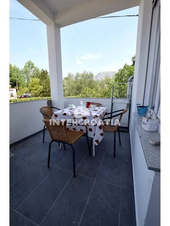 Apartmán s terasou a posezením se nachází v přízemí domu a je vhodný pro 2 až 5 osob. Obývací pokoj je spojený s kuchyní. Kuchyňská linka se sporákem, troubou, rychlovarnou konvicí, nádobím a lednicí s mrazákem. Obývací pokoj s jídelním stolem pro 4 osoby, rozložitelnou pohovkou (extra lůžko pro 2 osoby), jednou přistýlkou (lůžko pro 1 osobu), televizí se satelitním programem, klimatizací a vstupem na terasu. Ložnice je vybavena jedním dvoulůžkem. Koupelna se sprchovým koutem, umyvadlem a wc. Hostům je k dispozici parkování u objektu zdarma.
