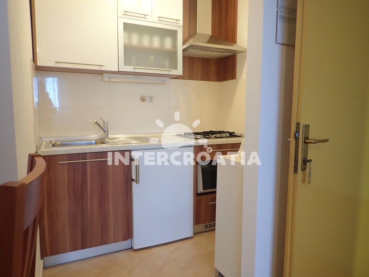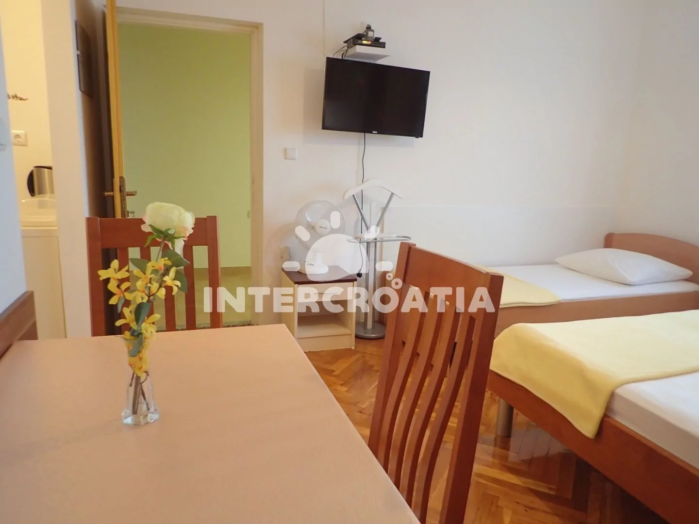 Apartmán v přízemí vily je vhodný pro 2 až 3 osoby. Obývací místnost je spojena s kuchyní. Kuchyňská linka je vybavena sporákem, digestoří, mikrovlnnou troubou, rychlovarnou konvicí, nádobím a lednicí s mrazákem. Obývací místnost s jídelním stolem pro 3 osoby, televizí se satelitním programem, dvoulůžkem a jedním jednolůžkem. Koupelna se sprchovým koutem, umyvadlem a wc. Hostům je k dispozici parkování u objektu zdarma.
