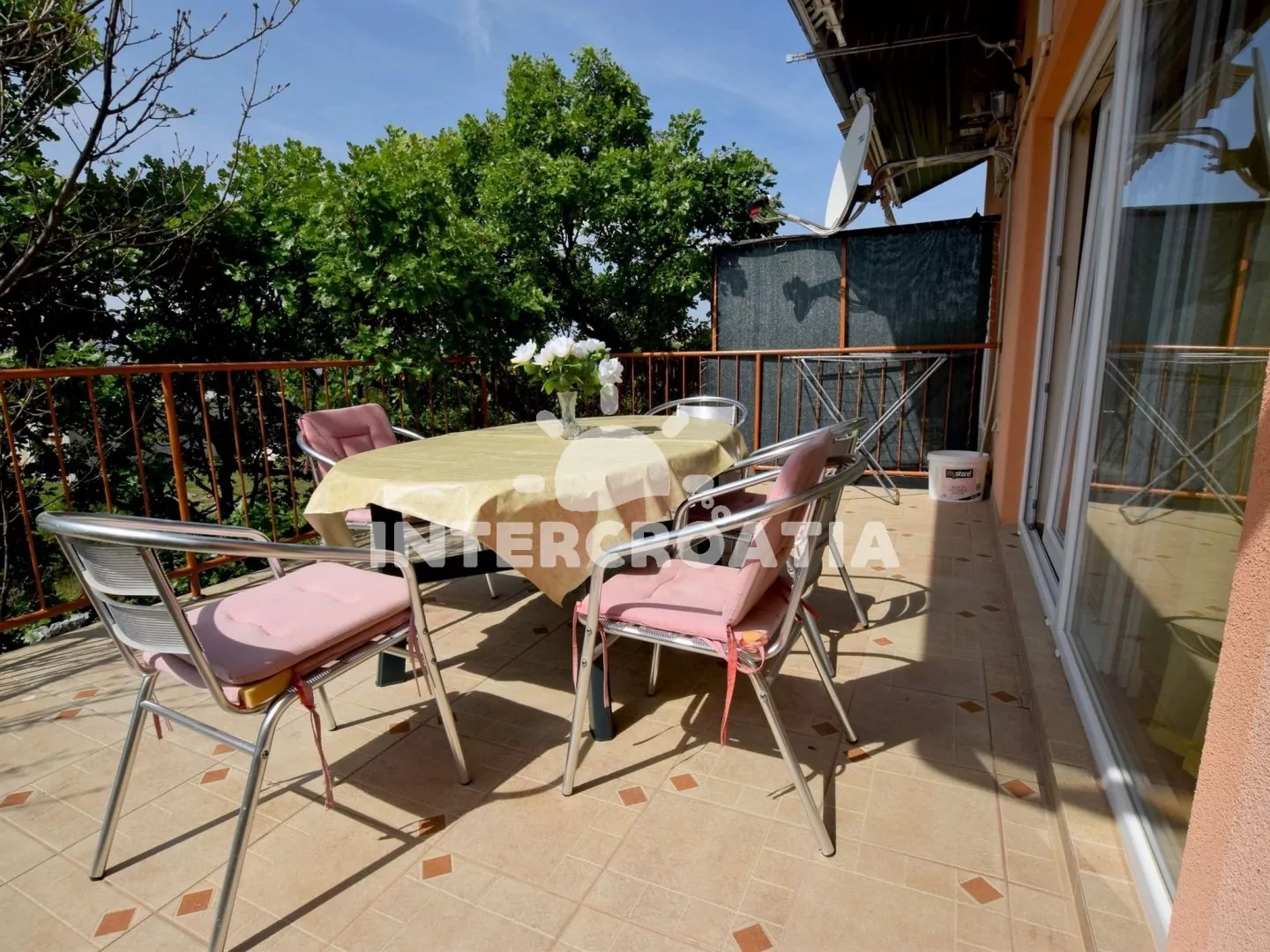 Dobře vybavený apartmán s terasou, výhledem na moře a zahrady. Apartmán se nachází v prvním patře domu a je vhodný pro až 4 osoby. Obývací pokoj je spojený s kuchyní. Kuchyňská linka je vybavena sporákem, troubou, mikrovlnnou troubou, nádobím a lednicí s mrazákem. Obývací pokoj s jídelním stolem pro 4 osoby, dvěma přistýlkami (lůžka pro 2 osoby), televizí se satelitním programem, klimatizací a vstupem na terasu. Ložnice s jedním dvoulůžkem. Koupelna se sprchovým koutem, umyvadlem a wc. Hostům je k dispozici parkování u objektu zdarma.