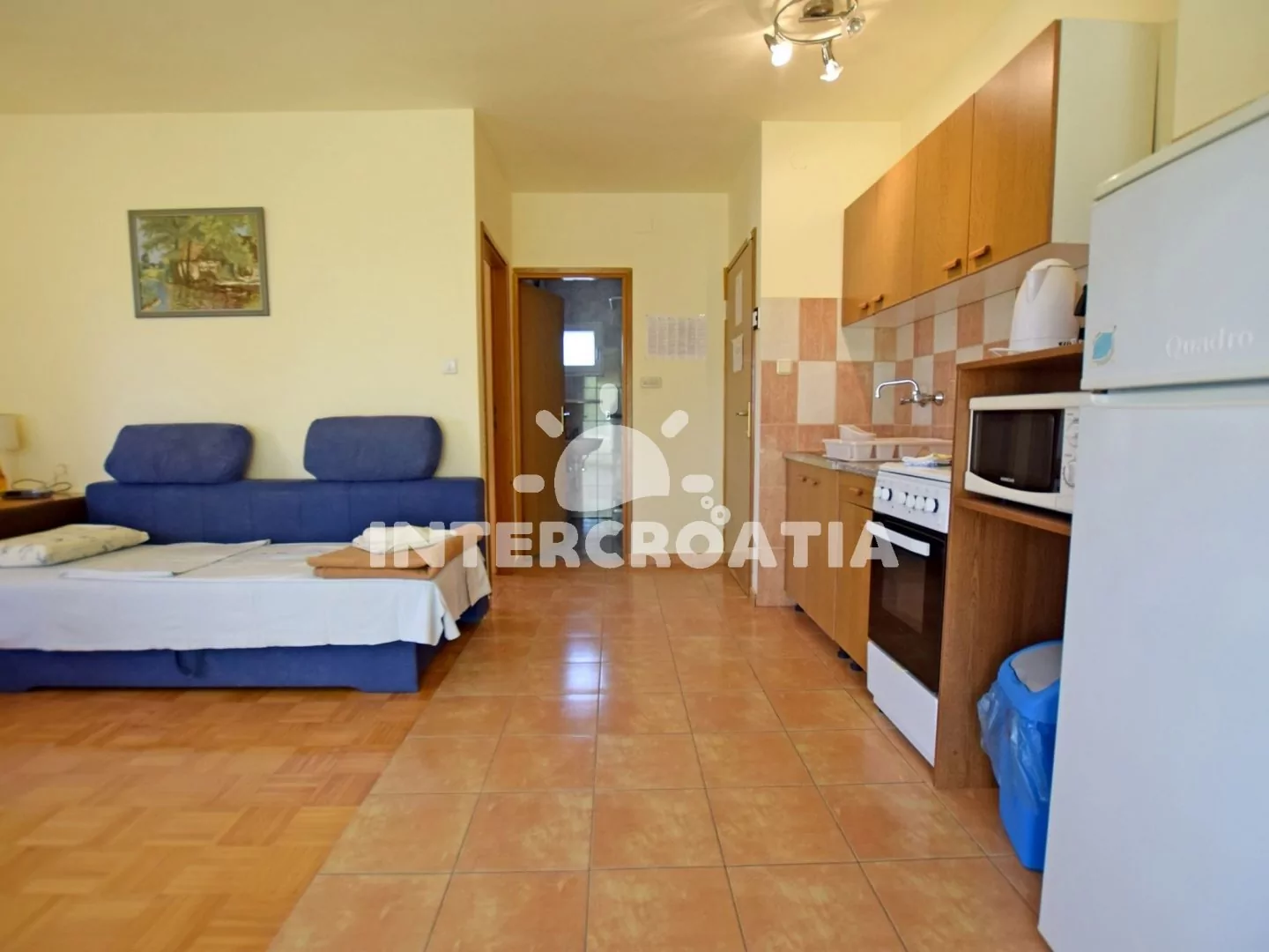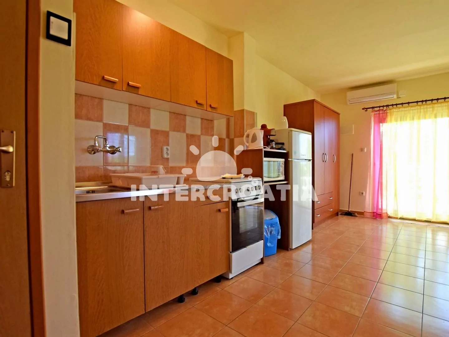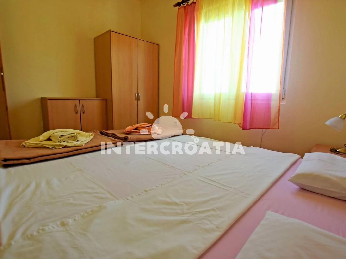 Apartmán s terasou, výhledem na moře a zahrady se nachází v prvním patře domu a je vhodný pro až 4 osoby. Obývací pokoj je spojený s kuchyní. Kuchyňská linka je vybavena sporákem, troubou, mikrovlnnou troubou, nádobím a lednicí s mrazákem. Obývací pokoj s jídelním stolem pro 4 osoby, dvěma přistýlkami (lůžka pro 2 osoby), televizí se satelitním programem, klimatizací a vstupem na terasu. Ložnice s jedním dvoulůžkem. Koupelna se sprchovým koutem, umyvadlem a wc. Hostům je k dispozici parkování u objektu zdarma.