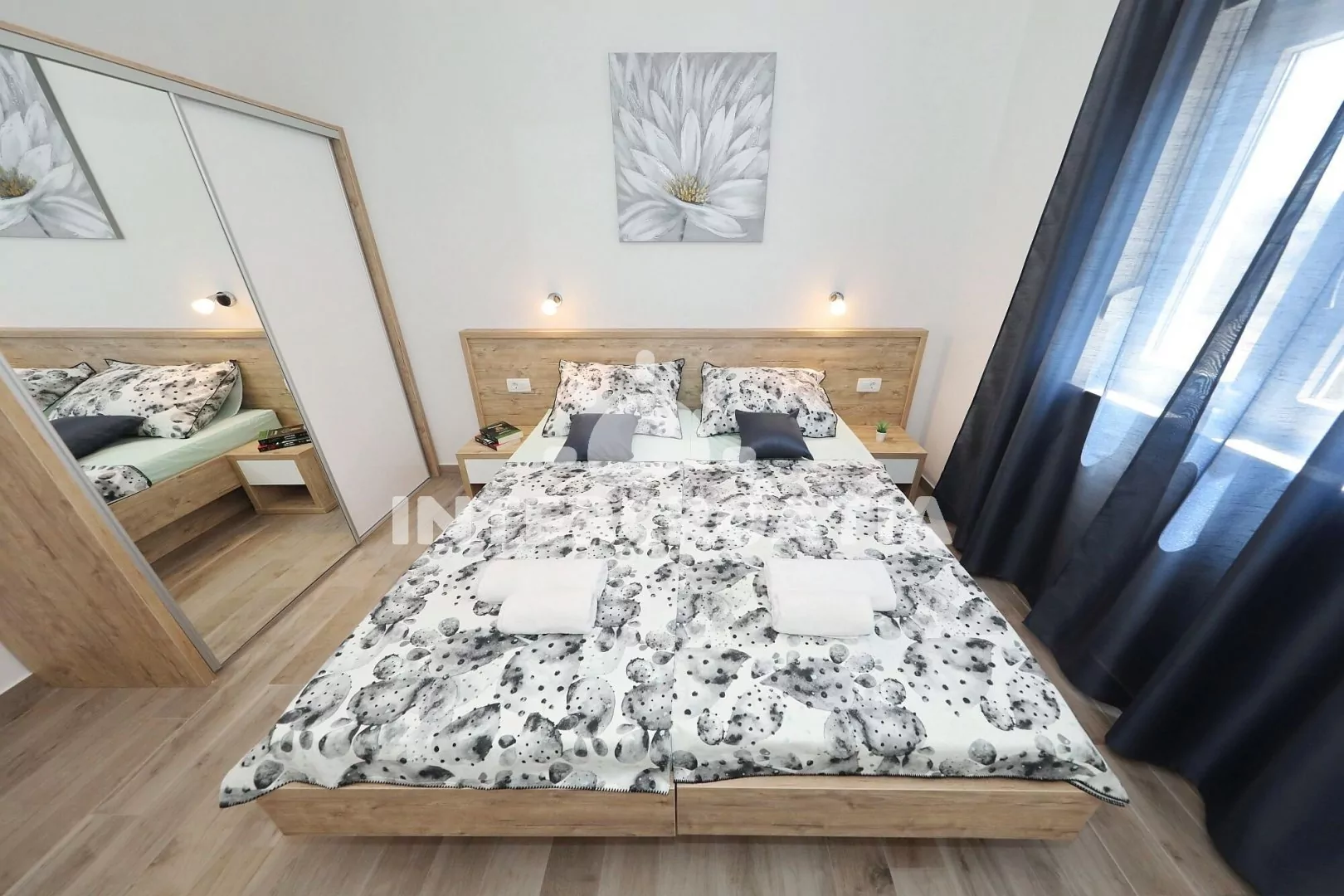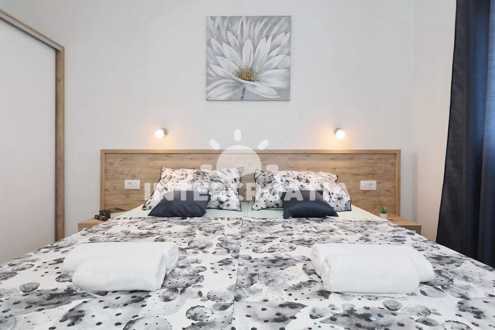 Luxusní apartmán (80 m2) s vlastní terasou, balkonem a výhledem na moře se nachází v 1. patře vily a je vhodný pro 4 až 6 osob. Obývací pokoj je spojený s kuchyní. Kuchyňská linka je vybavena sklokeramickou varnou deskou, digestoří vestavěnou troubou, myčkou na nádobí, mikrovlnnou troubou, rychlovarnou konvicí, kávovarem, toustovačem, nádobím a lednicí s mrazákem. Obývací pokoj s jídelním stolem pro 6 osob, pohovkou (rozložitelná na extra lůžko pro 2 osoby), televizí se satelitním programem, klimatizací a vstupem na balkon. První i druhá ložnice je vybavena vždy s jedním dvoulůžkem a klimatizací. Koupelna se sprchovým koutem, umyvadlem, pračkou, fénem a wc. Dále samostatné wc s umyvadlem. Hostům je k dispozici parkování u objektu zdarma.