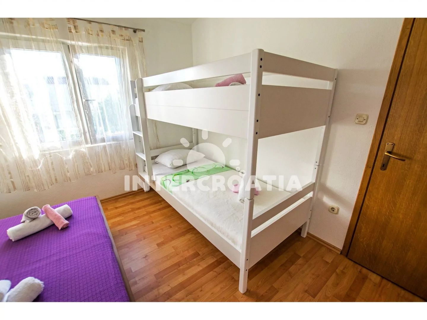Apartmán (80 m2) s vlastním balkonem a posezením se nachází v 1. patře vily a je vhodný pro až 7 osob. Obývací pokoj je spojený s kuchyní. Kuchyňská linka je vybavena sklokeramickou varnou deskou, digestoří, vestavěnou troubou, myčkou na nádobí, mikrovlnnou troubou, rychlovarnou konvicí, kávovarem, nádobím a lednicí s mrazákem. Obývací pokoj s jídelním stolem pro 6 osob, pohovkou (rozložitelná na extra lůžko pro 1 osobu), televizí se satelitním programem a vstupem na balkon. První ložnice s dvoulůžkem a patrovou postelí (lůžka pro 2 osoby). Druhá ložnice s dvěma jednolůžky. První koupelna se sprchovým koutem, umyvadlem, pračkou a wc. Druhá koupelna se sprchovým koutem, umyvadlem a wc. Hostům je k dispozici parkování u objektu zdarma.