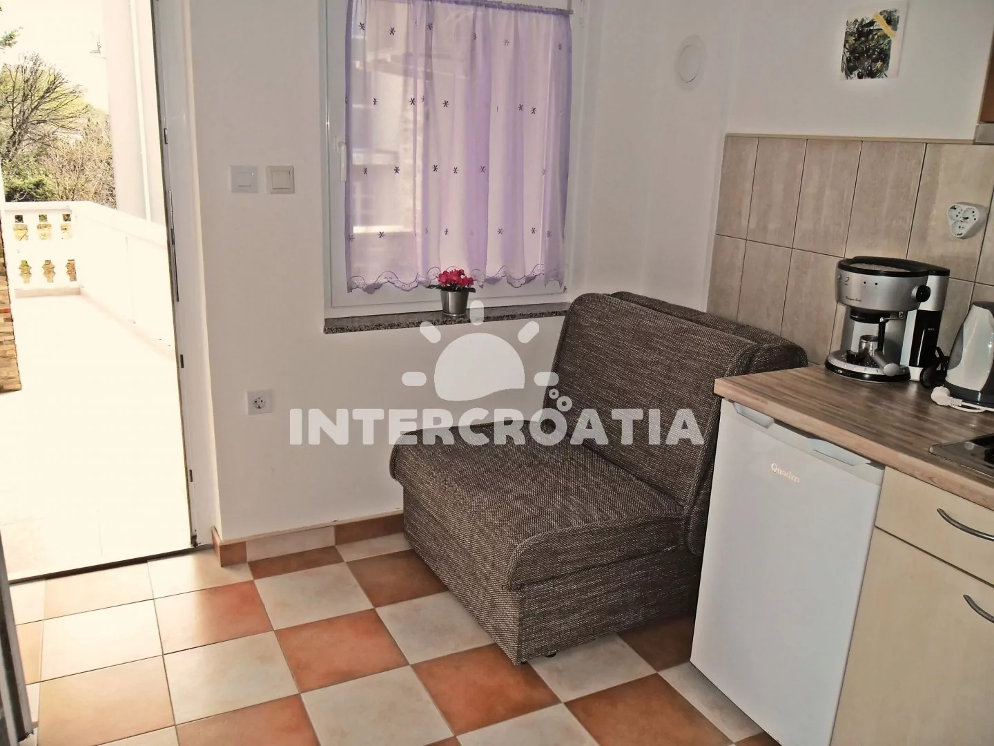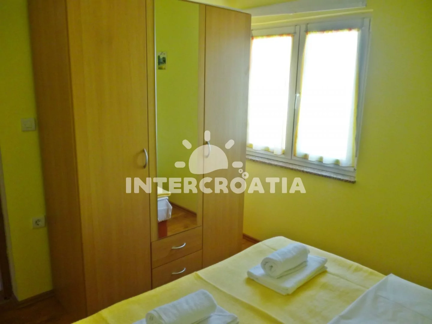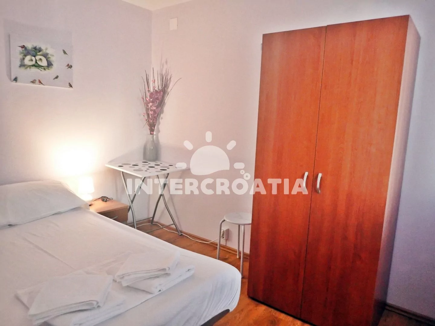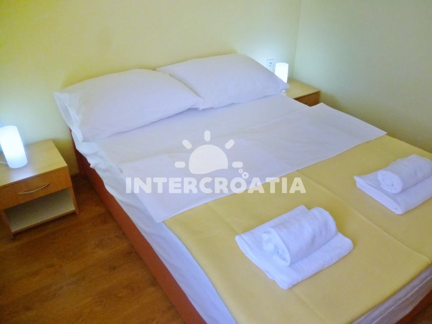 Apartmán (50 m2) s terasou, výhledem na moře a klidnou ulici se nachází v 1. patře domu a je vhodný pro 3 osoby. Obývací pokoj je spojený s kuchyní. Kuchyňská linka je vybavena dvouplotýnkovým vařičem, digestoří, mikrovlnnou troubou, myčkou na nádobí, rychlovarnou konvicí, kávovarem, nádobím a lednicí s mrazákem. Obývací pokoj s jídelním stolem pro 4 osoby, pohovkou, televizí se satelitním programem, klimatizací a vstupem na terasu. První ložnice s dvoulůžkem. Druhá ložnice s jedním jednolůžkem. Koupelna se sprchovým koutem, umyvadlem a wc. Hostům je k dispozici parkování u objektu zdarma.