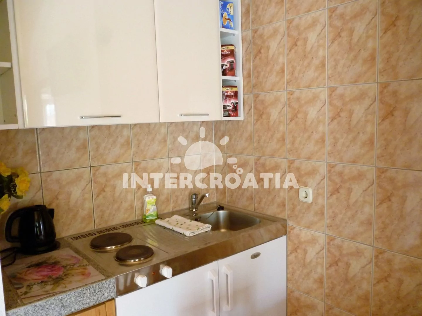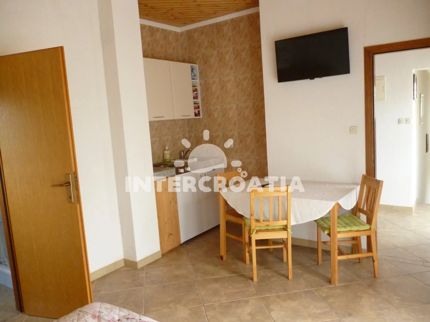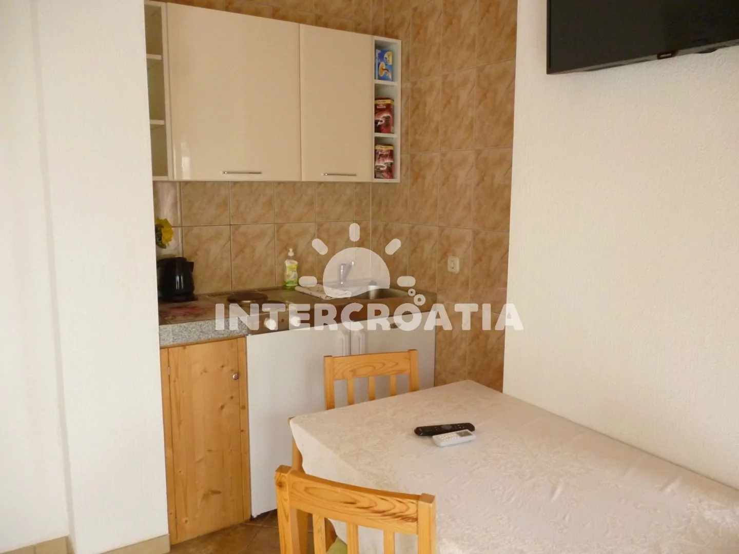 Apartmán (25 m2) typu studio s balkonem a venkovním posezením se nachází v 1. patře domu. Obývací místnost je spojena s kuchyní. Kuchyňská linka je vybavena dvouplotýnkovým vařičem, rychlovarnou konvicí, kávovarem, nádobím a lednicí s mrazákem. Obývací místnost s jídelním stolem, dvoulůžkem, televizí se satelitním programem, klimatizací a vstupem na balkon. Koupelna se sprchovým koutem, umyvadlem a wc. Hostům je k dispozici parkování u objektu zdarma.