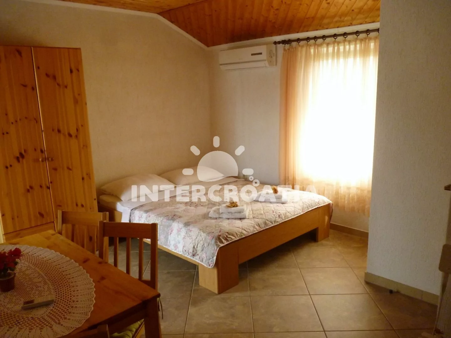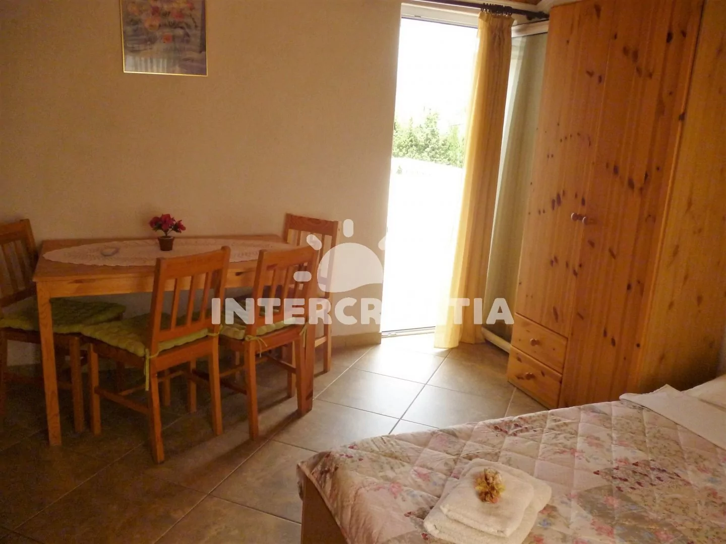Apartmán (22 m2) typu studio s terasou a venkovním posezením se nachází v 1. patře domu. Obývací místnost je spojena s kuchyní. Kuchyňská linka je vybavena dvouplotýnkovým vařičem, rychlovarnou konvicí, kávovarem, nádobím a lednicí s mrazákem. Obývací místnost s jídelním stolem, dvoulůžkem, televizí se satelitním programem, klimatizací a vstupem na terasu. Koupelna se sprchovým koutem, umyvadlem a wc. Hostům je k dispozici parkování u objektu zdarma.