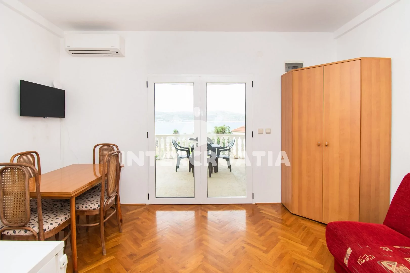 Apartmán (30 m2) s terasou, posezením a výhledem na moře se nachází v 1. patře domu. Apartmán má 1 ložnici a je vhodný pro až 3 osoby. Obývací pokoj je spojený s kuchyní. Kuchyňská linka je vybavena dvouplotýnkovým vařičem, rychlovarnou konvicí, nádobím a lednicí s mrazákem. Obývací pokoj s jídelním stolem, pohovkou, televizí se satelitním programem, klimatizací a vstupem na terasu. Ložnice s dvoulůžkem a jedním jednolůžkem. Koupelna se sprchovým koutem, umyvadlem a wc. Hostům je k dispozici parkování u objektu zdarma.