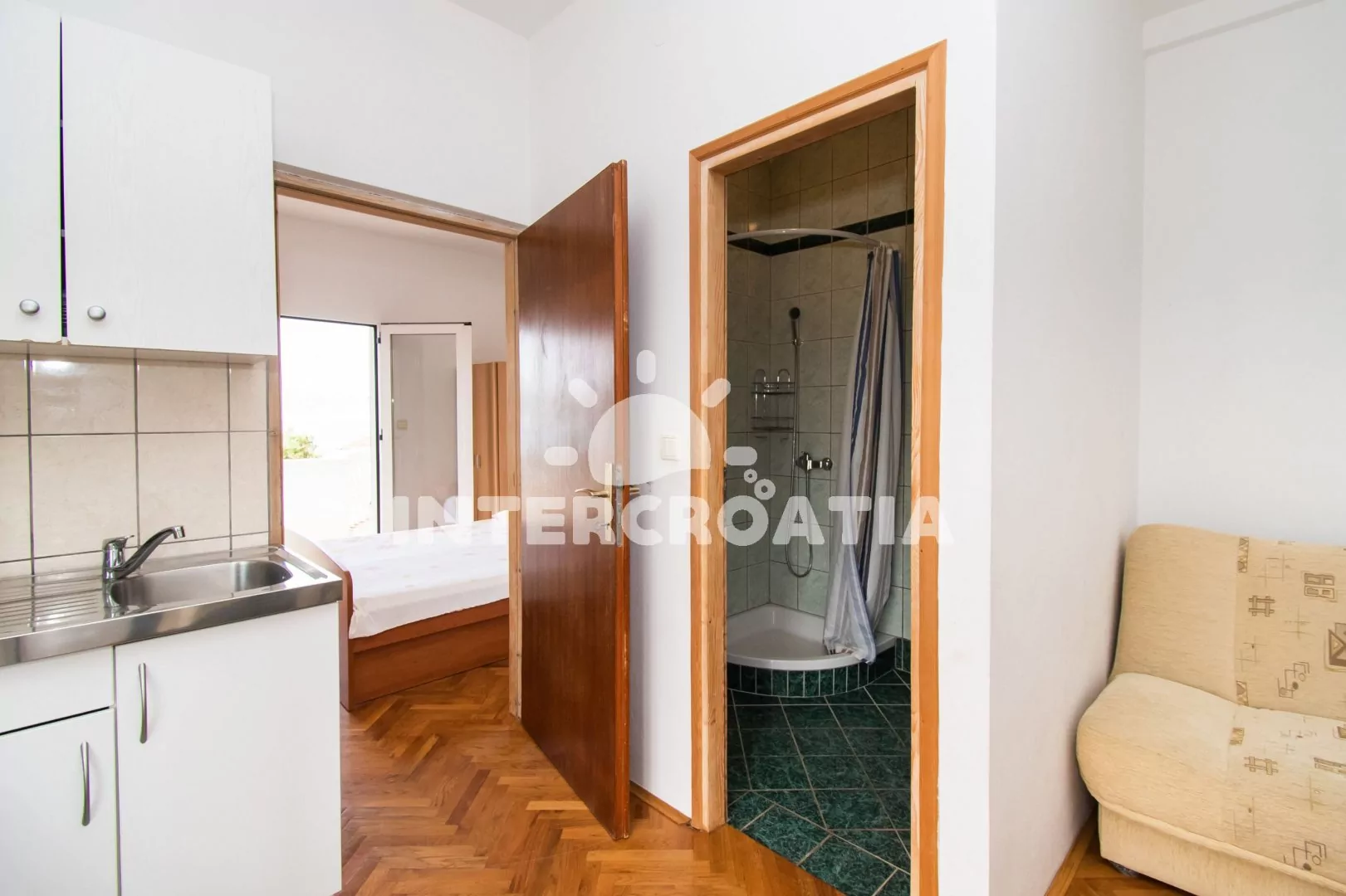 Vzdálenosti: Moře a betonová-oblázková pláž 80 m, obchod s potravinami 600 m, centrum 300 m, restaurace, bar a směnárna 350 m, park Plitvice 1 km, pošta, banka, ambulance, přístav a lékárna 2,7 km, trajekt (Zadar) 40 km, letiště (Zadar) 40 km.
