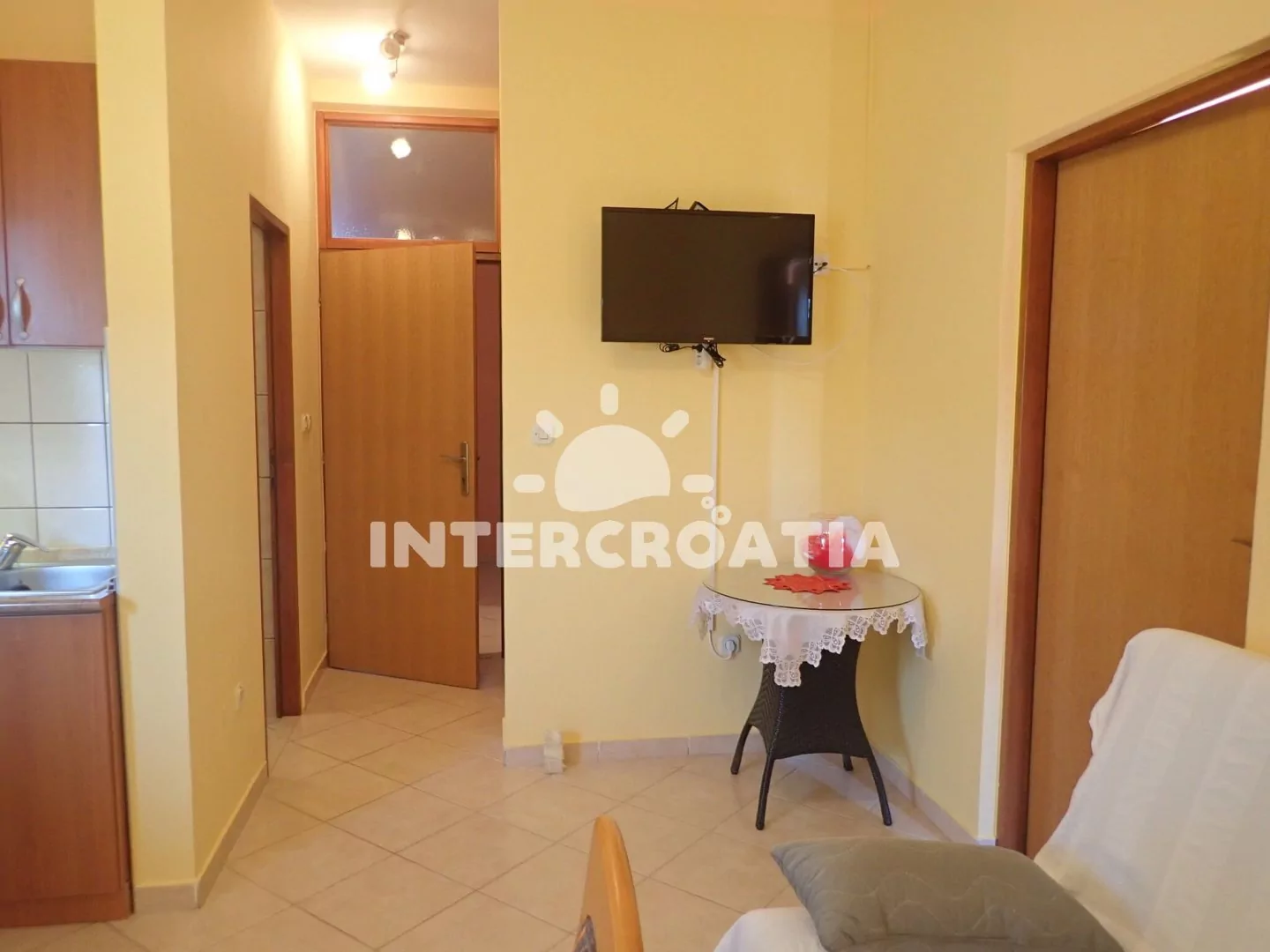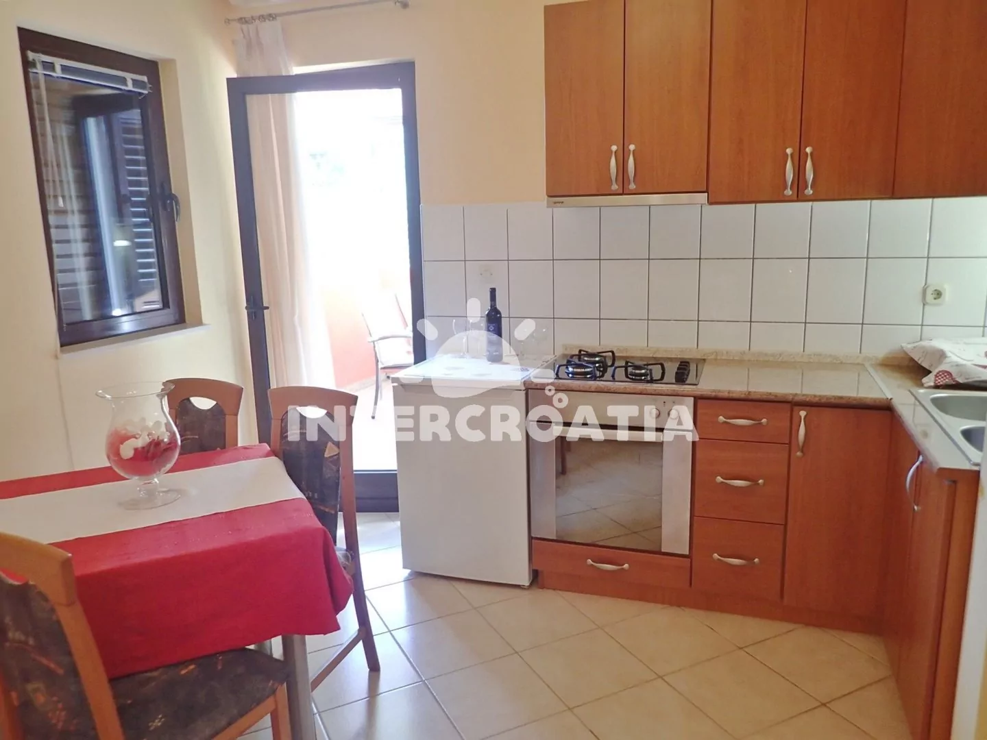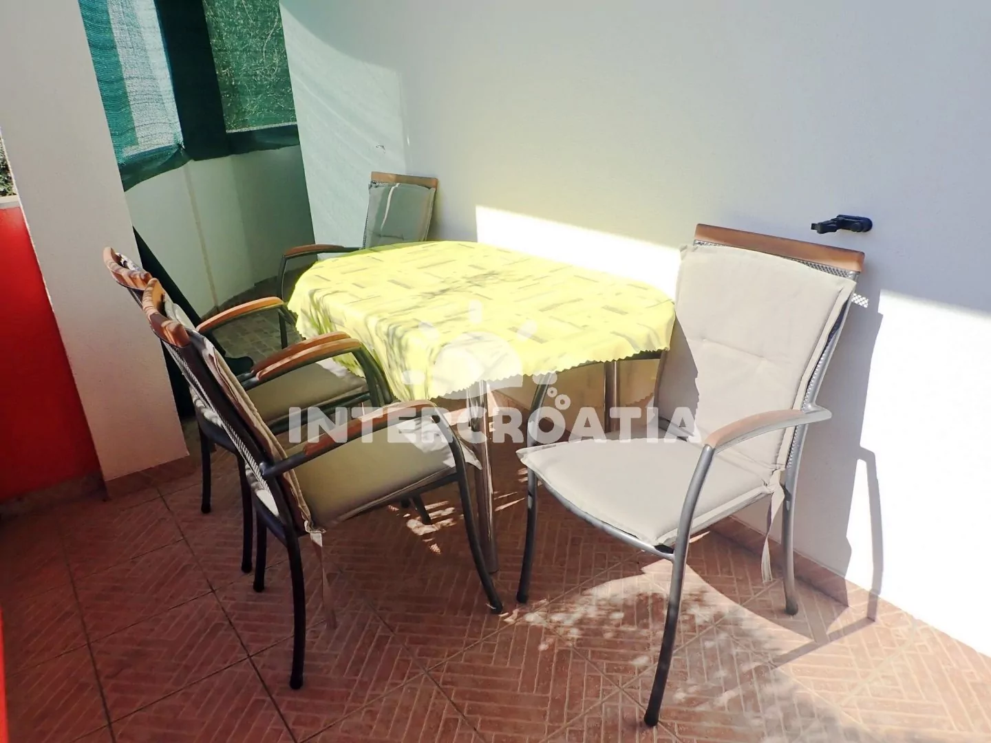 Apartmán (35 m2) s terasou a venkovním posezením se nachází ve zvýšeném přízemí domu. Apartmán má 1 ložnici a je vhodný pro až 3 osoby. Obývací pokoj je spojený s kuchyní. Kuchyňská linka je vybavena varnou deskou, digestoří, vestavěnou troubou, nádobím a lednicí s mrazákem. Obývací pokoj s jídelním stolem, pohovkou (rozložitelná na extra lůžko pro 1 osobu), televizí se satelitním programem, klimatizací a vstupem na terasu. Ložnice s dvoulůžkem a vstupem na balkon. Koupelna se sprchovým koutem, umyvadlem a wc. Hostům je k dispozici parkování u objektu zdarma.