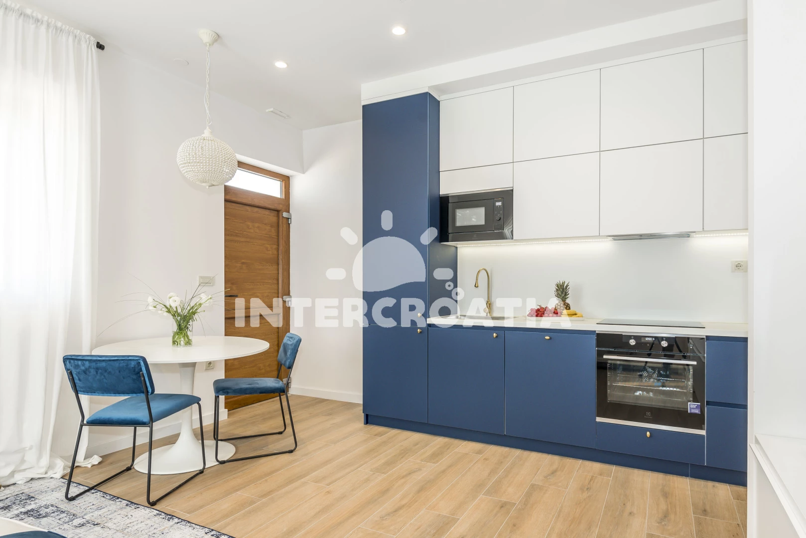Apartmán (40 m2) s terasou a venkovním posezením se nachází v 1. patře domu. Apartmán má 1 ložnici a je vhodný pro 2 osoby. Obývací pokoj je spojený s kuchyní. Kuchyňská linka je vybavena sklokeramickou varnou deskou, digestoří, vestavěnou troubou, myčkou na nádobí, rychlovarnou konvicí, mikrovlnnou troubou, kávovarem, nádobím a lednicí s mrazákem. Obývací pokoj s jídelním stolem, pohovkou, televizí se satelitním programem, klimatizací a vstupem na terasu. Ložnice s dvoulůžkem a sejfem. Koupelna se sprchovým koutem, umyvadlem, fénem, pračkou a wc. Hostům je k dispozici parkování u objektu zdarma.
