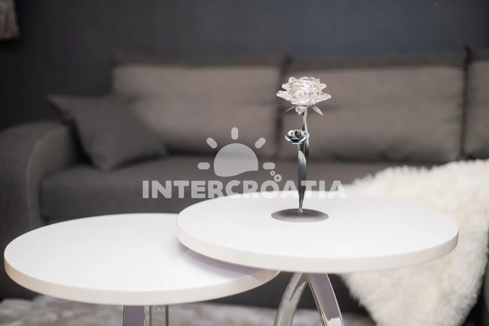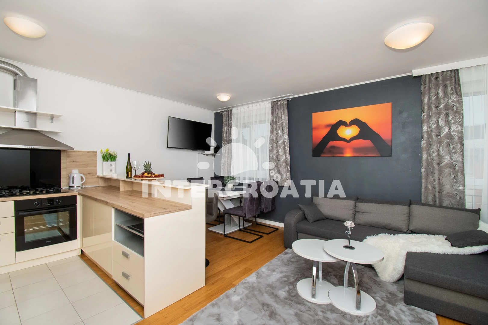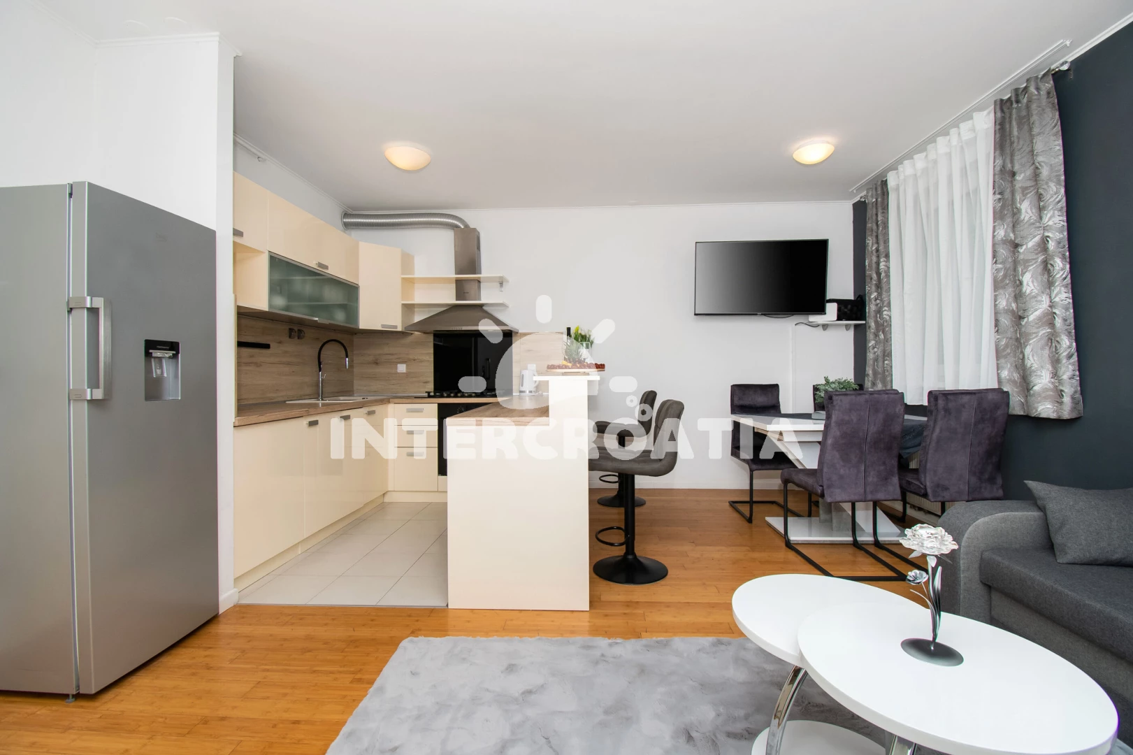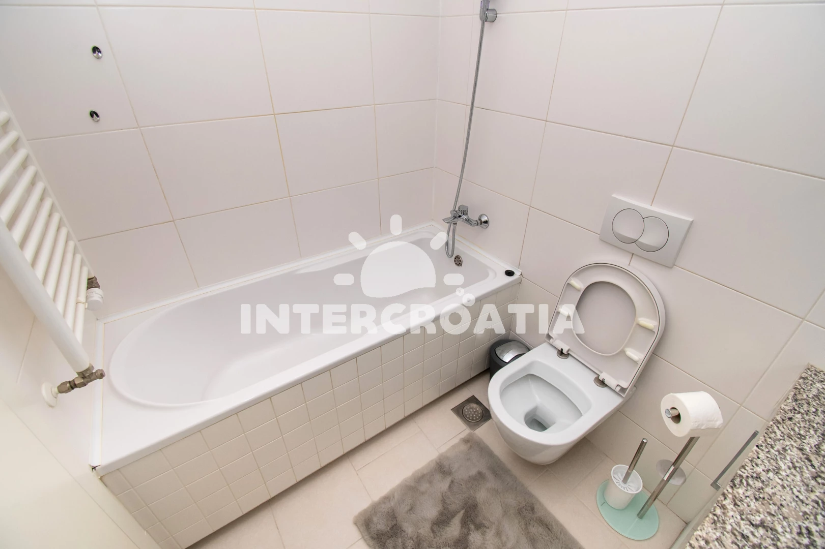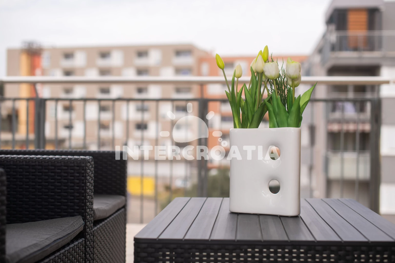 Prostorný - 2 ložnice, vybavená kuchyň, velmi pěkná terasa s posezením, uzavíratelné parkování v garáži pod domem, 8 minut autem k moři, výhoda - obchod LIDL 250m. Samobsluha 100m.