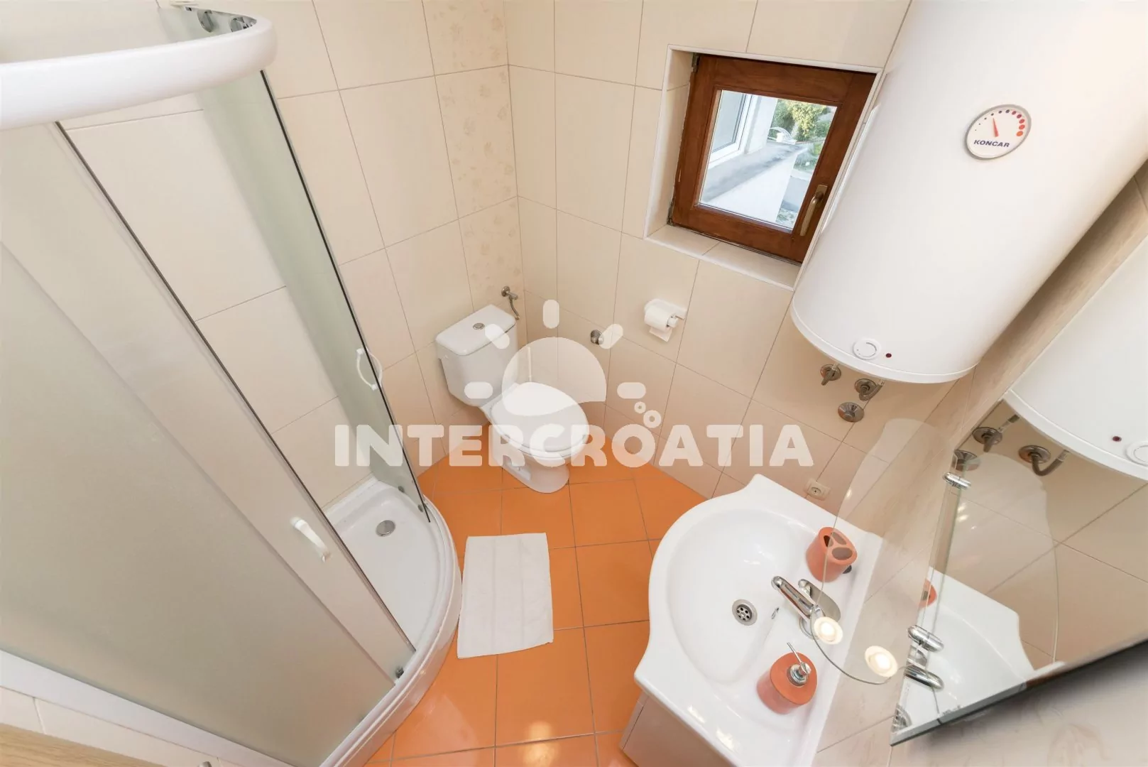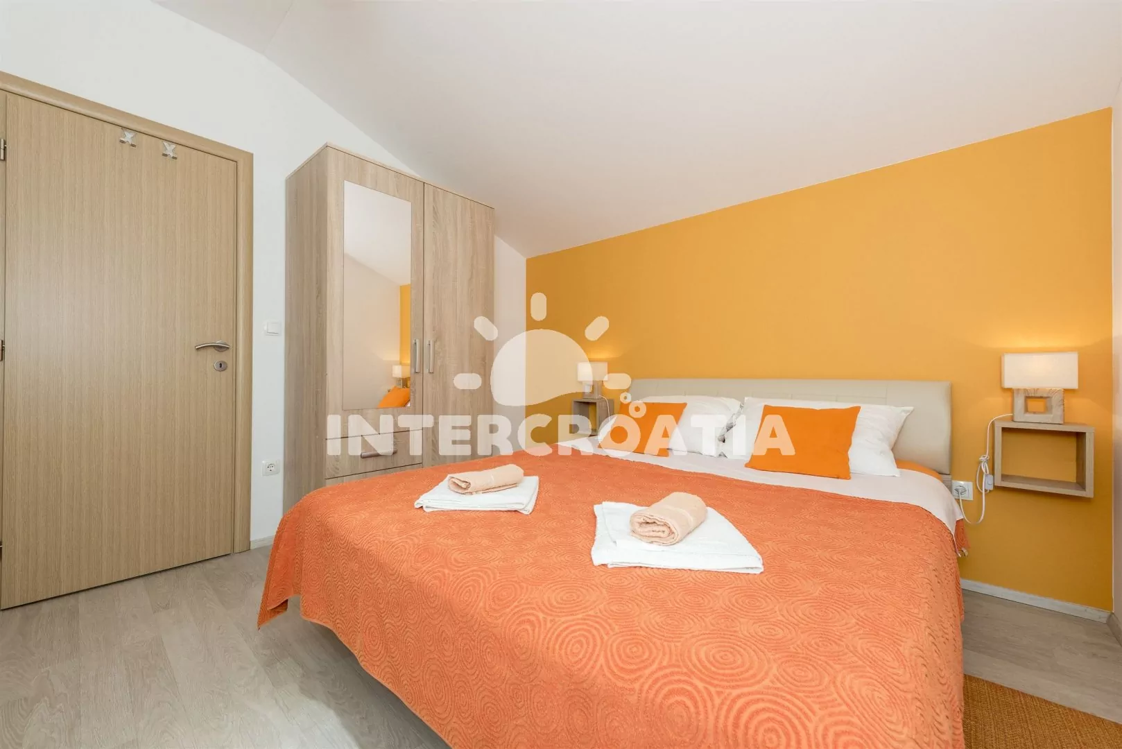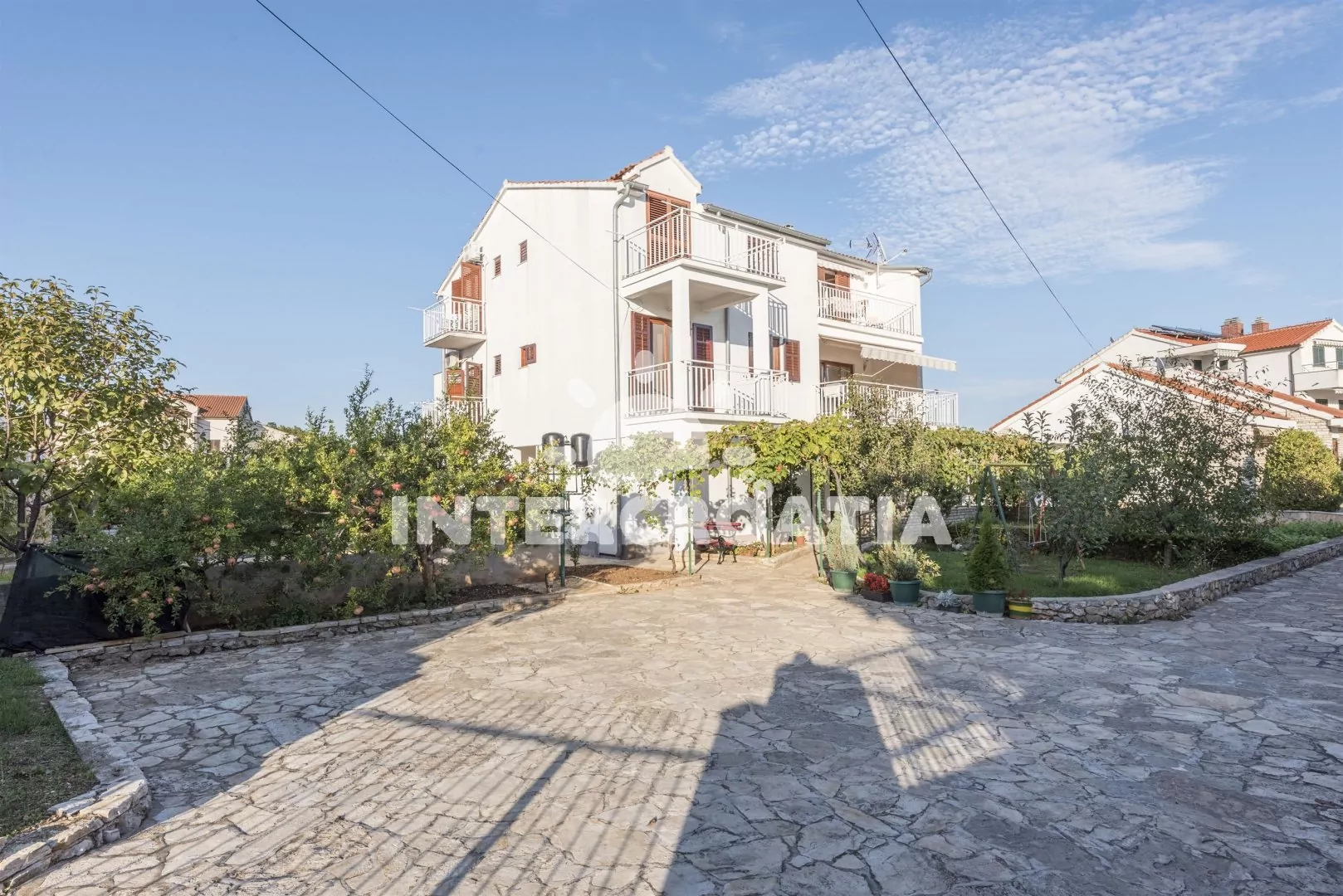Dvoupatrová vilka s moderním vybavením a velkým pozemkem se zahradou, grilem a parkovacími místy. Z vilky je výhled na moře a do zahrady, apartmány s balkony a venkovním posezením.