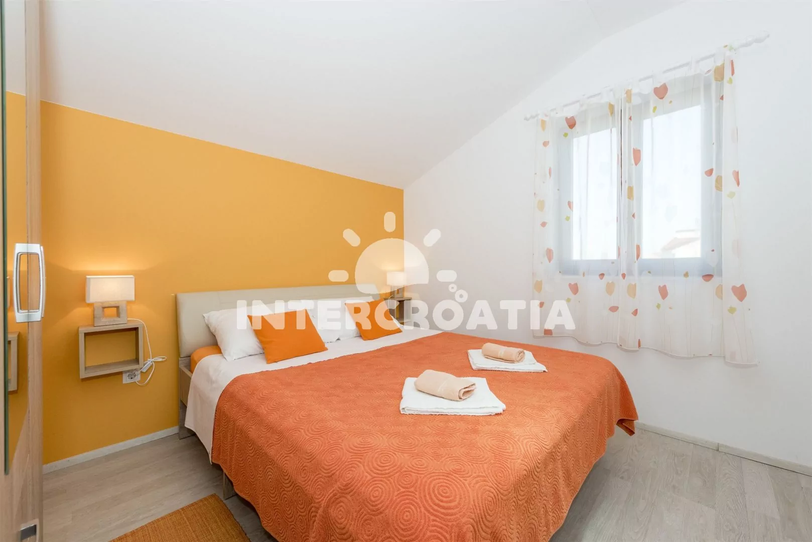 Hezky zařízený apartmán v druhém patře vilky s balkonem a posezením. Apartmán je vhodný pro 4 až 5 osob. Obývací pokoj je spojený s kuchyní. Kuchyňská linka je vybavena se sklokeramickou varnou deskou, digestoří, rychlovarnou konvicí, nádobím a lednicí s mrazákem. Obývací pokoj s jídelním stolem pro 4 osoby, pohovkou (rozložitelná na extra lůžko pro 1 osobu), televizí se satelitním programem, klimatizací a vstupem na balkon. Dvě totožné ložnice, každá vybavena jedním dvoulůžkem. Koupelna se sprchovým koutem, umyvadlem, fénem a wc. Hostům je k dispozici parkování u objektu zdarma.