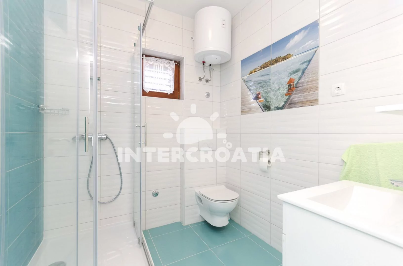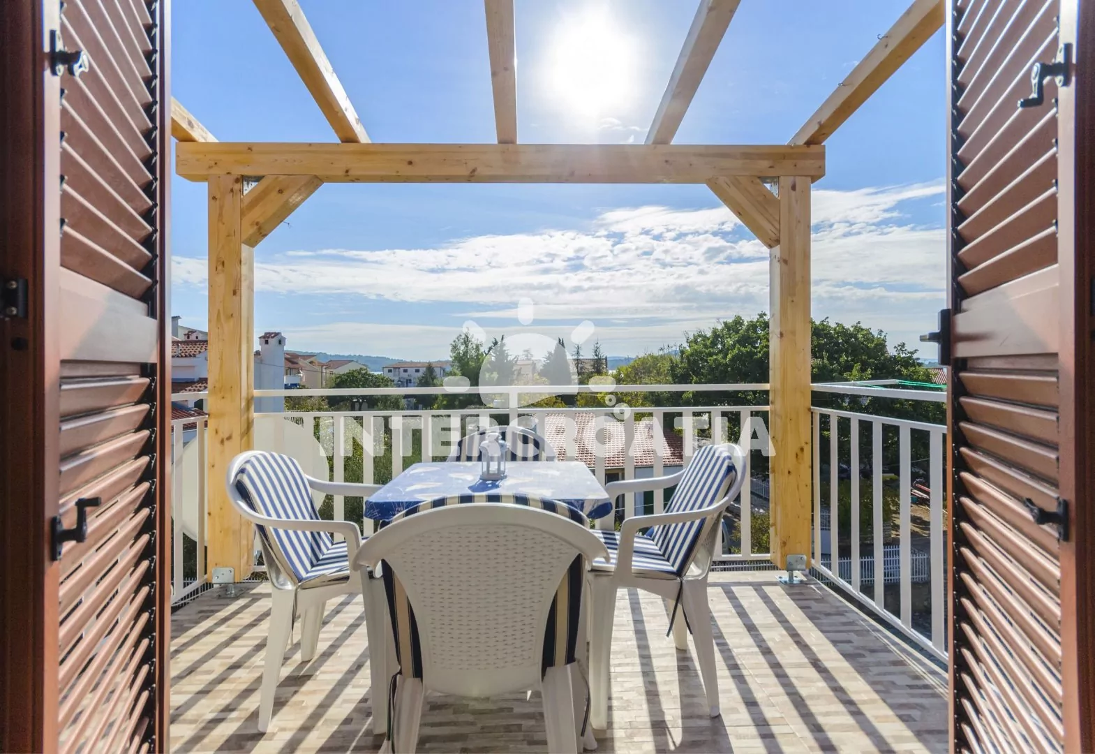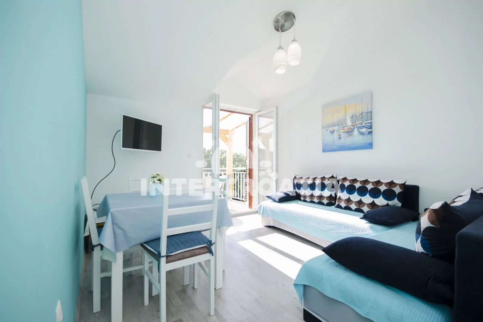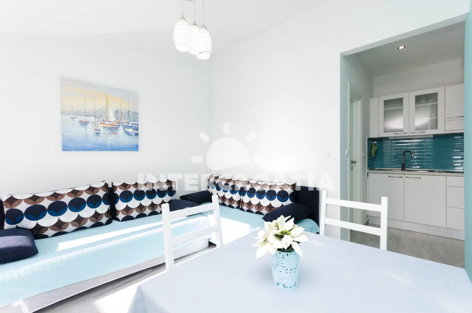 Apartmán v druhém patře vilky s terasou, posezením a výhledem na moře. Apartmán je vhodný pro 2 až 4 osoby. Obývací pokoj je spojený s kuchyní. Kuchyňská linka je vybavena se sklokeramickou varnou deskou, digestoří, rychlovarnou konvicí, nádobím a lednicí s mrazákem. Obývací pokoj s jídelním stolem pro 4 osoby, dvěma pohovkami (rozložitelné na extra lůžka pro 2 osoby), televizí se satelitním programem, klimatizací a vstupem na terasu. Ložnice je vybavena jedním dvoulůžkem. Koupelna se sprchovým koutem, umyvadlem, fénem a wc. Hostům je k dispozici parkování u objektu zdarma.