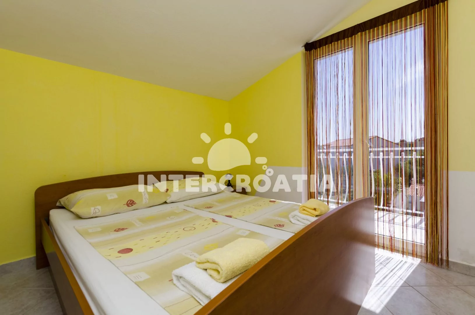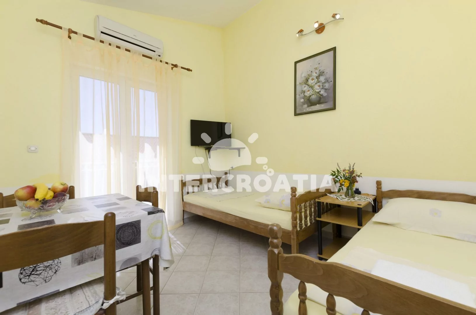 Apartmán s balkonem se nachází v druhém patře vily a je vhodný pro 2 až 4 osoby. Obývací pokoj je spojený s kuchyní. Kuchyňská linka je vybavena dvouplotýnkovým sporákem, kávovarem, rychlovarnou konvicí, nádobím a lednicí s mrazákem. Obývací pokoj s jídelním stolem pro 3 osoby, dvěma jednolůžky (extra lůžka pro 2 osoby), televizí se satelitním programem, klimatizací a vstupem na balkon. Ložnice s jedním dvoulůžkem a vstupem na balkon. Koupelna se sprchovým koutem, umyvadlem a wc. Hostům je k dispozici parkování u objektu zdarma.