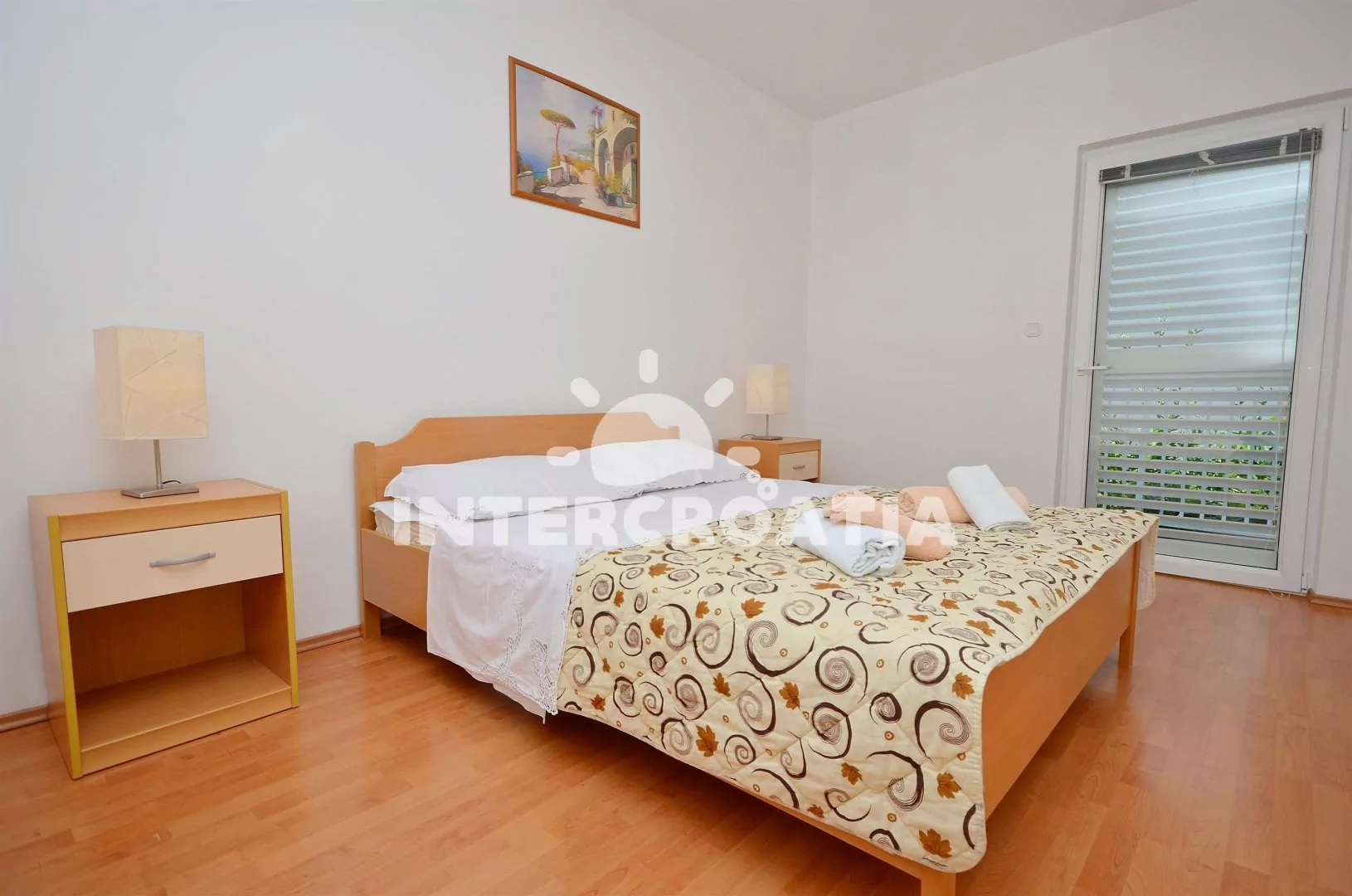 Apartmán (70 m2) s terasou a venkovním posezením se nachází v 1. patře domu. Apartmán má 2 ložnice a je vhodný pro 4 až 5 osob. Obývací pokoj je spojený s kuchyní. Kuchyňská linka je vybavena sklokeramickou varnou deskou, digestoří, vestavěnou troubou, rychlovarnou konvicí, toustovačem, nádobím a lednicí s mrazákem. Obývací pokoj s jídelním stolem pro 4 osoby, pohovkou (rozložitelná na extra lůžko pro 1 osobu), televizí, radiem, klimatizací a vstupem na terasu. První i druhá ložnice je vybavena vždy s jedním dvoulůžkem. Koupelna se sprchovým koutem, umyvadlem, fénem a wc. Dále samostatné wc s umyvadlem. Hostům je k dispozici parkování u objektu zdarma.