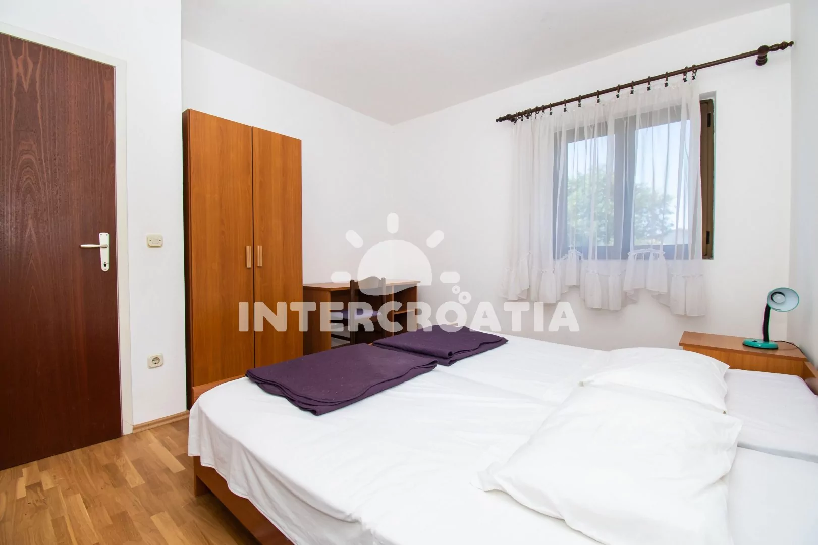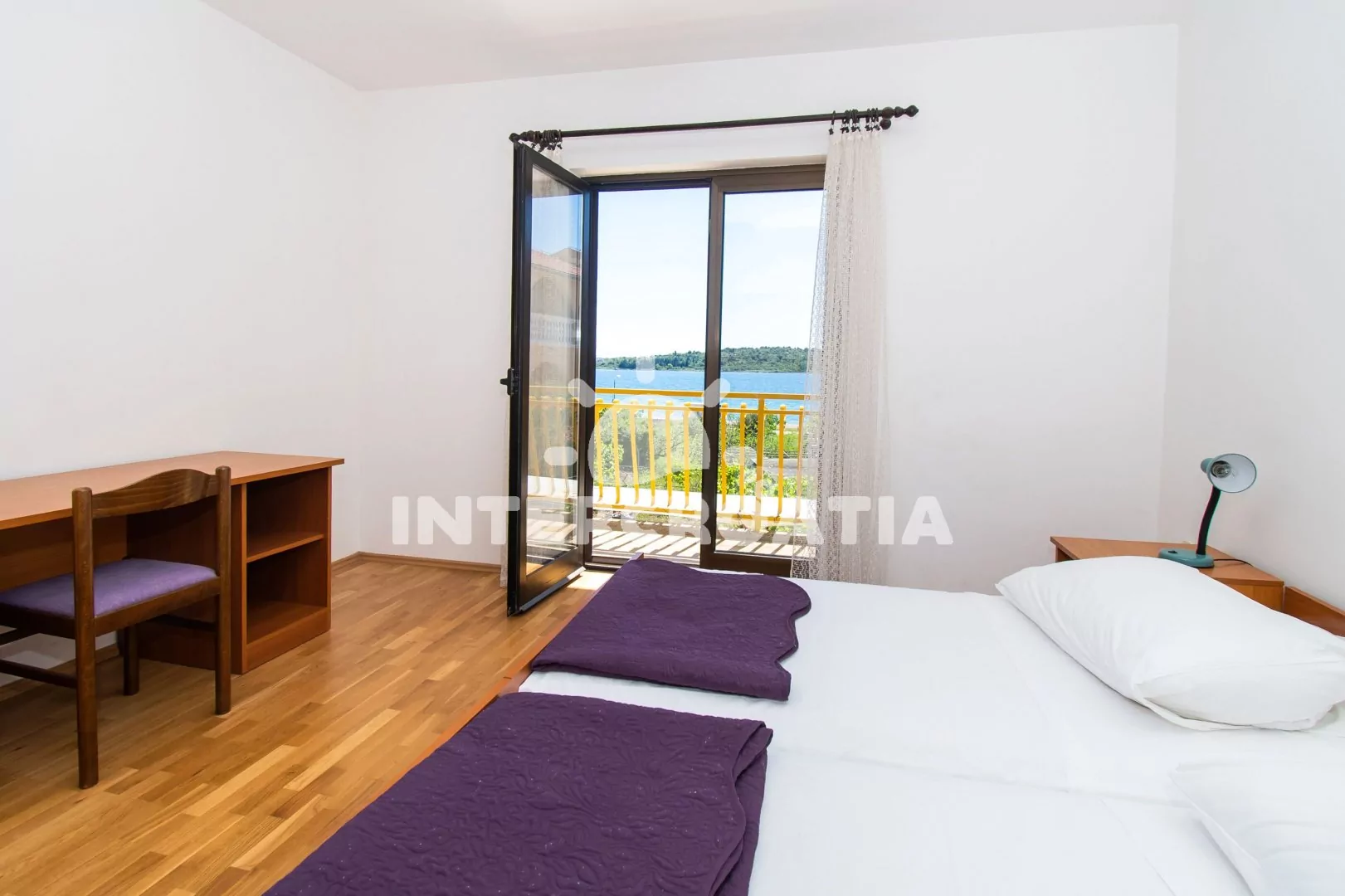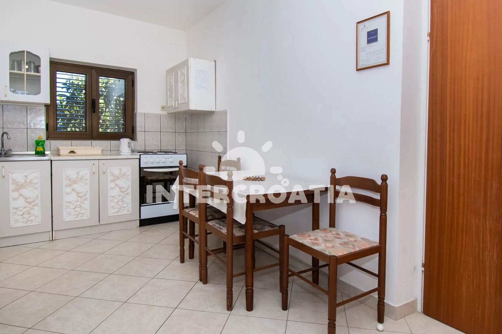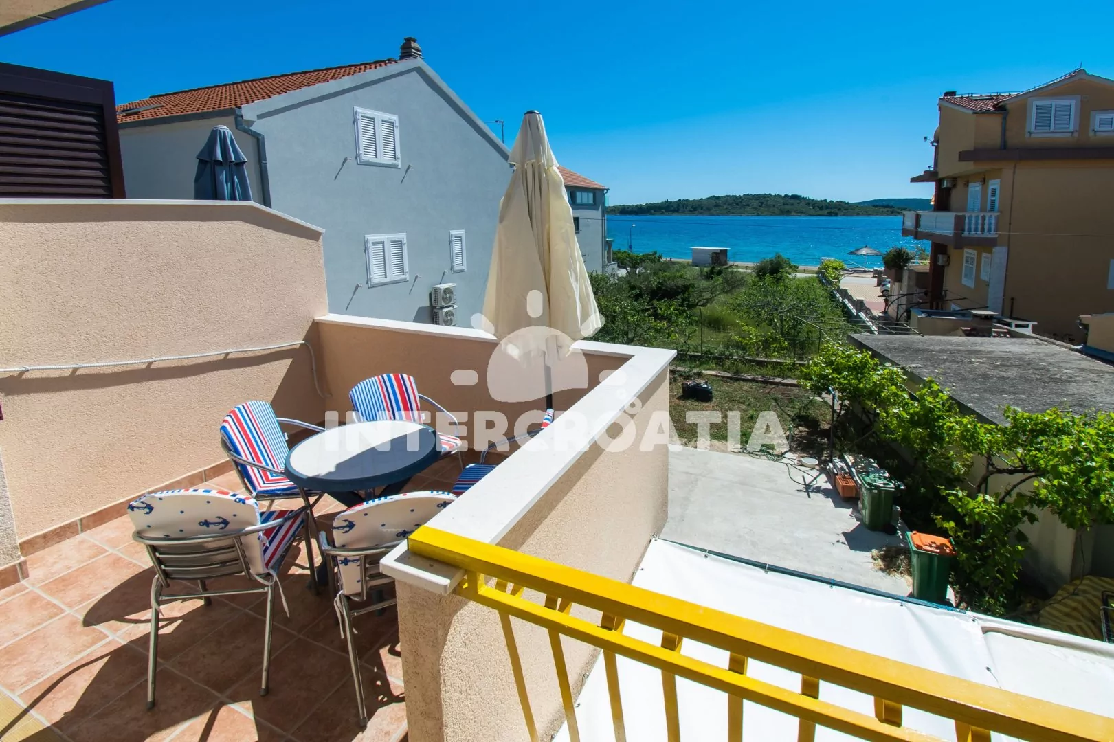 Apartmán (60 m2) s terasou, venkovním posezením a výhledem na moře se nachází v 1. patře domu. Apartmán má 2 ložnice a je vhodný pro 4 až 5 osob. Obývací pokoj je spojený s kuchyní. Kuchyňská linka je vybavena sporákem s troubou, nádobím a lednicí s mrazákem. Obývací pokoj s jídelním stolem, sedací soupravou s pohovkou (rozložitelná na extra lůžko pro 1 osobu), televizí, klimatizací a vstupem na terasu. První ložnice s dvoulůžkem a vstupem na terasu. Druhá ložnice s jedním dvoulůžkem. Koupelna se sprchovým koutem, umyvadlem a wc. Hostům je k dispozici parkování u objektu zdarma.