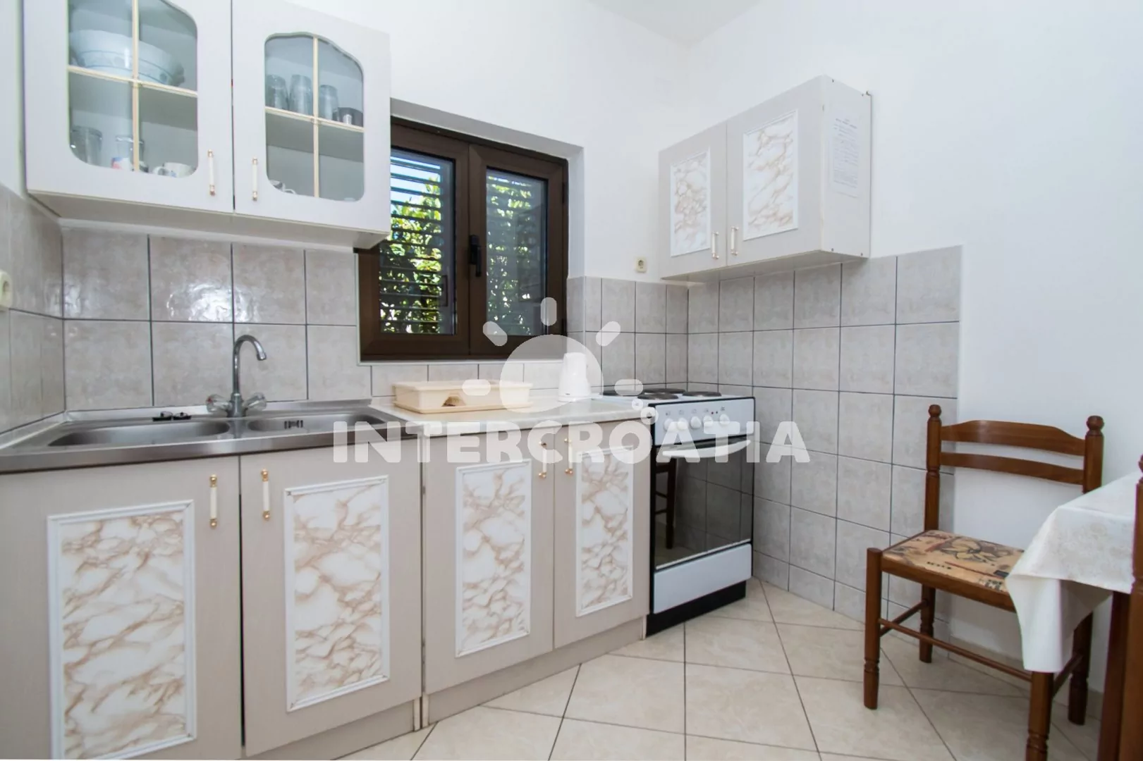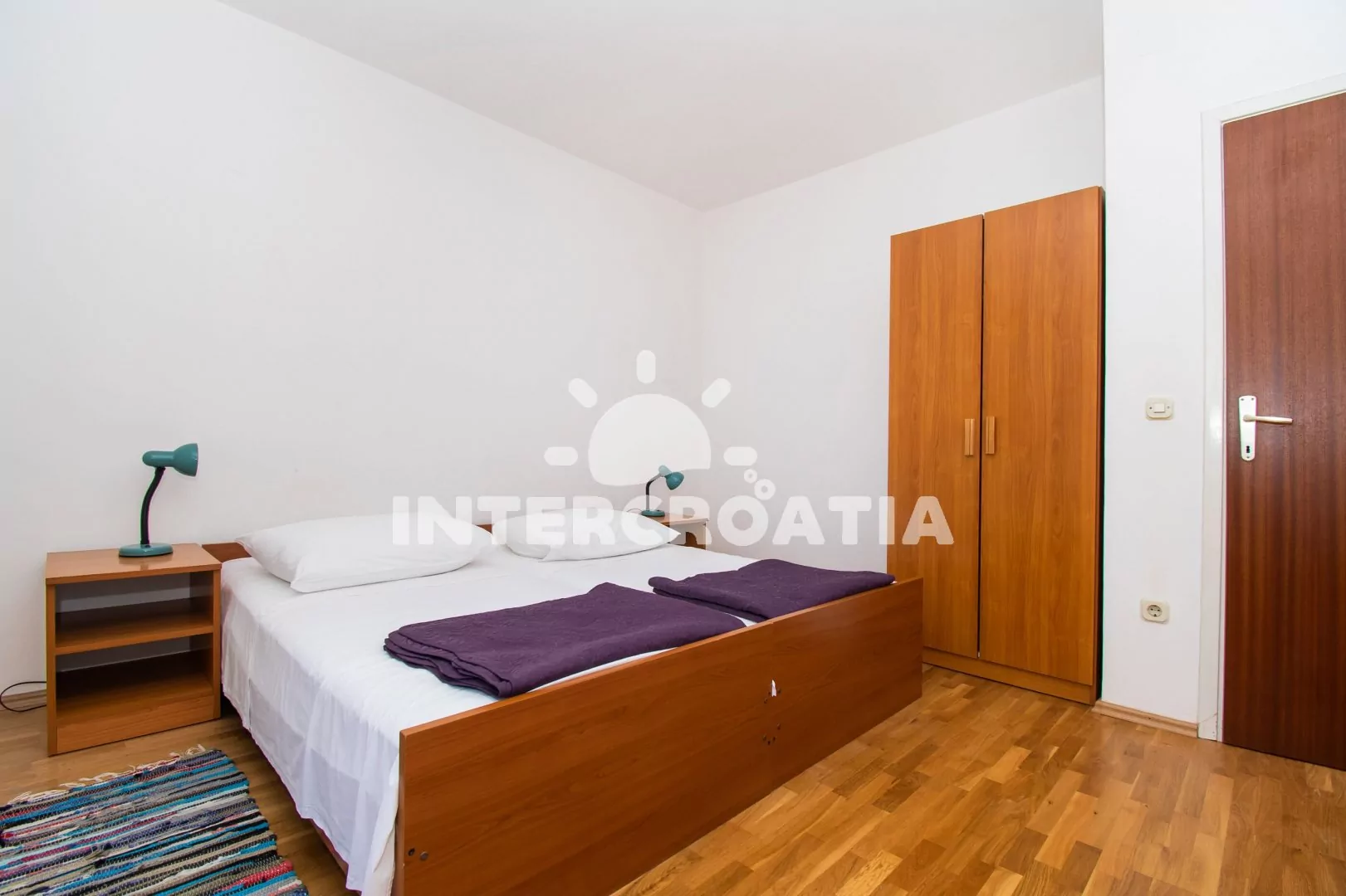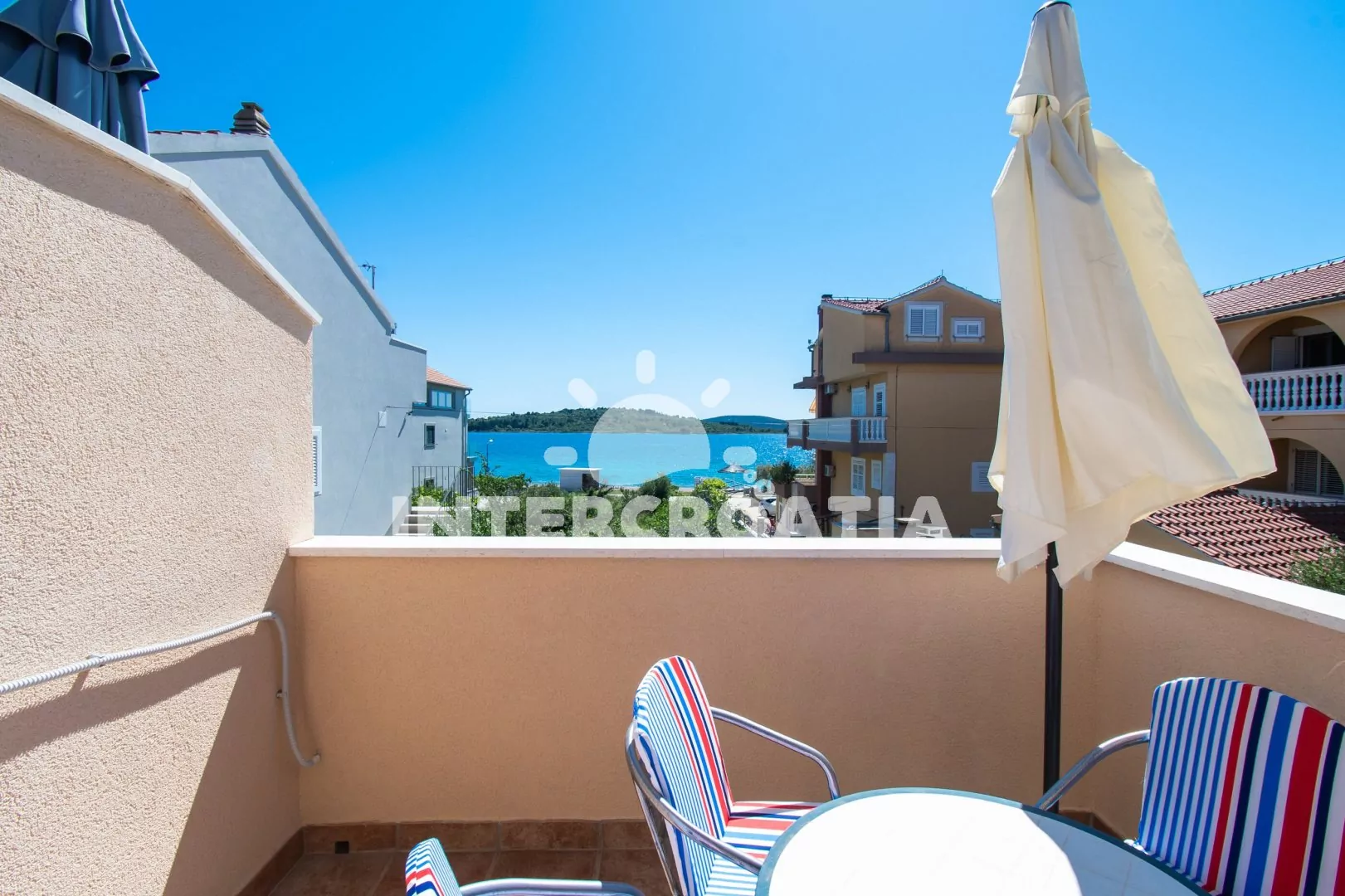 Apartmán (60 m2) s terasou, venkovním posezením a výhledem na moře se nachází v 1. patře domu. Apartmán má 2 ložnice a je vhodný pro 4 až 5 osob. Obývací pokoj je spojený s kuchyní. Kuchyňská linka je vybavena sporákem s troubou, nádobím a lednicí s mrazákem. Obývací pokoj s jídelním stolem, sedací soupravou s pohovkou (rozložitelná na extra lůžko pro 1 osobu), televizí, klimatizací a vstupem na terasu. První ložnice s dvoulůžkem a vstupem na terasu. Druhá ložnice s jedním dvoulůžkem. Koupelna se sprchovým koutem, umyvadlem a wc. Hostům je k dispozici parkování u objektu zdarma.