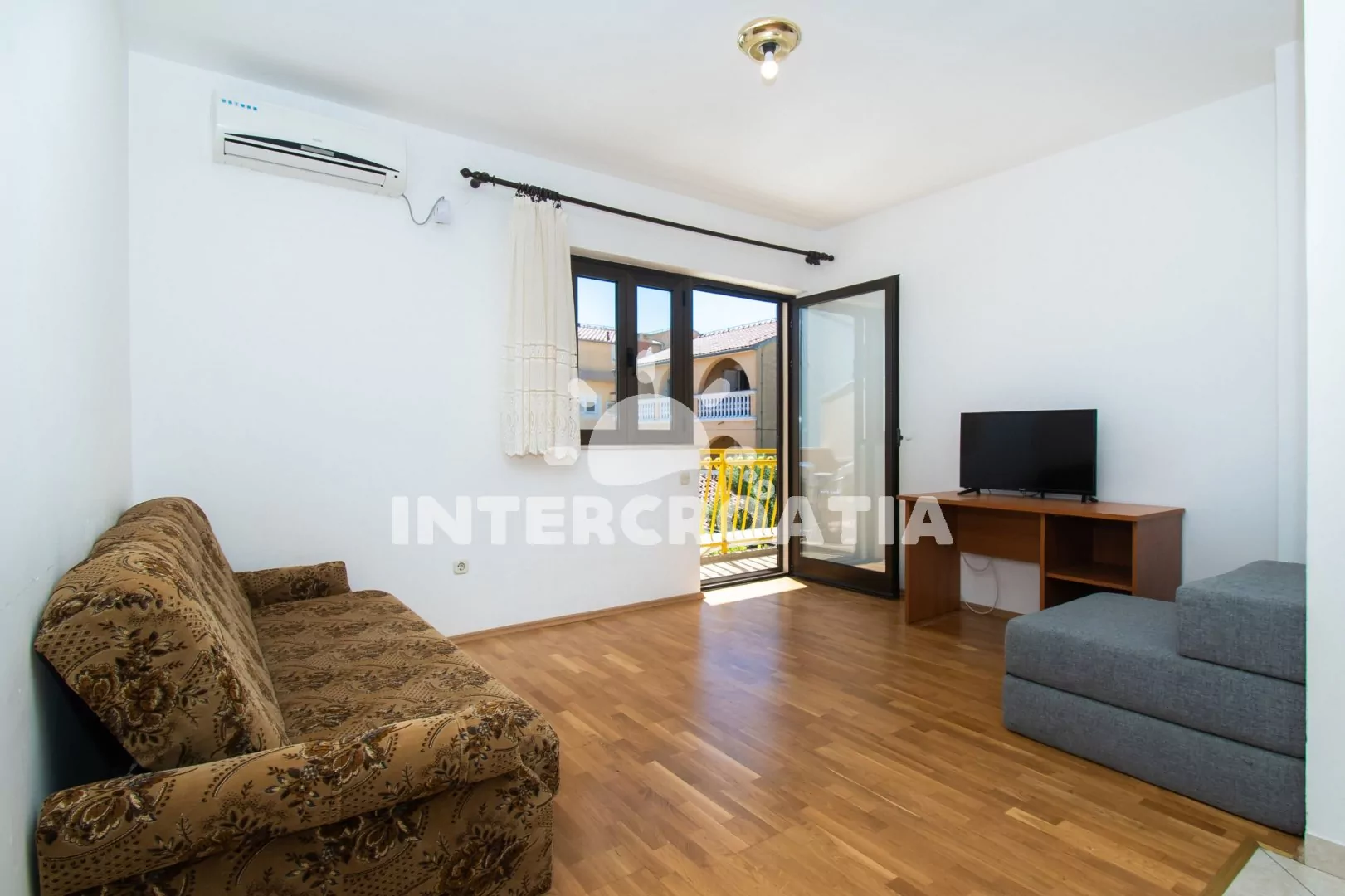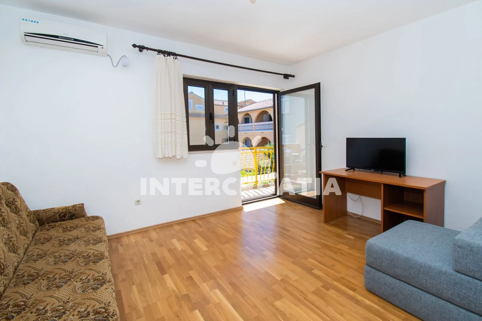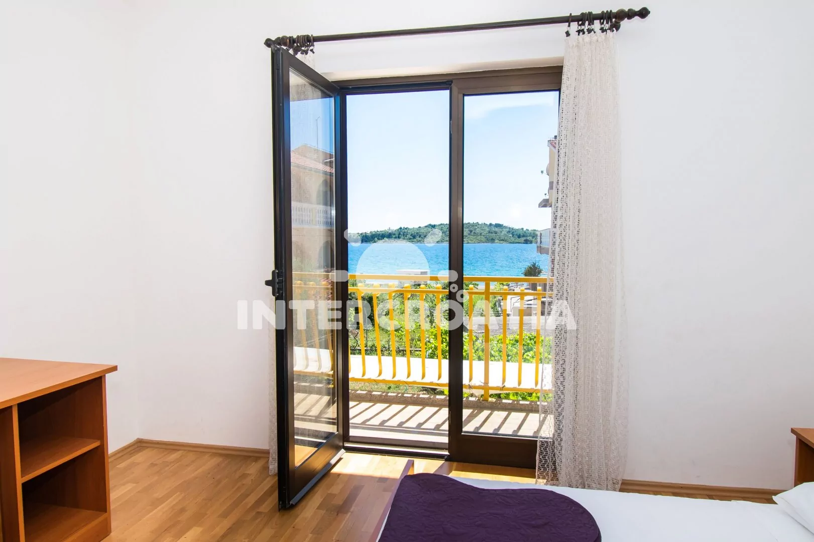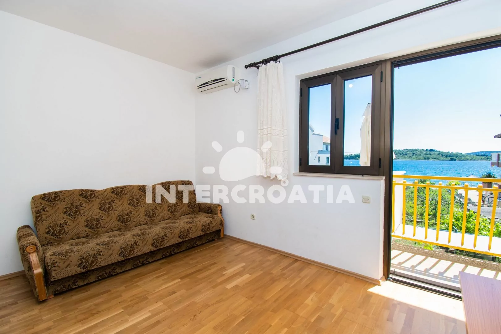 Apartmán (60 m2) s terasou, venkovním posezením a výhledem na moře se nachází v 1. patře domu. Apartmán má 2 ložnice a je vhodný pro 4 až 5 osob. Obývací pokoj je spojený s kuchyní. Kuchyňská linka je vybavena sporákem s troubou, nádobím a lednicí s mrazákem. Obývací pokoj s jídelním stolem, sedací soupravou s pohovkou (rozložitelná na extra lůžko pro 1 osobu), televizí, klimatizací a vstupem na terasu. První ložnice s dvoulůžkem a vstupem na terasu. Druhá ložnice s jedním dvoulůžkem. Koupelna se sprchovým koutem, umyvadlem a wc. Hostům je k dispozici parkování u objektu zdarma.