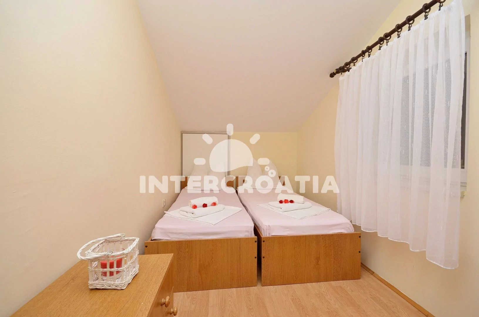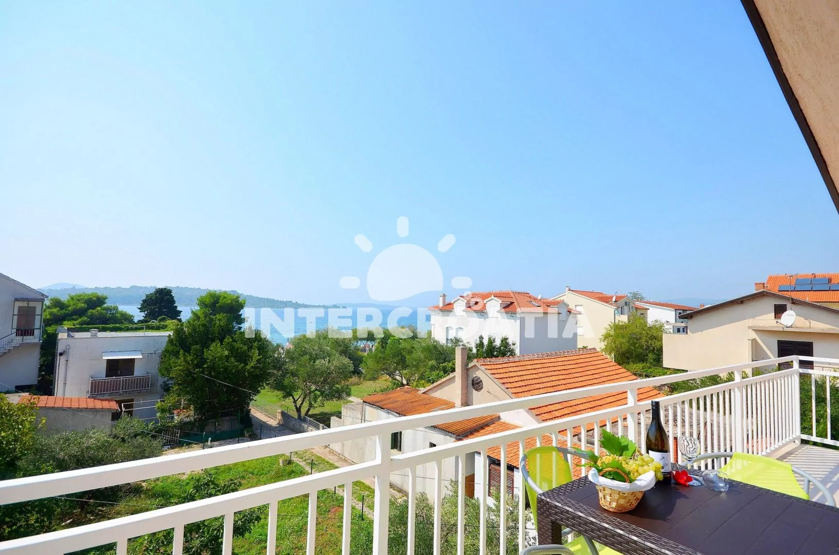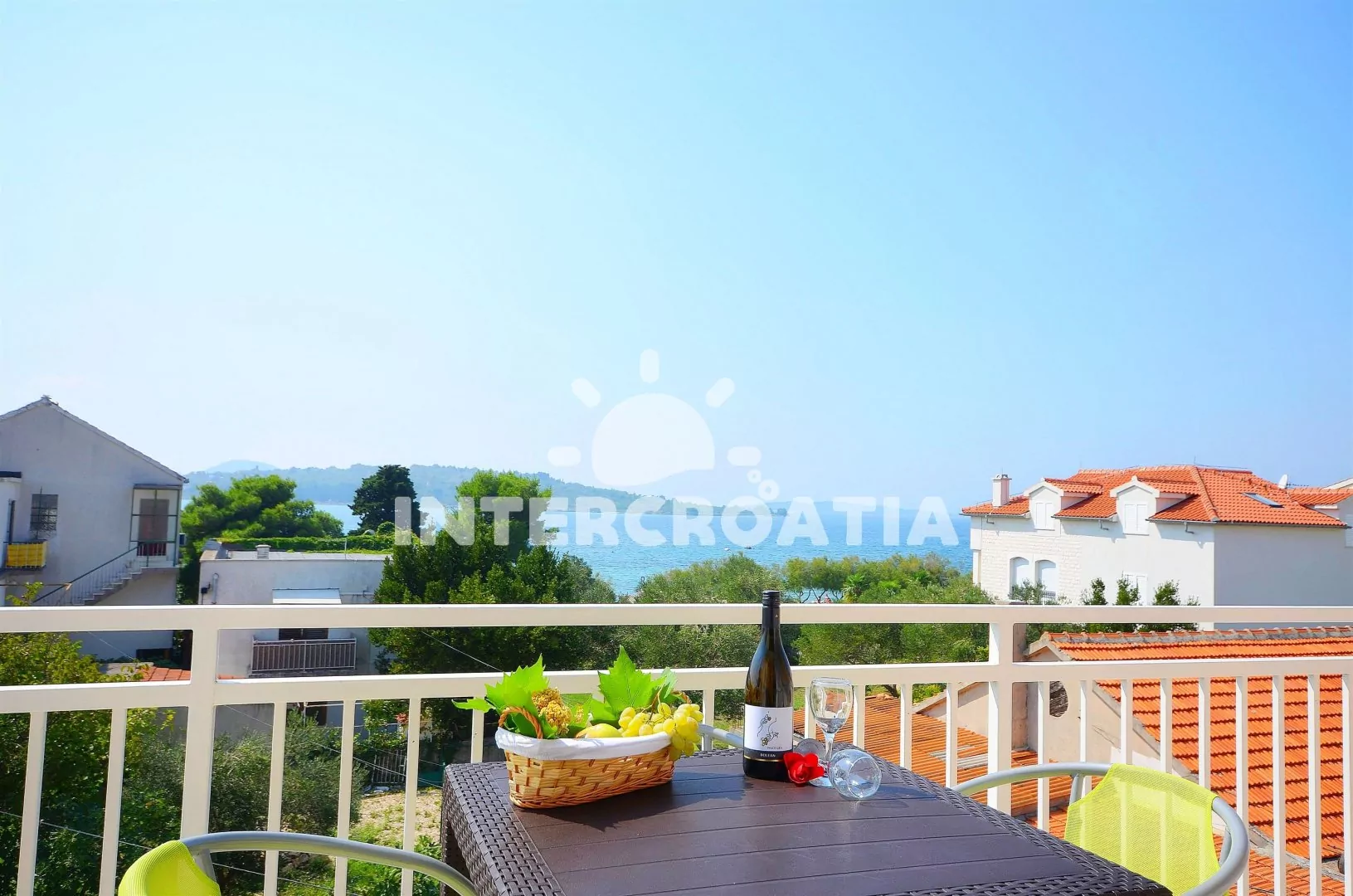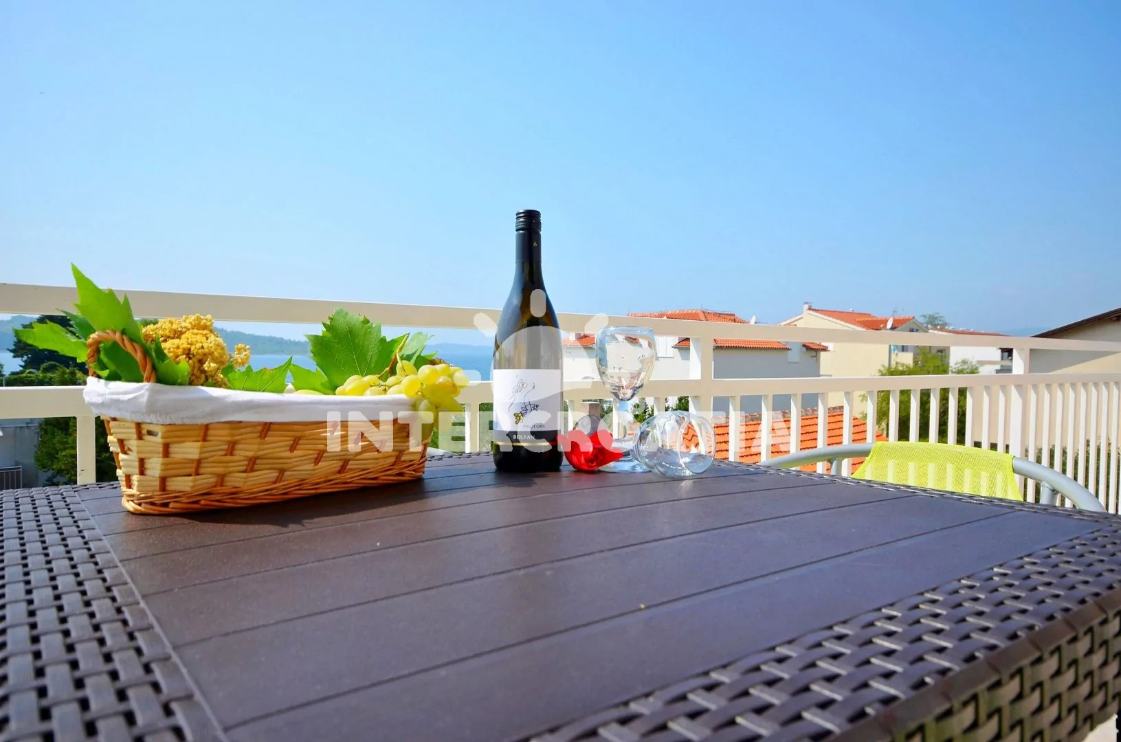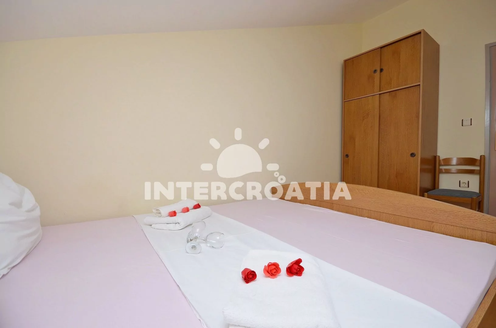 Apartmán (56 m2) s balkonem, posezením a výhledem na moře se nachází ve 2. patře domu. Apartmán má 2 ložnice a je vhodný pro 4 až 5 osob. Obývací pokoj je spojený s kuchyní. Kuchyňská linka je vybavena varnou deskou, myčkou na nádobí, rychlovarnou konvicí, kávovarem, nádobím a lednicí s mrazákem. Obývací pokoj s jídelním stolem, pohovkou (rozložitelná na extra lůžko pro 1 osobu), televizí, klimatizací a vstupem na balkon. První ložnice s jedním dvoulůžkem. Druhá ložnice s dvěma jednolůžky. Koupelna se sprchovým koutem, umyvadlem, fénem a wc. Hostům je k dispozici parkování u objektu zdarma.