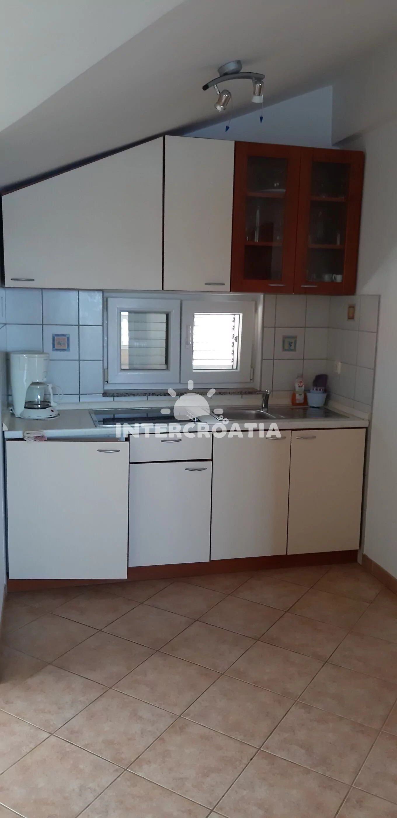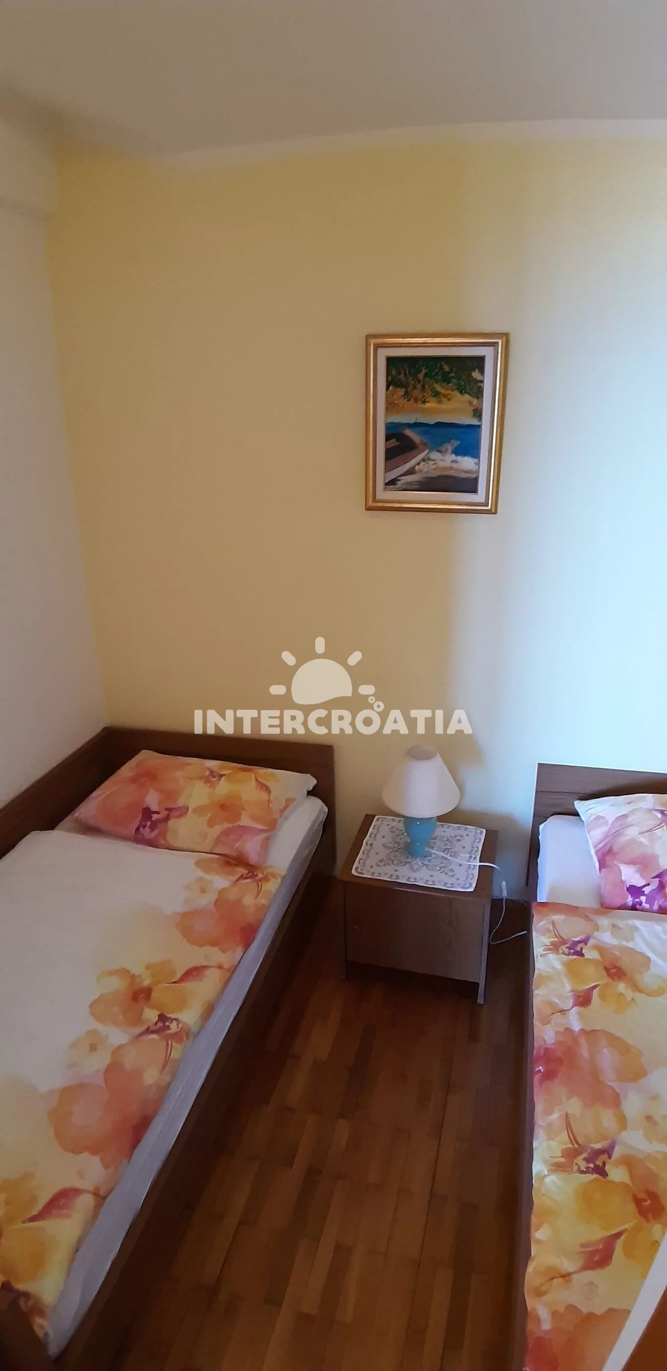 Apartmán (49 m2) s balkonem, venkovním posezením a výhledem na moře. Apartmán má 2 ložnice a je vhodný pro 4 až 5 osob. Obývací pokoj je spojený s kuchyní. Kuchyňská linka je vybavena varnou deskou, kávovarem, nádobím a lednicí s mrazákem. Obývací pokoj s jídelním stolem, pohovkou (rozložitelná na extra lůžko pro 1 osobu), televizí se satelitním programem a vstupem na balkon. První ložnice s dvoulůžkem a klimatizací. Druhá ložnice se dvěma jednolůžky. Koupelna se sprchovým koutem, umyvadlem a wc. Hostům je k dispozici parkování u vily zdarma.