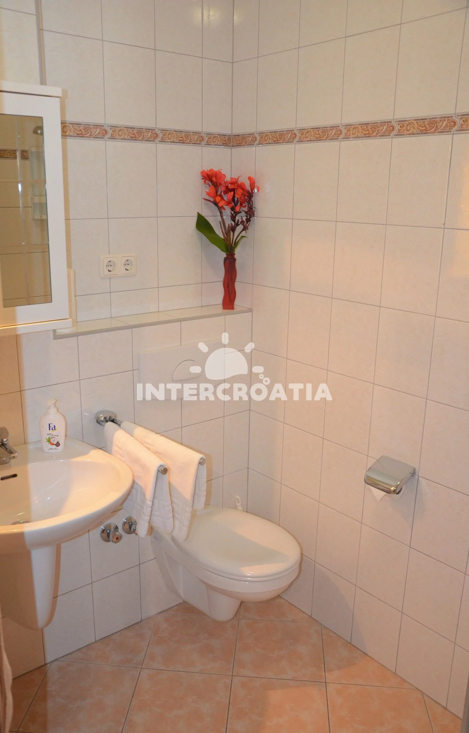 Apartmán (48 m2) s balkonem, venkovním posezením a výhledem na moře se nachází ve 2. patře vily. Apartmán má 2 ložnice a je vhodný pro až 4 osoby. Kuchyň s jídelním stolem, televizí se satelitním programem, klimatizací a kuchyňskou linkou. Kuchyňská linka je vybavena varnou deskou, kávovarem, nádobím a lednicí s mrazákem. První i druhá ložnice je vybavena vždy s jedním dvoulůžkem. Koupelna se sprchovým koutem, umyvadlem a wc. Hostům je k dispozici parkování u vily zdarma.