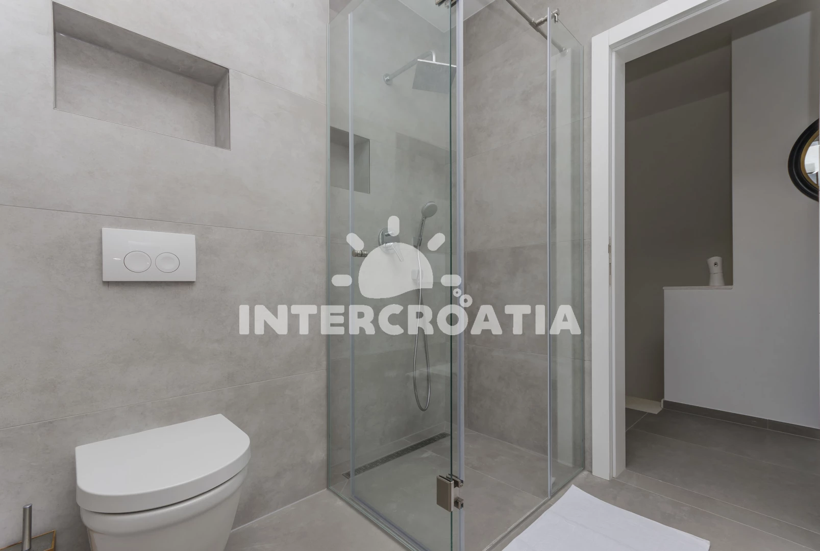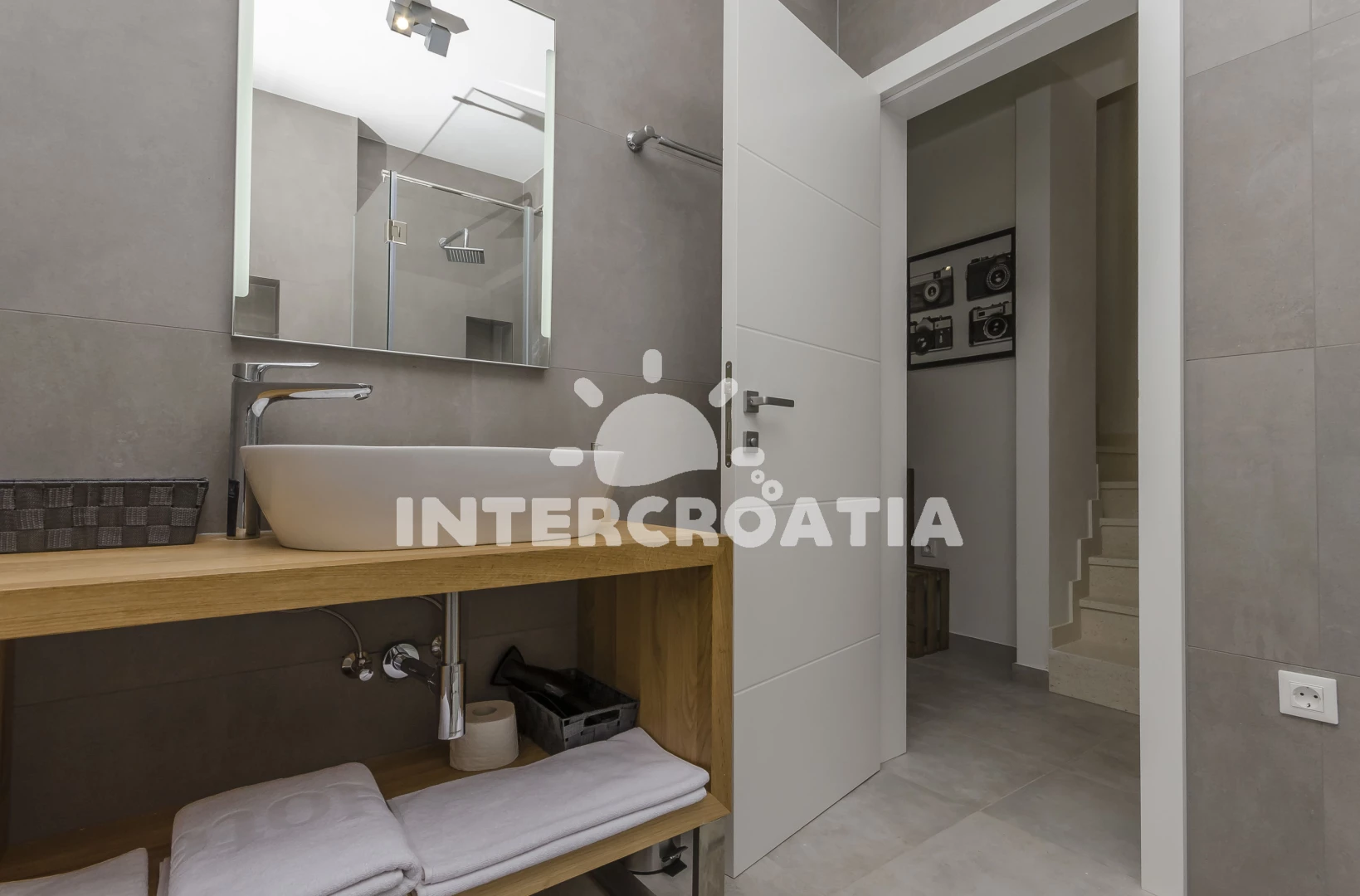 Apartmán (80 m2) s terasou, s balkonem. Nachází se ve dvou patrech objektu. Apartmán má 2 ložnice a je vhodný pro až 6 osob. Kuchyňská linka je vybavena varnou deskou, troubou, kávovarem, mikrovlnnou troubou, rychlovarnou konvicí, nádobím, lednicí, mrazákem. V obývací místnosti je rozložitelná pohovka (extra lůžko pro 2 osoby). K dispozici televize, sejf, žehlička. První ložnice s dvoulůžkem. Druhá ložnice s dvoulůžkem. První koupelna se sprchovým koutem, umyvadlem, fénem a WC. Druhá koupelna se sprchovým koutem, umyvadlem, fénem a WC.