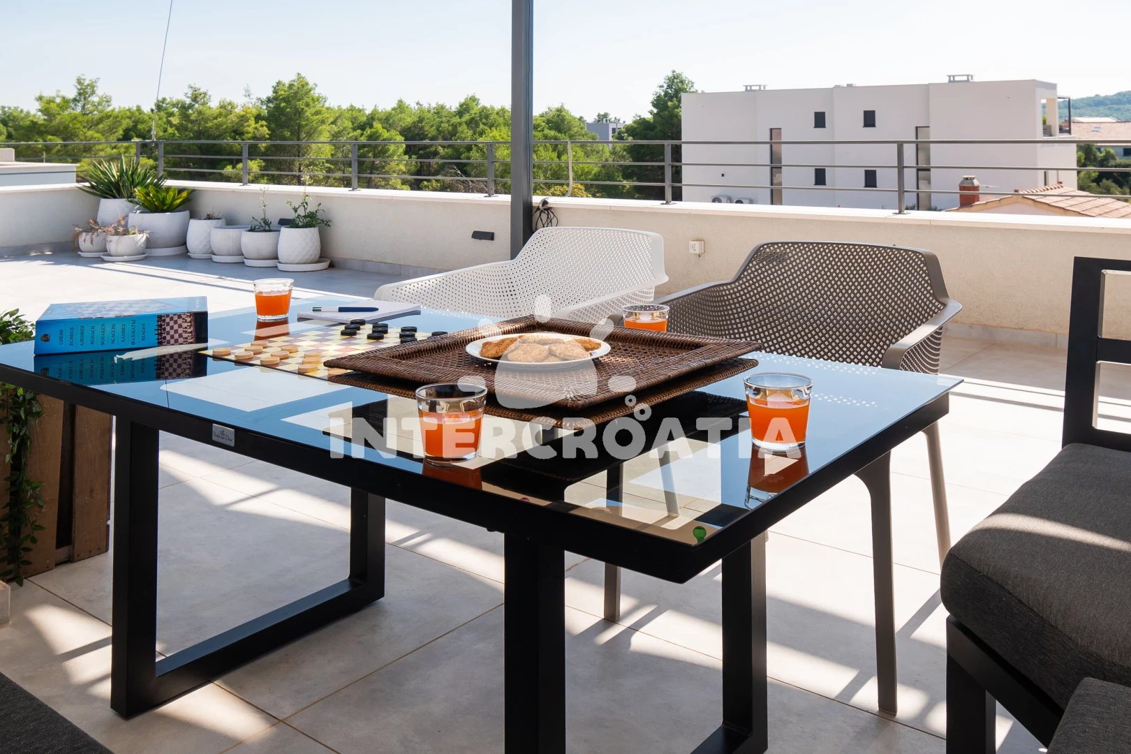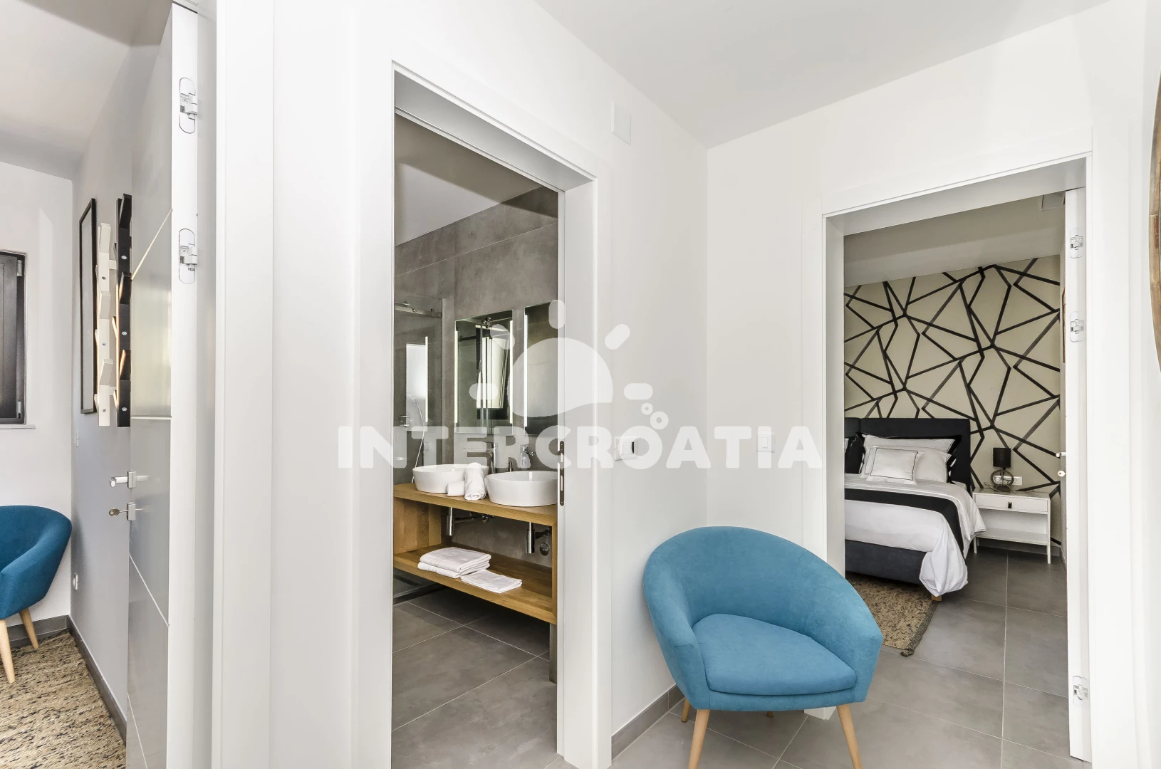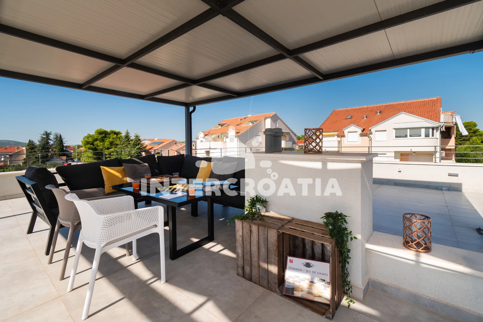 Apartmán (80 m2) s terasou. Nachází se v 1. patře objektu. Apartmán má 2 ložnice a je vhodný pro až 6 osob. Kuchyňská linka je vybavena varnou deskou, troubou, kávovarem, myčkou na nádobí, mikrovlnnou troubou, rychlovarnou konvicí, nádobím, lednicí, mrazákem. V obývací místnosti je rozložitelná pohovka (extra lůžko pro 2 osoby). K dispozici televize, sejf, žehlička. První ložnice s dvoulůžkem. Druhá ložnice s dvoulůžkem. První koupelna se sprchovým koutem, umyvadlem, fénem a WC. Druhá koupelna se sprchovým koutem, umyvadlem, fénem a WC.