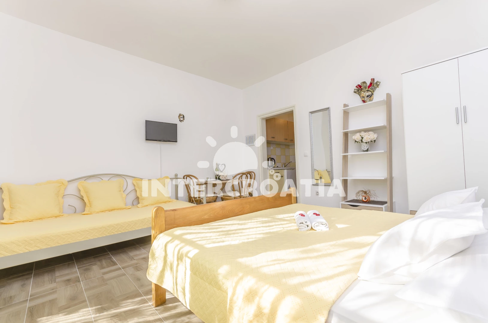 Apartmán typu studio (25 m2) s terasou. Nachází se v přízemí objektu. Kuchyňská linka je vybavena varnou deskou, rychlovarnou konvicí, nádobím, lednicí, mrazákem. K dispozici televize, žehlička.…