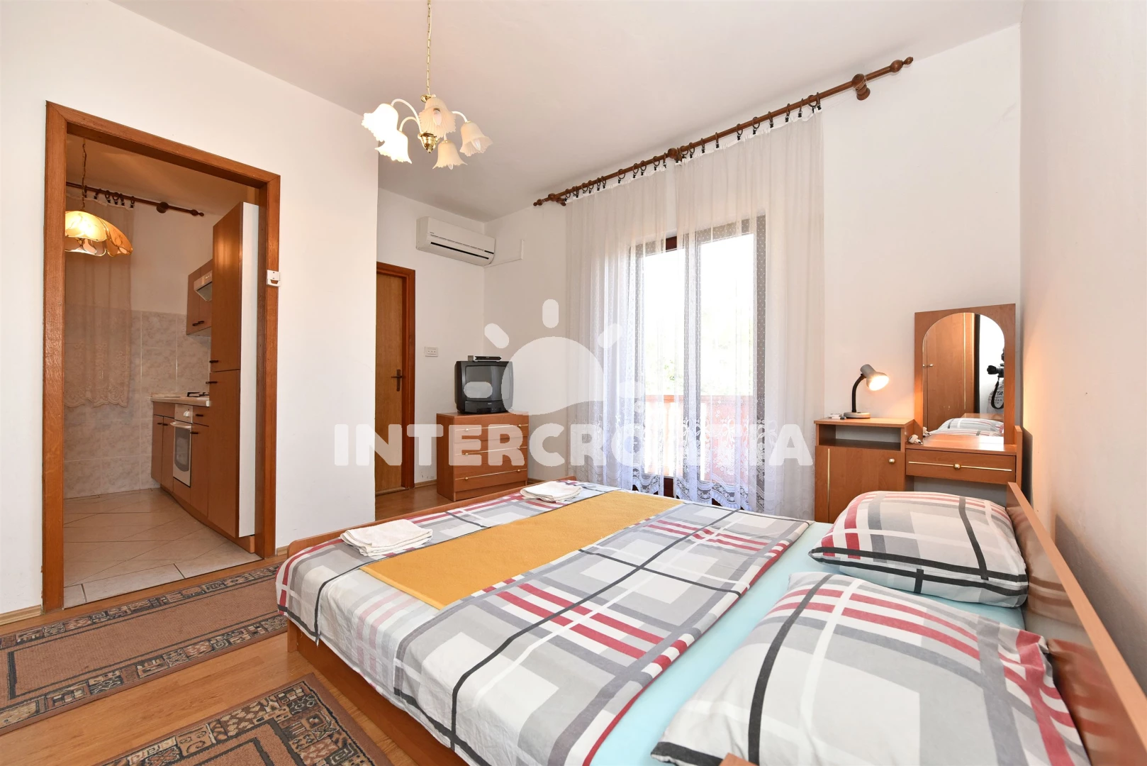 Apartmán (2) s balkonem. Nachází se v objektu. Kuchyňská linka je vybavena varnou deskou, nádobím, lednicí. K dispozici dvoulůžko, televize.
